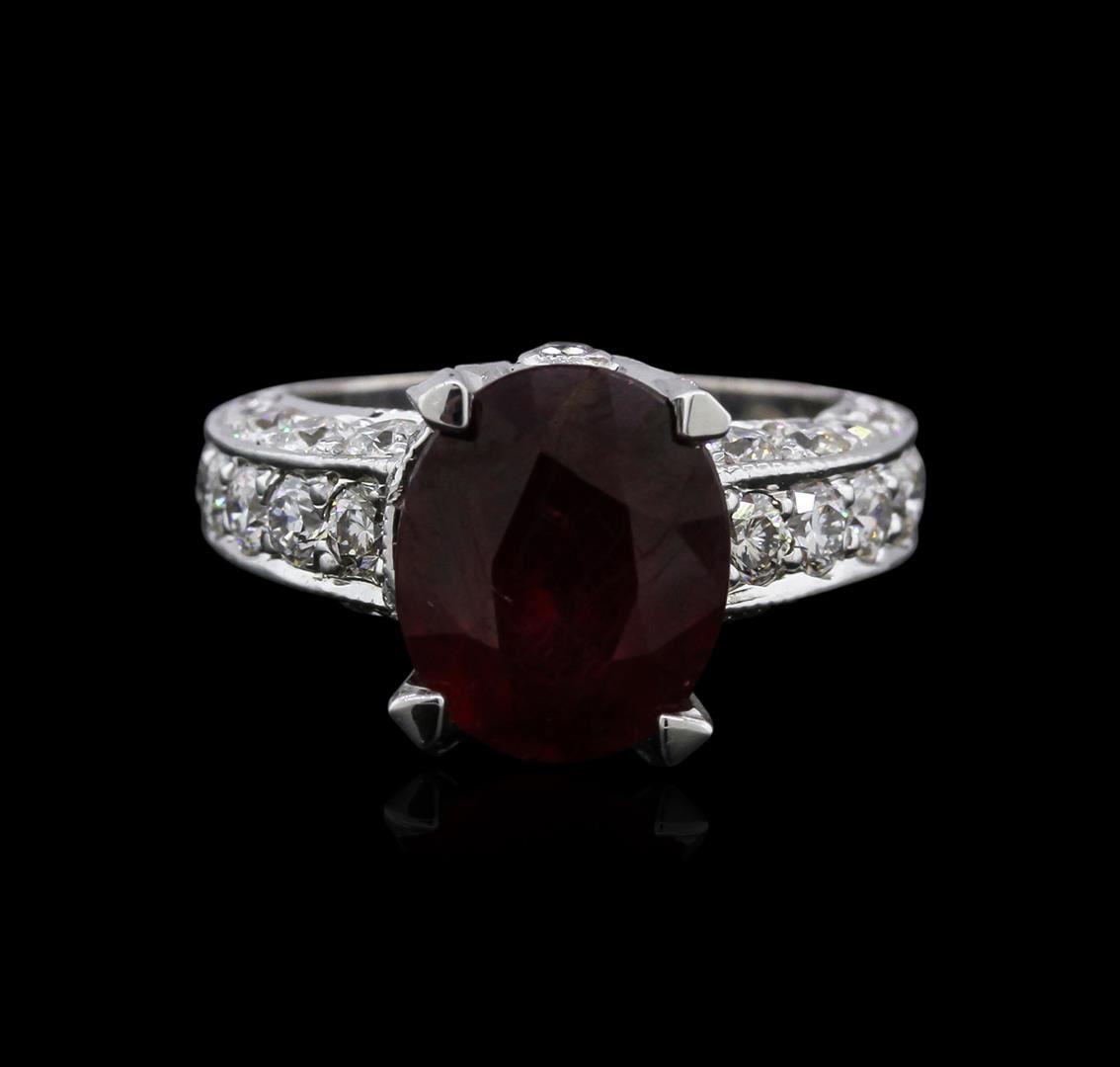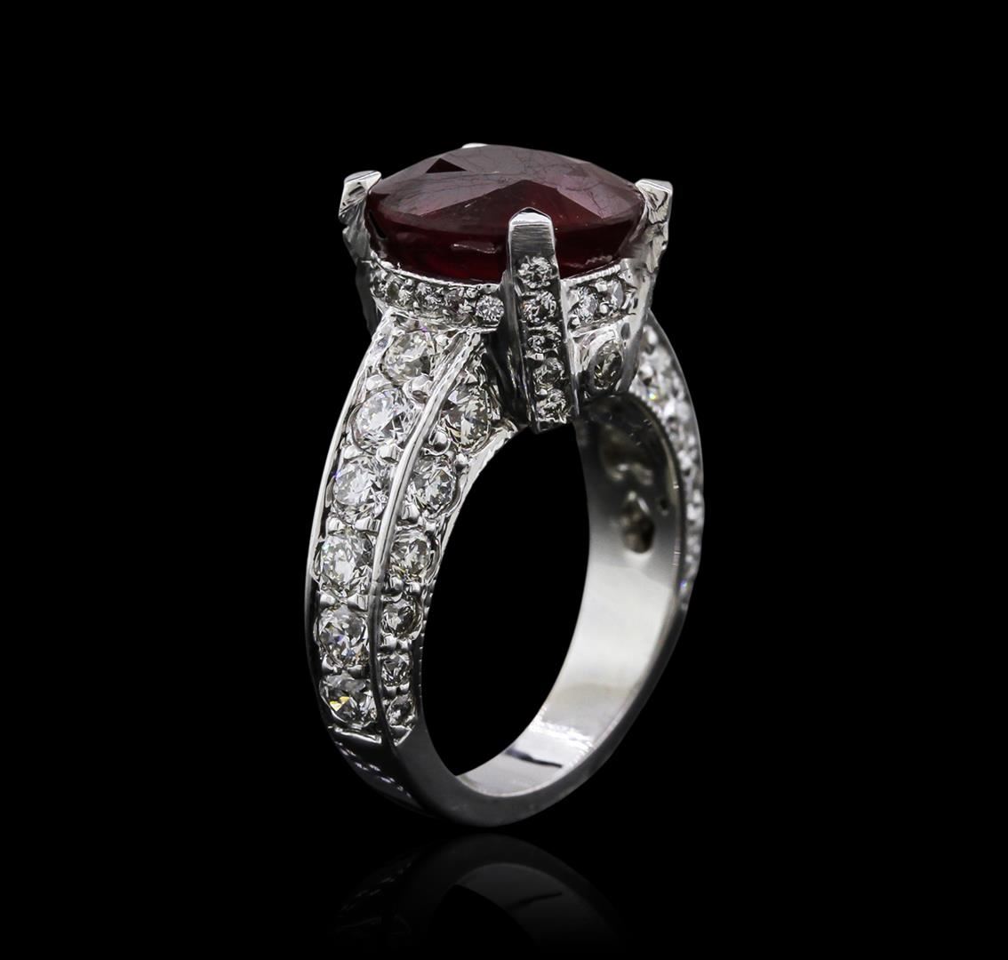 One electronically tested 18KT white gold ladies cast ruby and diamond ring with a bright polish finish. Identified with markings of "18K". Condition is new. Containing: One prong set oval modified brilliant cut natural ruby, measuring 11.00 x 9.00 x 5.86mm, approximate weight of 4.87ct., clarity is heavily included, type II, medium dark, moderately strong, strongly purplish red color, (GIA stpR 6/4), cut is good. Seventy-Two prong set round brilliant cut diamonds, measuring 2.50 - 1.30 x 1.14mm (depth est.) approximate. Total Weight of 72 Stones = 1.81ct. Clarity: SI-1 to SI-2. Color: I - J, Cut is Good. Colored gemstones are presumed to have been subjected to commonly used enhancement processes. All diamonds and colored gemstones are graded in the mounting, unless otherwise stated. Total Weight of Colored Stones 4.87ct. Total Weight of Diamonds 1.81ct. Total Weight of Ring 8.30 grams. GGL Appraised at $6,020.00.