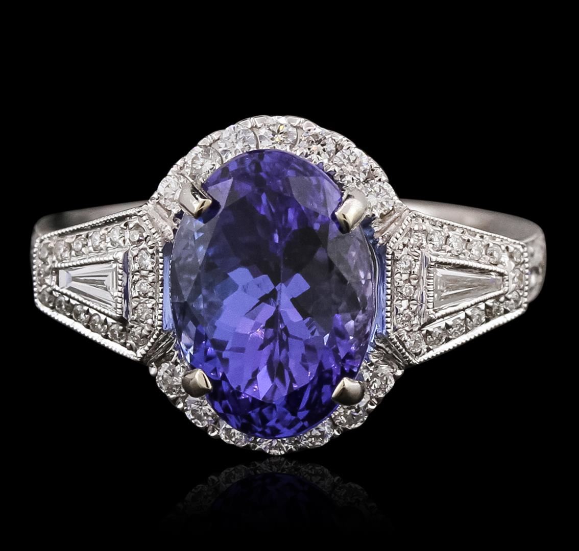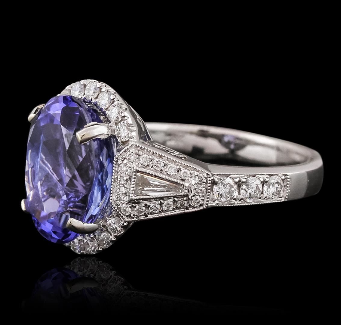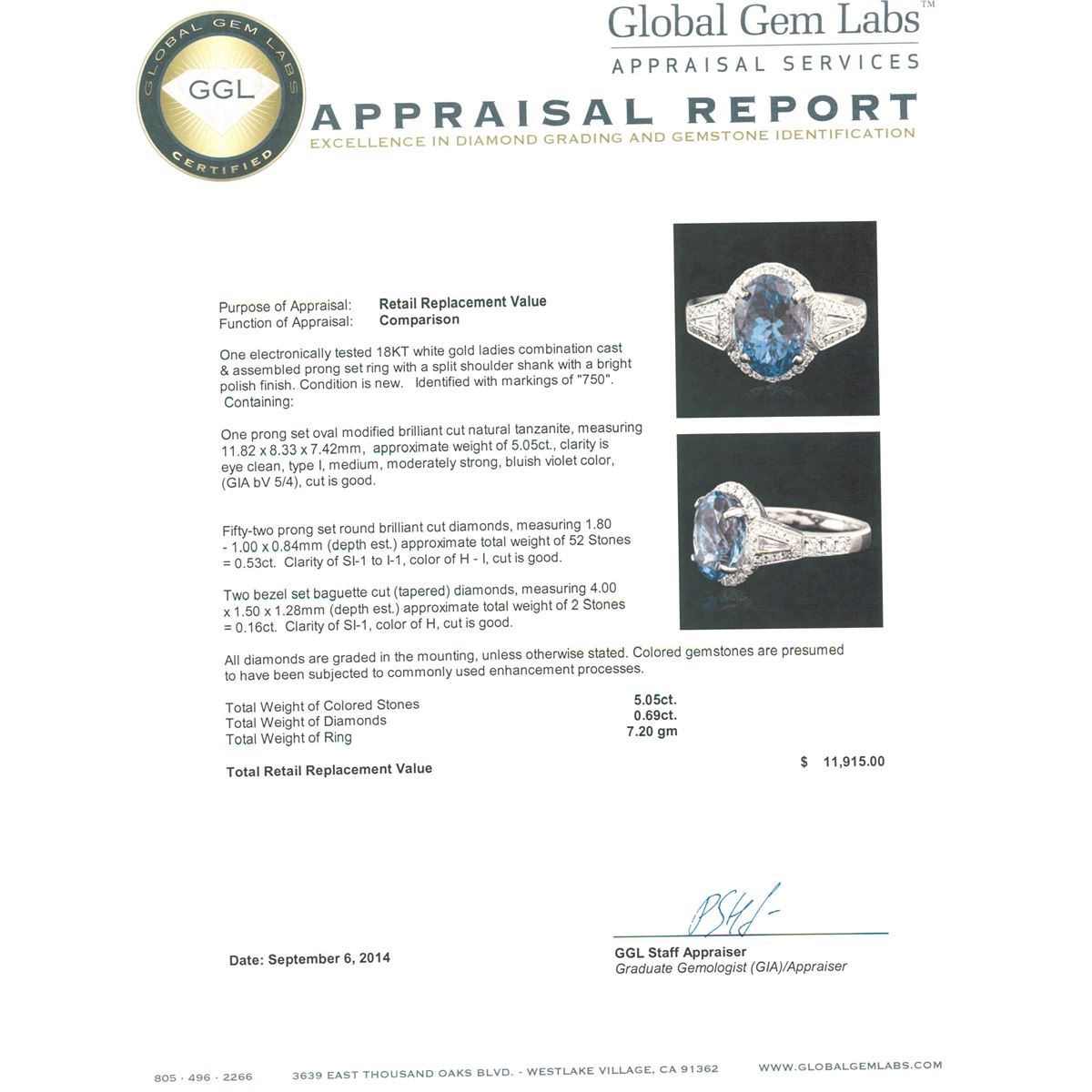 One electronically tested 18KT white gold ladies combination cast & assembled prong set ring with a split shoulder shank with a bright polish finish. Identified with markings of "750". Condition is new. Containing: One prong set oval modified brilliant cut natural tanzanite, measuring 11.82 x 8.33 x 7.42mm, approximate weight of 5.05ct., clarity is eye clean, type I, medium, moderately strong, bluish violet color, (GIA bV 5/4), cut is good. Fifty-Two prong set round brilliant cut diamonds, measuring 1.80 - 1.00 x 0.84mm (depth est.) approximate total weight of 52 Stones = 0.53ct. Clarity: SI-1 to I-1. Color: H - I, Cut is Good. Two bezel set baguette cut (tapered) diamonds, measuring 4.00 x 1.50 x 1.28mm (depth est.) approximate total weight of 2 Stones = 0.16ct. Clarity: SI-1. Color: H, Cut is Good. All diamonds are graded in the mounting, unless otherwise stated. Colored gemstones are presumed to have been subjected to commonly used enhancement processes. Total Weight of Colored Stones 5.05ct. Total Weight of Diamonds 0.69ct. Total Weight of Ring 7.20 grams. GGL Appraised at $11,915.00.