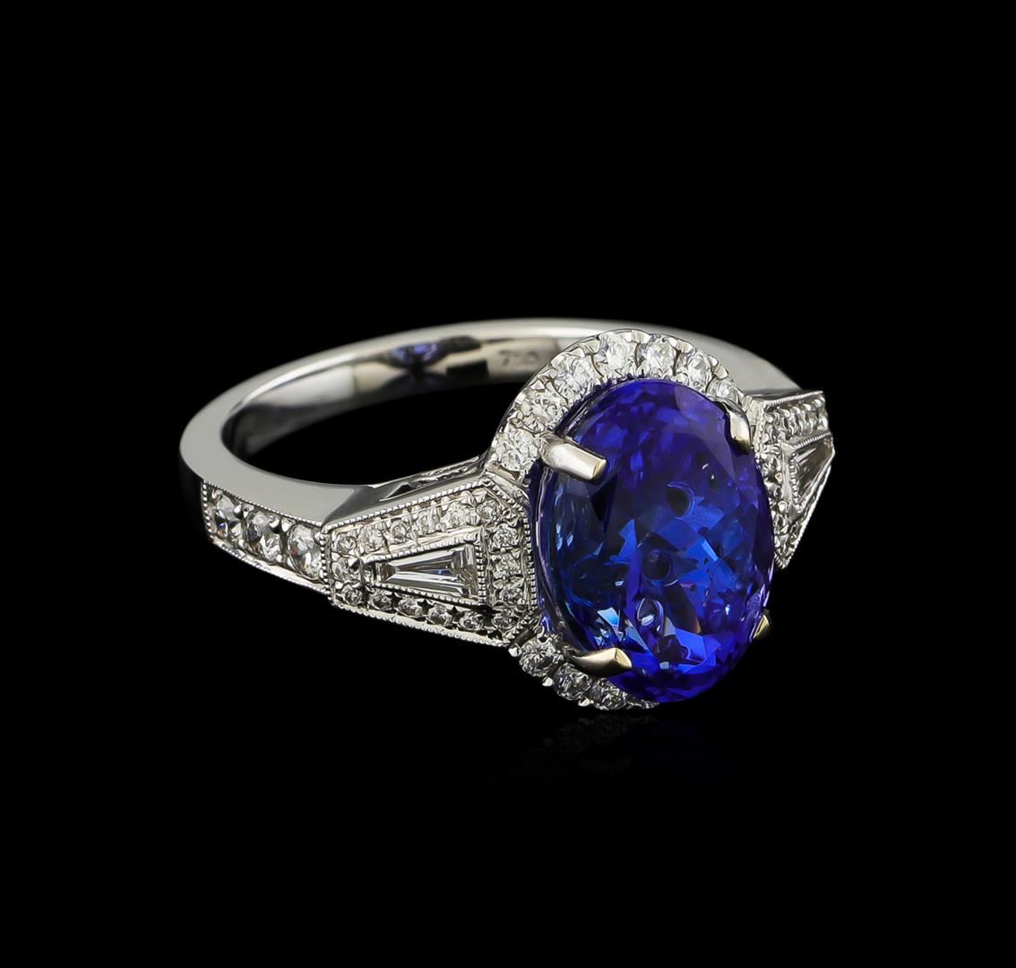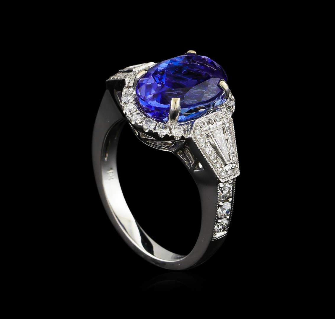 One electronically tested 18KT white gold ladies combination cast & assembled prong set ring with a split shoulder shank with a bright polish finish. Identified with markings of "750". Condition is new. Containing: One prong set oval modified brilliant cut natural tanzanite, measuring 11.82 x 8.33 x 7.42mm, approximate weight of 5.05ct., clarity is eye clean, type I, medium, moderately strong, bluish violet color, (GIA bV 5/4), cut is good. Fifty-Two prong set round brilliant cut diamonds, measuring 1.80 - 1.00 x 0.84mm (depth est.) approximate total weight of 52 Stones = 0.53ct. Clarity: SI-1 to I-1. Color: H - I, Cut is Good. Two bezel set baguette cut (tapered) diamonds, measuring 4.00 x 1.50 x 1.28mm (depth est.) approximate total weight of 2 Stones = 0.16ct. Clarity: SI-1. Color: H, Cut is Good. All diamonds are graded in the mounting, unless otherwise stated. Colored gemstones are presumed to have been subjected to commonly used enhancement processes. Total Weight of Colored Stones 5.05ct. Total Weight of Diamonds 0.69ct. Total Weight of Ring 7.20 grams. GGL Appraised at $11,915.00.
