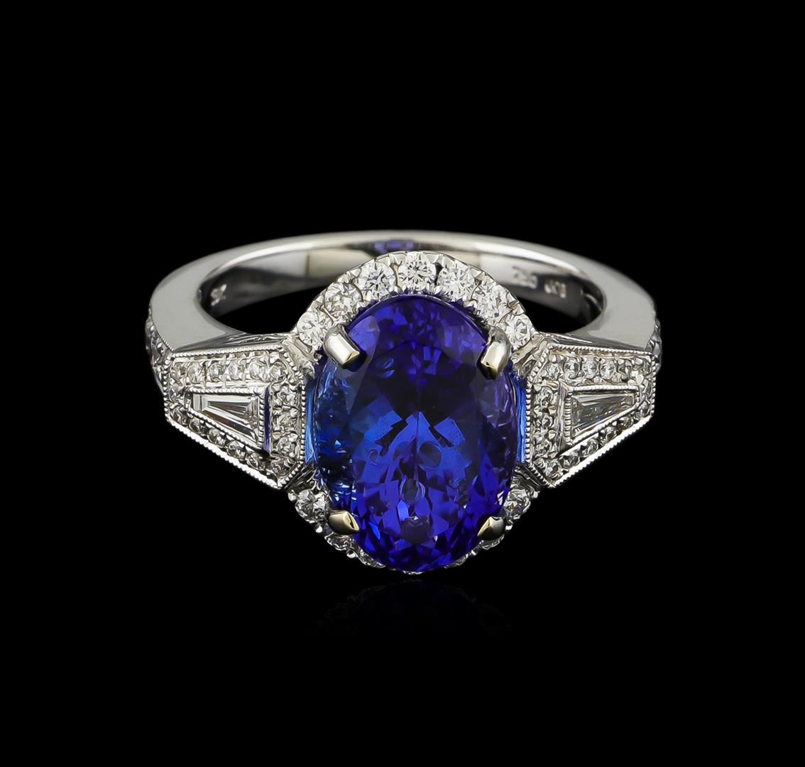 One electronically tested 18KT white gold ladies combination cast & assembled prong set ring with a split shoulder shank with a bright polish finish. Identified with markings of "750". Condition is new. Containing: One prong set oval modified brilliant cut natural tanzanite, measuring 11.82 x 8.33 x 7.42mm, approximate weight of 5.05ct., clarity is eye clean, type I, medium, moderately strong, bluish violet color, (GIA bV 5/4), cut is good. Fifty-Two prong set round brilliant cut diamonds, measuring 1.80 - 1.00 x 0.84mm (depth est.) approximate total weight of 52 Stones = 0.53ct. Clarity: SI-1 to I-1. Color: H - I, Cut is Good. Two bezel set baguette cut (tapered) diamonds, measuring 4.00 x 1.50 x 1.28mm (depth est.) approximate total weight of 2 Stones = 0.16ct. Clarity: SI-1. Color: H, Cut is Good. All diamonds are graded in the mounting, unless otherwise stated. Colored gemstones are presumed to have been subjected to commonly used enhancement processes. Total Weight of Colored Stones 5.05ct. Total Weight of Diamonds 0.69ct. Total Weight of Ring 7.20 grams. GGL Appraised at $11,915.00.