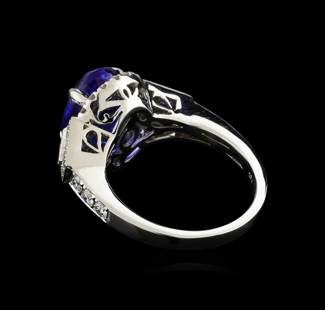One electronically tested 18KT white gold ladies combination cast & assembled prong set ring with a split shoulder shank with a bright polish finish. Identified with markings of "750". Condition is new. Containing: One prong set oval modified brilliant cut natural tanzanite, measuring 11.82 x 8.33 x 7.42mm, approximate weight of 5.05ct., clarity is eye clean, type I, medium, moderately strong, bluish violet color, (GIA bV 5/4), cut is good. Fifty-Two prong set round brilliant cut diamonds, measuring 1.80 - 1.00 x 0.84mm (depth est.) approximate total weight of 52 Stones = 0.53ct. Clarity: SI-1 to I-1. Color: H - I, Cut is Good. Two bezel set baguette cut (tapered) diamonds, measuring 4.00 x 1.50 x 1.28mm (depth est.) approximate total weight of 2 Stones = 0.16ct. Clarity: SI-1. Color: H, Cut is Good. All diamonds are graded in the mounting, unless otherwise stated. Colored gemstones are presumed to have been subjected to commonly used enhancement processes. Total Weight of Colored Stones 5.05ct. Total Weight of Diamonds 0.69ct. Total Weight of Ring 7.20 grams. GGL Appraised at $11,915.00.