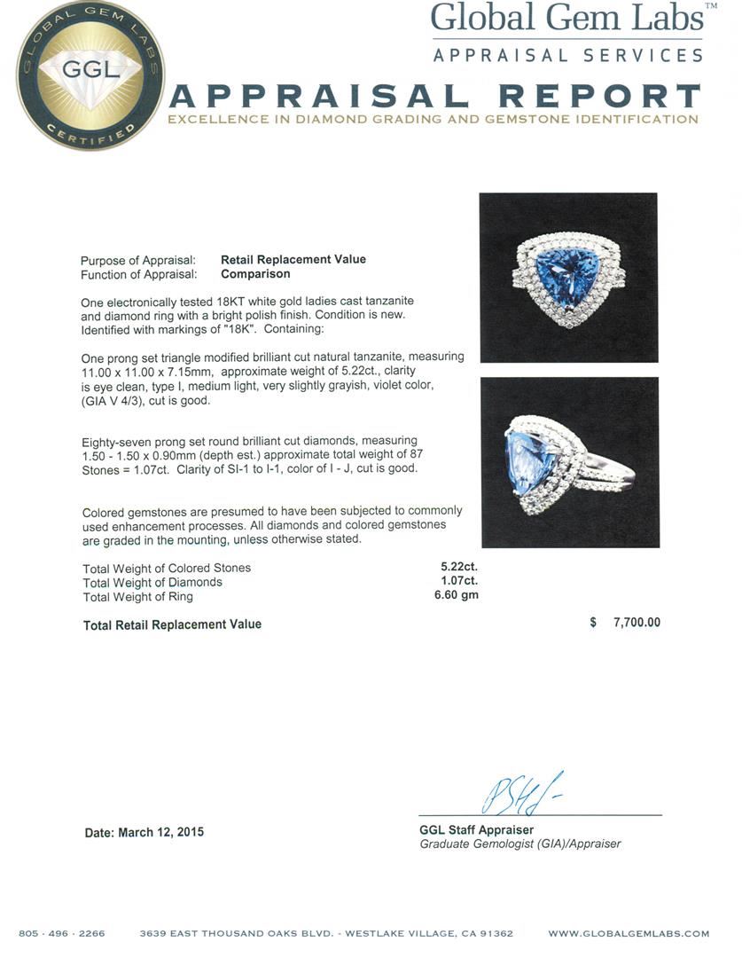 One electronically tested 18KT white gold ladies cast tanzanite and diamond ring with a bright polish finish. Identified with markings of "18K". Condition is new. Containing: One prong set triangle modified brilliant cut natural tanzanite, measuring 11.00 x 11.00 x 7.15mm, approximate weight of 5.22ct., clarity is eye clean, type I, medium light, very slightly grayish, violet color, (GIA V 4/3), cut is good. Eighty-Seven prong set round brilliant cut diamonds, measuring 1.50 - 1.50 x 0.90mm (depth est.) approximate total weight of 87 Stones = 1.07ct. Clarity: SI-1 to I-1. Color: I - J, Cut is Good. Colored gemstones are presumed to have been subjected to commonly used enhancement processes. All diamonds and colored gemstones are graded in the mounting, unless otherwise stated. Total Weight of Colored Stones 5.22ct. Total Weight of Diamonds 1.07ct. Total Weight of Ring 6.60 grams. GGL Appraised at $7,700.00.