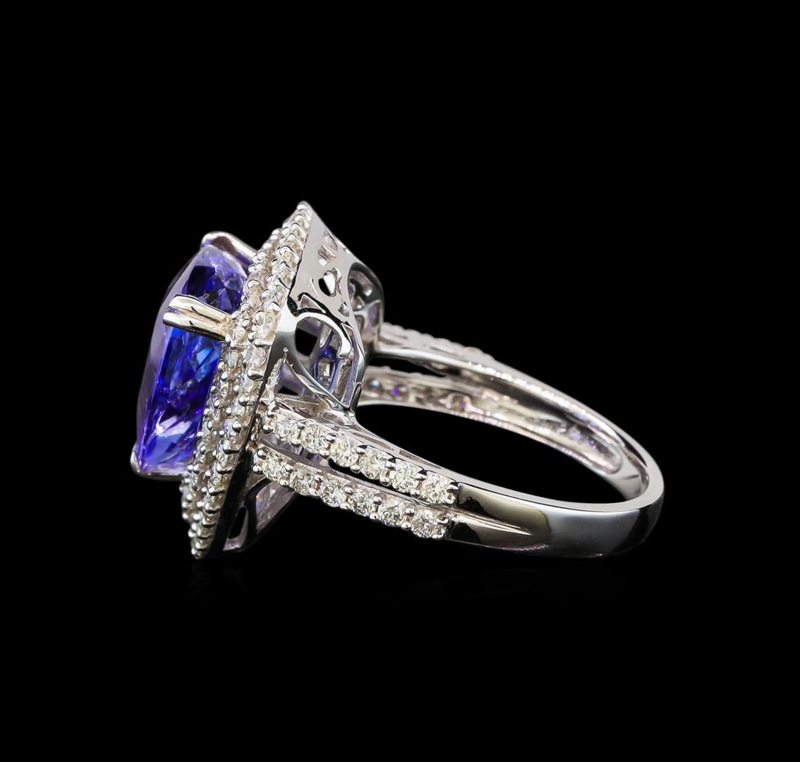 One electronically tested 18KT white gold ladies cast tanzanite and diamond ring with a bright polish finish. Identified with markings of "18K". Condition is new. Containing: One prong set triangle modified brilliant cut natural tanzanite, measuring 11.00 x 11.00 x 7.15mm, approximate weight of 5.22ct., clarity is eye clean, type I, medium light, very slightly grayish, violet color, (GIA V 4/3), cut is good. Eighty-Seven prong set round brilliant cut diamonds, measuring 1.50 - 1.50 x 0.90mm (depth est.) approximate total weight of 87 Stones = 1.07ct. Clarity: SI-1 to I-1. Color: I - J, Cut is Good. Colored gemstones are presumed to have been subjected to commonly used enhancement processes. All diamonds and colored gemstones are graded in the mounting, unless otherwise stated. Total Weight of Colored Stones 5.22ct. Total Weight of Diamonds 1.07ct. Total Weight of Ring 6.60 grams. GGL Appraised at $7,700.00.