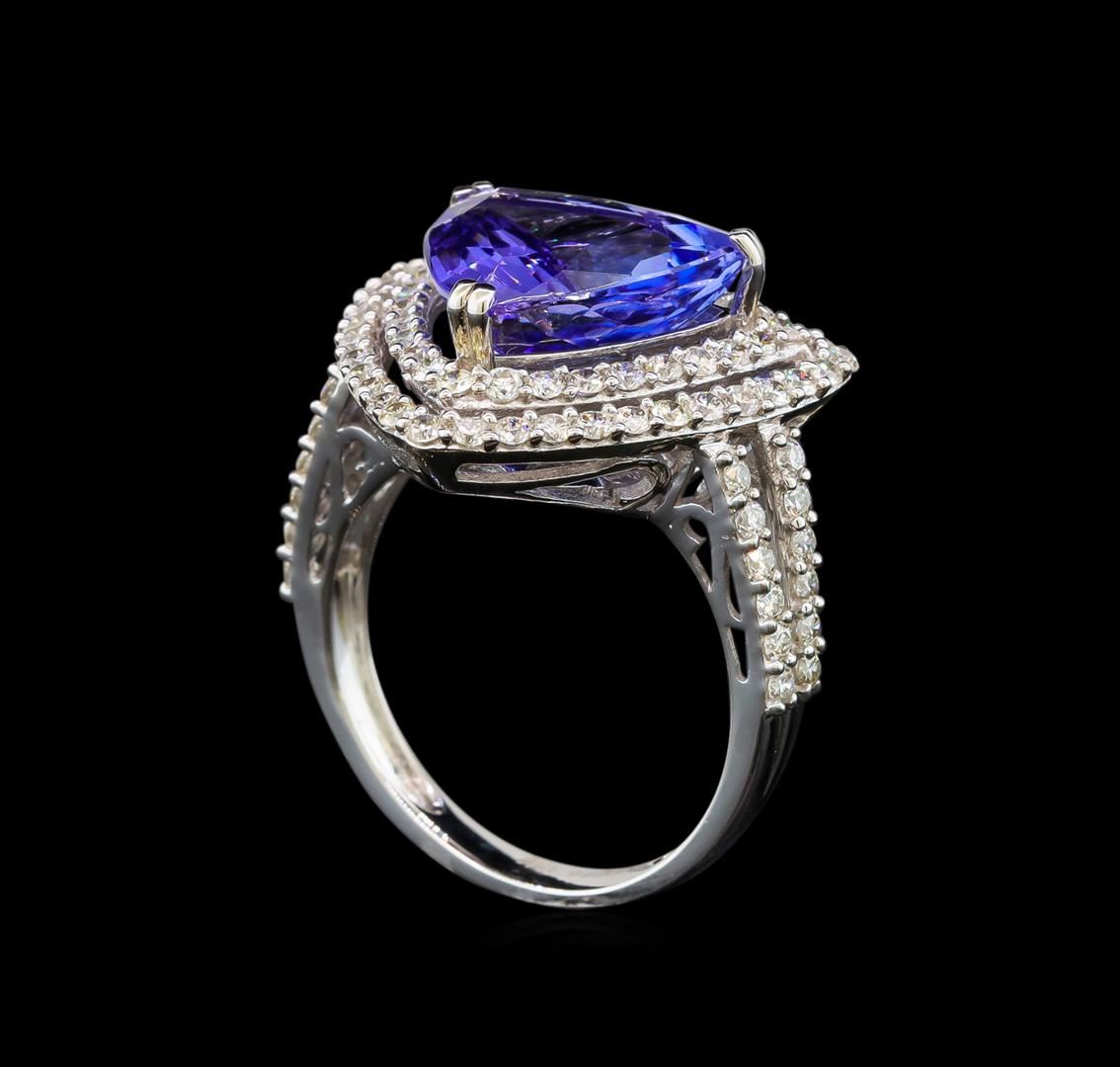 One electronically tested 18KT white gold ladies cast tanzanite and diamond ring with a bright polish finish. Identified with markings of "18K". Condition is new. Containing: One prong set triangle modified brilliant cut natural tanzanite, measuring 11.00 x 11.00 x 7.15mm, approximate weight of 5.22ct., clarity is eye clean, type I, medium light, very slightly grayish, violet color, (GIA V 4/3), cut is good. Eighty-Seven prong set round brilliant cut diamonds, measuring 1.50 - 1.50 x 0.90mm (depth est.) approximate total weight of 87 Stones = 1.07ct. Clarity: SI-1 to I-1. Color: I - J, Cut is Good. Colored gemstones are presumed to have been subjected to commonly used enhancement processes. All diamonds and colored gemstones are graded in the mounting, unless otherwise stated. Total Weight of Colored Stones 5.22ct. Total Weight of Diamonds 1.07ct. Total Weight of Ring 6.60 grams. GGL Appraised.