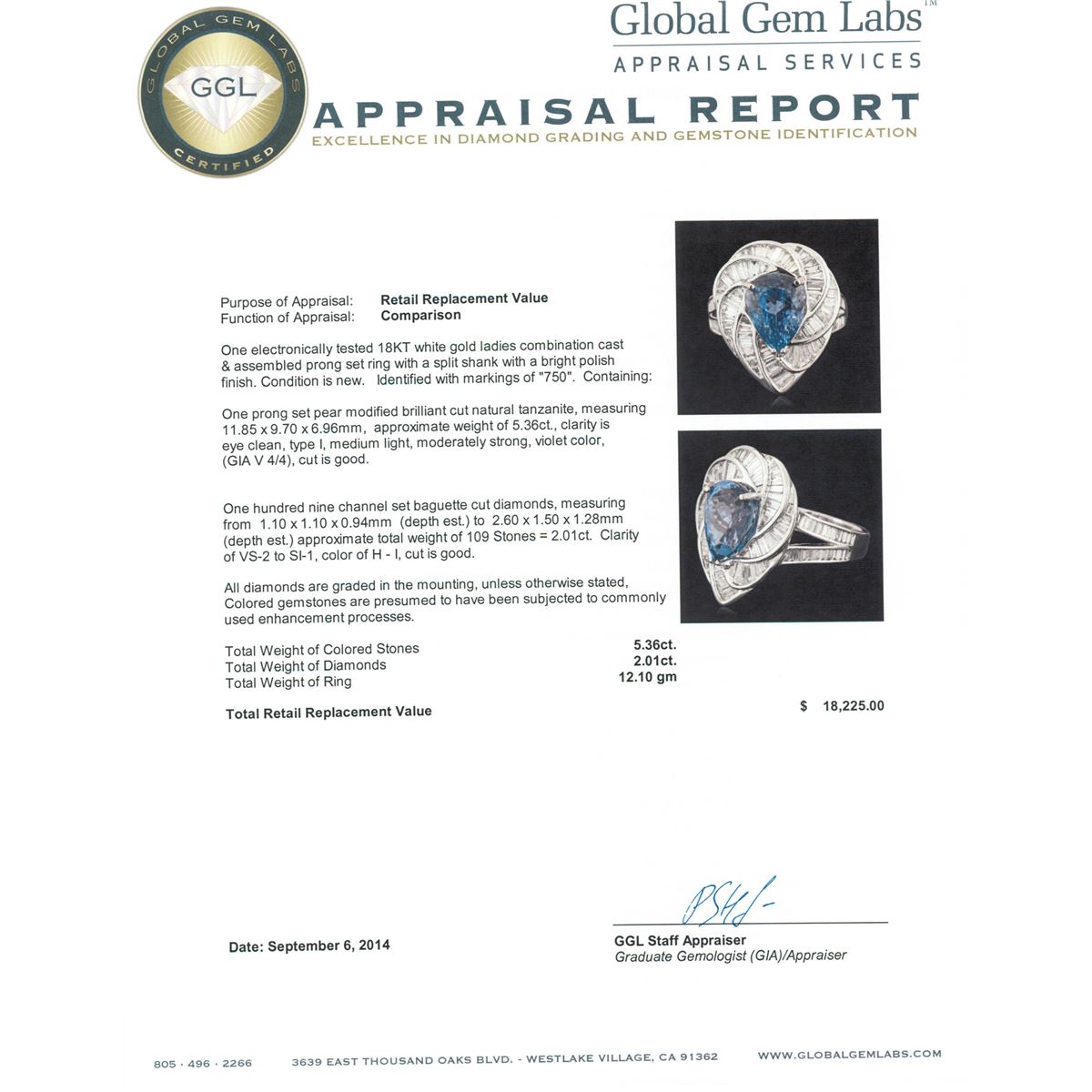 One electronically tested 18KT white gold ladies combination cast & assembled prong set ring with a split shank with a bright polish finish. Identified with markings of "750". Condition is new. Containing: One prong set pear modified brilliant cut natural tanzanite, measuring 11.85 x 9.70 x 6.96mm, approximate weight of 5.36ct., clarity is eye clean, type I, medium light, moderately strong, violet color, (GIA V 4/4), cut is good. One Hundred Nine channel set baguette cut diamonds, measuring from 1.10 x 1.10 x 0.94mm (depth est.) to 2.60 x 1.50 x 1.28mm (depth est.) approximate total weight of 109 Stones = 2.01ct. Clarity: VS-2 to SI-1. Color: H - I, Cut is Good. All diamonds are graded in the mounting, unless otherwise stated, Colored gemstones are presumed to have been subjected to commonly used enhancement processes. Total Weight of Colored Stones 5.36ct. Total Weight of Diamonds 2.01ct. Total Weight of Ring 12.10 grams. GGL Appraised at $18,225.00.