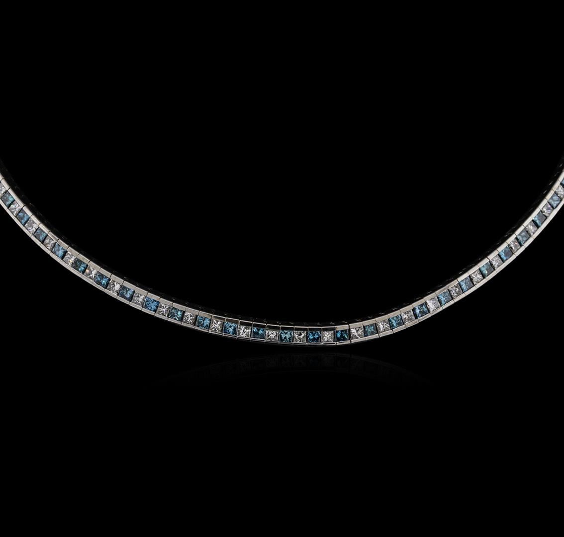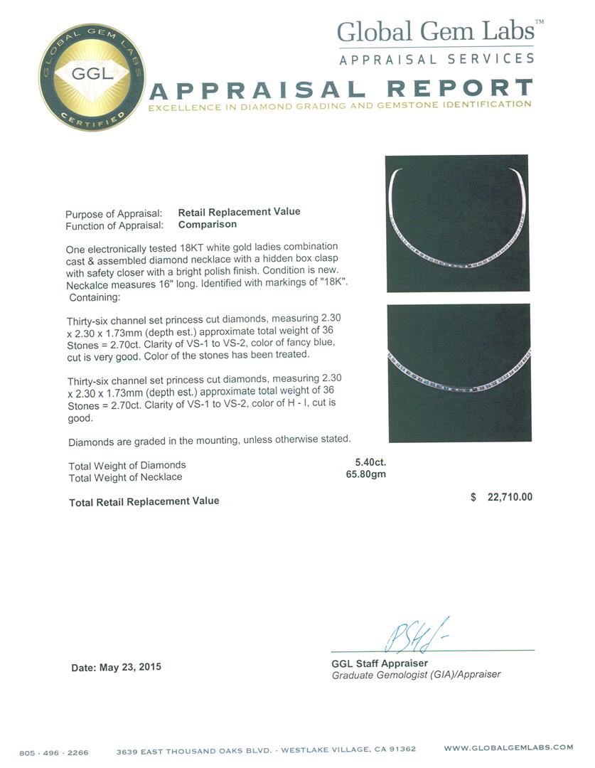 One electronically tested 18KT white gold ladies combination cast & assembled diamond necklace with a hidden box clasp with safety closer with a bright polish finish. Necklace measures 16" long. Identified with markings of "18K". Condition is new. Containing: Thirty-Six channel set princess cut diamonds, measuring 2.30 x 2.30 x 1.73mm (depth est.) approximate total weight of 36 Stones = 2.70ct. Clarity: VS-1 to VS-2, Cut is Very Good. Color of the stones has been treated. Thirty-Six channel set princess cut diamonds, measuring 2.30 x 2.30 x 1.73mm (depth est.) approximate total weight of 36 Stones = 2.70ct. Clarity: VS-1 to VS-2. Color: H - I, Cut is Good. Diamonds are graded in the mounting, unless otherwise stated. Total Weight of Diamonds 5.40ct. Total Weight of Necklace 65.80 grams. GGL Appraised at $22,710.00.