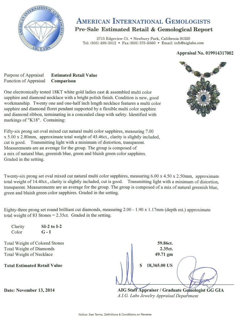 One electronically tested 18KT white gold ladies cast & assembled multi color sapphire and diamond necklace with a bright polish finish. Twenty one and one-half inch length necklace features a multi color sapphire and diamond floret pendant supported by a flexible multi color sapphire and diamond ribbon, terminating in a concealed clasp with safety. Identified with markings of "K18". Condition is new, good workmanship. Containing: Fifty-six prong set oval mixed cut natural multi color sapphires, measuring 7.00 x 5.00 x 2.80mm, approximate total weight of 45.46ct., clarity is slightly included, cut is good. Transmitting light with a minimum of distortion, transparent. Measurements are an average for the group. The group is composed of a mix of natural blue, greenish blue, green and bluish green color sapphires. Graded in the setting. Twenty-six prong set oval mixed cut natural multi color sapphires, measuring 6.00 x 4.50 x 2.50mm, approximate total weight of 14.40ct., clarity is slightly included, cut is good. Transmitting light with a minimum of distortion, transparent. Measurements are an average for the group. The group is composed of a mix of natural greenish blue, green and bluish green color sapphires. Graded in the setting. Eighty-Three prong set round brilliant cut diamonds, measuring 2.00 - 1.90 x 1.17mm (depth est.) approximate total weight of 83 Stones = 2.35ct. Graded in the setting. Clarity: SI-2 to I-2. Color: G - I. Total Weight of Colored Stones 59.86ct. Total Weight of Diamonds 2.35ct. Total Weight of Necklace 49.71 grams. AIG Appraised at $18,365.00.