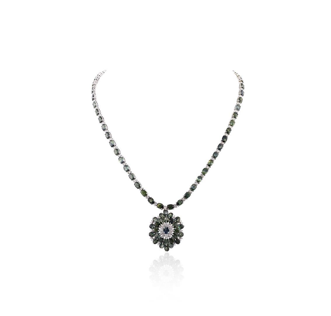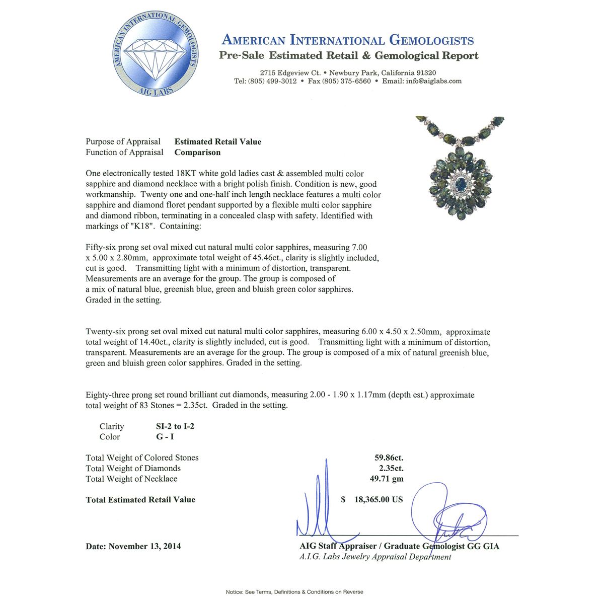 One electronically tested 18KT white gold ladies cast & assembled multi color sapphire and diamond necklace with a bright polish finish. Twenty one and one-half inch length necklace features a multi color sapphire and diamond floret pendant supported by a flexible multi color sapphire and diamond ribbon, terminating in a concealed clasp with safety. Identified with markings of "K18". Condition is new, good workmanship. Containing: Fifty-six prong set oval mixed cut natural multi color sapphires, measuring 7.00 x 5.00 x 2.80mm, approximate total weight of 45.46ct., clarity is slightly included, cut is good. Transmitting light with a minimum of distortion, transparent. Measurements are an average for the group. The group is composed of a mix of natural blue, greenish blue, green and bluish green color sapphires. Graded in the setting. Twenty-six prong set oval mixed cut natural multi color sapphires, measuring 6.00 x 4.50 x 2.50mm, approximate total weight of 14.40ct., clarity is slightly included, cut is good. Transmitting light with a minimum of distortion, transparent. Measurements are an average for the group. The group is composed of a mix of natural greenish blue, green and bluish green color sapphires. Graded in the setting. Eighty-Three prong set round brilliant cut diamonds, measuring 2.00 - 1.90 x 1.17mm (depth est.) approximate total weight of 83 Stones = 2.35ct. Graded in the setting. Clarity: SI-2 to I-2. Color: G - I. Total Weight of Colored Stones 59.86ct. Total Weight of Diamonds 2.35ct. Total Weight of Necklace 49.71 grams. AIG Appraised at $18,365.00.