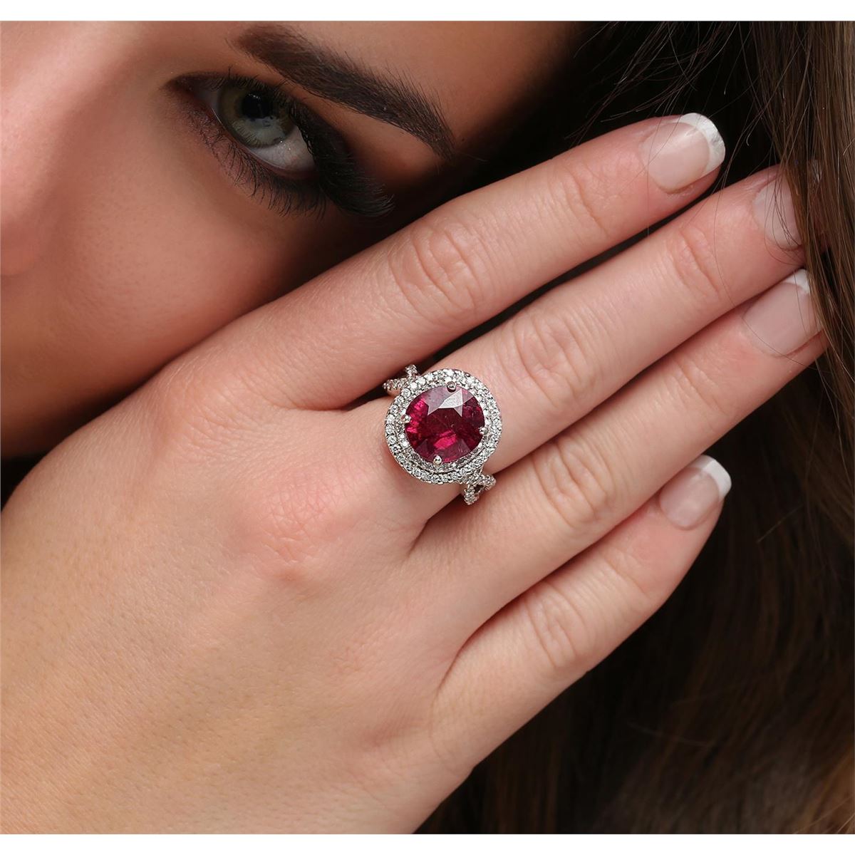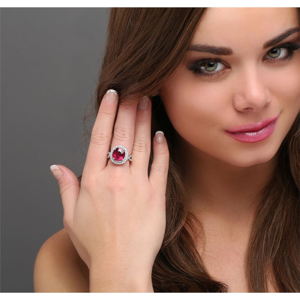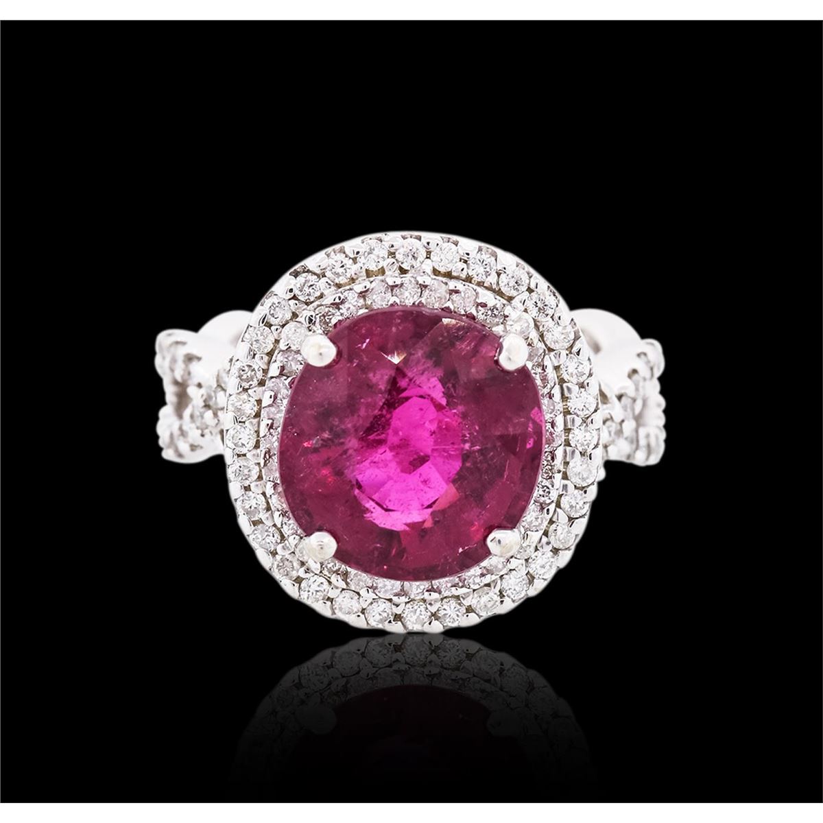 One electronically tested 18KT white gold ladies cast rubellite tourmaline & diamond ring with a bright finish. The features rubellite is set within a tiered diamond bezel, supported by intertwined diamond set shoulders, completed by a four millimeter wide band. Identified with markings of "K18". Condition is good. Containing: One prong set oval mixed cut natural rubellite, measuring 11.80 x 11.00 x 7.65mm, approximate weight of 6.08ct., clarity is heavily included, type III, dark, slightly grayish, purple red color, (GIA PR 7/2), cut is good. Transmitting light somewhat diffusely, transparent. Naturally occurring internal & external characteristics are present. Refractive index testing results of 1.62 to 1.64. This is a conclusive result for tourmaline. Indications of multiple laboratory enhancements, including high temperature heat treatment. Colored Stone Grading Report attached. Graded in the setting. One Hundred Twelve prong set round brilliant cut diamonds, measuring 1.35 - 1.20 x 0.77mm (depth est.) approximate total weight of 112 Stones = 0.85ct. Graded in the setting. Clarity I-1 to I-2. Color G - I. Total Weight of Colored Stones 6.08ct. Total Weight of Diamonds 0.85ct. Total Weight of Ring 9.97 grams. AIG Appraised at $9,150.00.