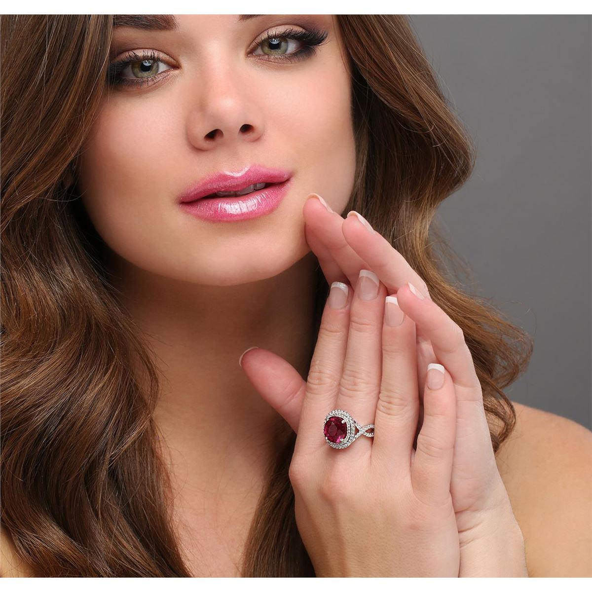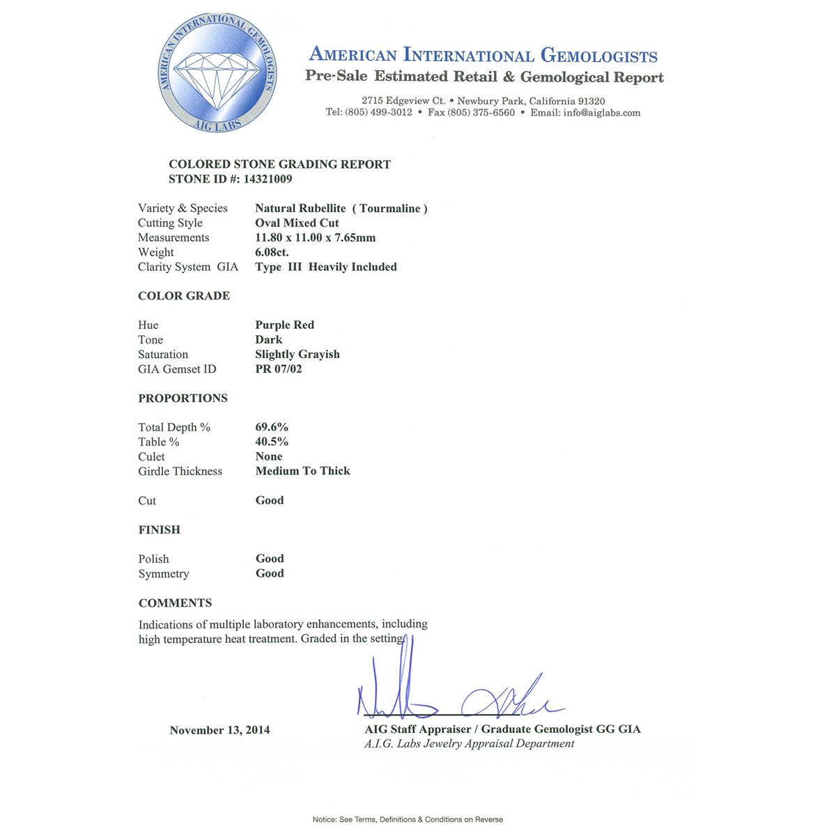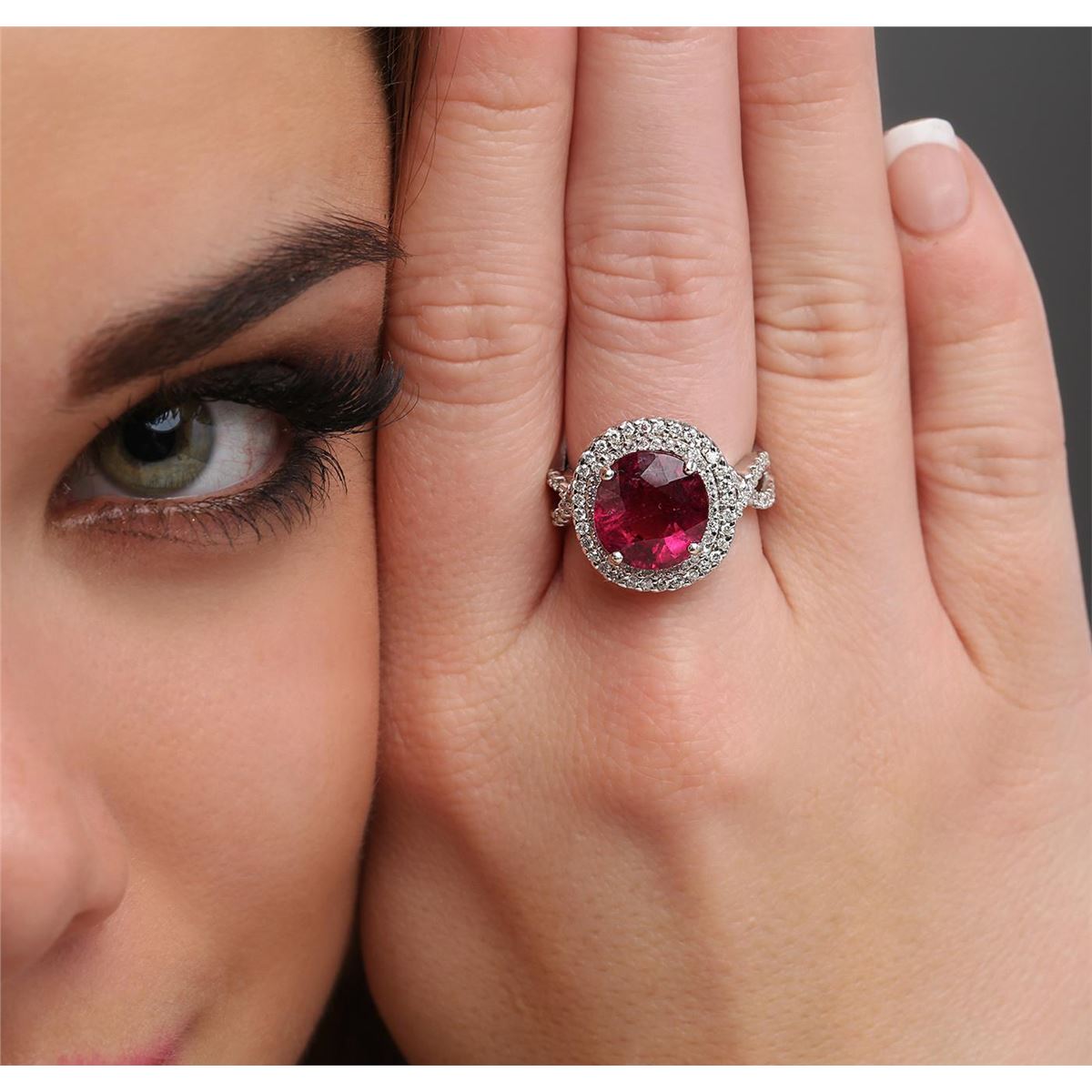 One electronically tested 18KT white gold ladies cast rubellite tourmaline & diamond ring with a bright finish. The features rubellite is set within a tiered diamond bezel, supported by intertwined diamond set shoulders, completed by a four millimeter wide band. Identified with markings of "K18". Condition is good. Containing: One prong set oval mixed cut natural rubellite, measuring 11.80 x 11.00 x 7.65mm, approximate weight of 6.08ct., clarity is heavily included, type III, dark, slightly grayish, purple red color, (GIA PR 7/2), cut is good. Transmitting light somewhat diffusely, transparent. Naturally occurring internal & external characteristics are present. Refractive index testing results of 1.62 to 1.64. This is a conclusive result for tourmaline. Indications of multiple laboratory enhancements, including high temperature heat treatment. Colored Stone Grading Report attached. Graded in the setting. One Hundred Twelve prong set round brilliant cut diamonds, measuring 1.35 - 1.20 x 0.77mm (depth est.) approximate total weight of 112 Stones = 0.85ct. Graded in the setting. Clarity I-1 to I-2. Color G - I. Total Weight of Colored Stones 6.08ct. Total Weight of Diamonds 0.85ct. Total Weight of Ring 9.97 grams. AIG Appraised at $9,150.00.