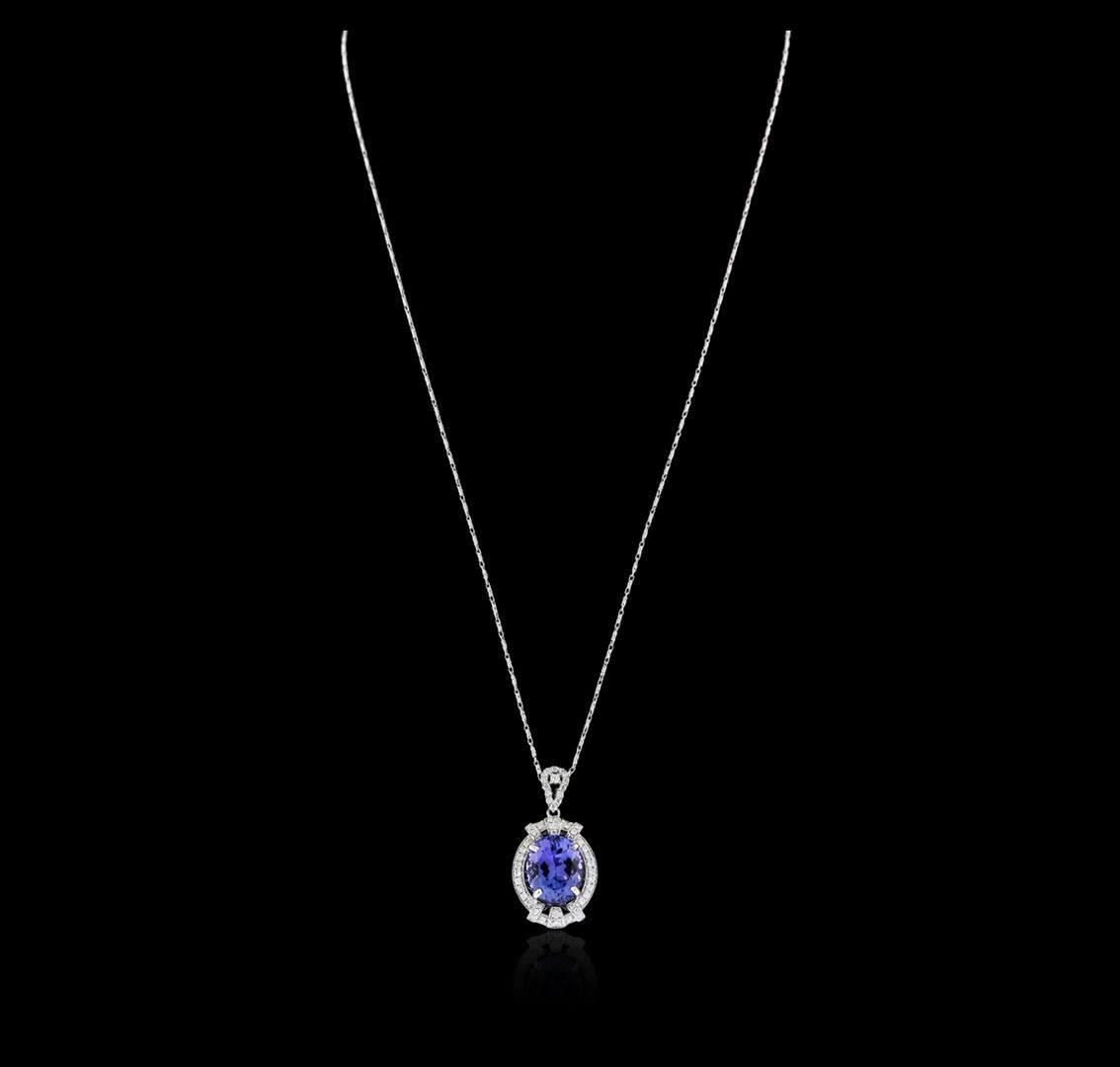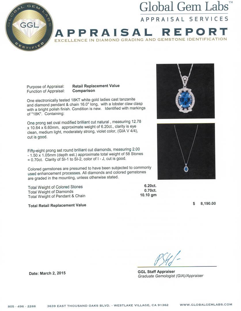 One electronically tested 18KT white gold ladies cast tanzanite and diamond pendant & chain 16.0" long, with a lobster claw clasp with a bright polish finish. Identified with markings of "18K". Condition is new. Containing: One prong set oval modified brilliant cut natural , measuring 12.78 x 10.64 x 6.60mm, approximate weight of 6.20ct., clarity is eye clean, medium light, moderately strong, violet color, (GIA V 4/4), cut is good. Fifty-Eight prong set round brilliant cut diamonds, measuring 2.00 - 1.50 x 1.05mm (depth est.) approximate total weight of 58 Stones = 0.70ct. Clarity: SI-1 to SI-2. Color: I - J, Cut is Good. Colored gemstones are presumed to have been subjected to commonly used enhancement processes. All diamonds and colored gemstones are graded in the mounting, unless otherwise stated. Total Weight of Colored Stones 6.20ct. Total Weight of Diamonds 0.70ct. Total Weight of Pendant & Chain 10.10 grams. GGL Appraised at $8,190.00.