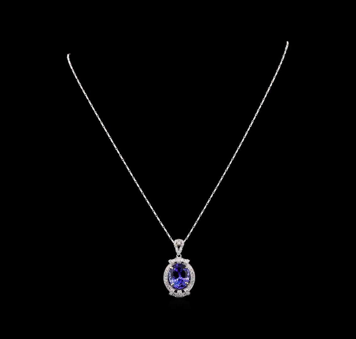 One electronically tested 18KT white gold ladies cast tanzanite and diamond pendant & chain 16.0" long, with a lobster claw clasp with a bright polish finish. Identified with markings of "18K". Condition is new. Containing: One prong set oval modified brilliant cut natural , measuring 12.78 x 10.64 x 6.60mm, approximate weight of 6.20ct., clarity is eye clean, medium light, moderately strong, violet color, (GIA V 4/4), cut is good. Fifty-Eight prong set round brilliant cut diamonds, measuring 2.00 - 1.50 x 1.05mm (depth est.) approximate total weight of 58 Stones = 0.70ct. Clarity: SI-1 to SI-2. Color: I - J, Cut is Good. Colored gemstones are presumed to have been subjected to commonly used enhancement processes. All diamonds and colored gemstones are graded in the mounting, unless otherwise stated. Total Weight of Colored Stones 6.20ct. Total Weight of Diamonds 0.70ct. Total Weight of Pendant & Chain 10.10 grams. GGL Appraised at $8,190.00.
