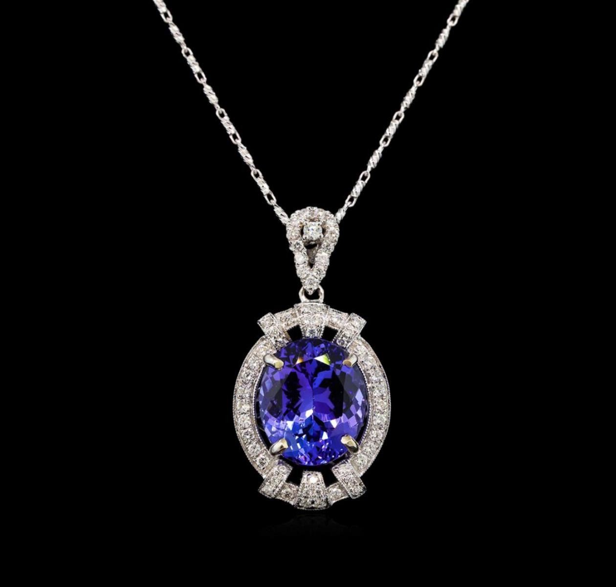One electronically tested 18KT white gold ladies cast tanzanite and diamond pendant & chain 16.0" long, with a lobster claw clasp with a bright polish finish. Identified with markings of "18K". Condition is new. Containing: One prong set oval modified brilliant cut natural , measuring 12.78 x 10.64 x 6.60mm, approximate weight of 6.20ct., clarity is eye clean, medium light, moderately strong, violet color, (GIA V 4/4), cut is good. Fifty-Eight prong set round brilliant cut diamonds, measuring 2.00 - 1.50 x 1.05mm (depth est.) approximate total weight of 58 Stones = 0.70ct. Clarity: SI-1 to SI-2. Color: I - J, Cut is Good. Colored gemstones are presumed to have been subjected to commonly used enhancement processes. All diamonds and colored gemstones are graded in the mounting, unless otherwise stated. Total Weight of Colored Stones 6.20ct. Total Weight of Diamonds 0.70ct. Total Weight of Pendant & Chain 10.10 grams. GGL Appraised at $8,190.00.