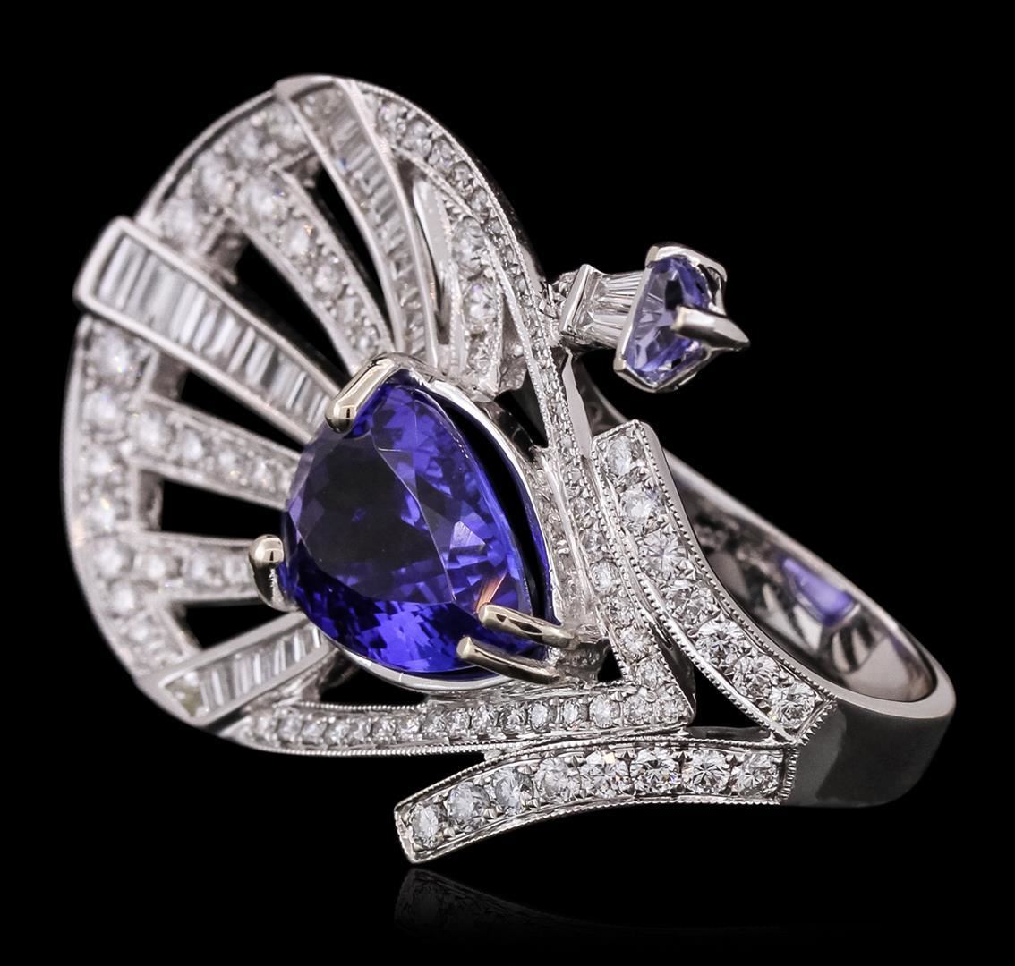 One electronically tested 18KT white gold ladies combination cast & assembled prong set ring with a bright polish finish. Identified with markings of "750". Condition is new. Containing: One prong set pear modified brilliant cut natural tanzanite, measuring 14.00 x 9.68 x 6.29mm, approximate weight of 5.71ct., clarity is eye clean, type I, medium, moderately strong, bluish violet color, (GIA bV 5/4), cut is good. One prong set triangle modified brilliant cut natural tanzanite, measuring 5.00 x 5.00 x 3.25mm, approximate weight of 0.49ct., clarity is eye clean, type I, medium, moderately strong, violet color, (GIA V 5/4), cut is good. Ninety-One prong set round brilliant cut diamonds, measuring 1.90 - 1.10 x 0.90mm (depth est.) approximate total weight of 91 Stones = 1.12ct. Clarity: SI-1 to I-1. Color: H - I, Cut is Good. Thirty-Three channel set baguette cut diamonds, measuring from 1.50 x 1.50 x 1.28mm (depth est.) to 3.00 x 1.80 x 1.53mm (depth est.) approximate total weight of 33 Stones = 1.57ct. Clarity: VS-2. Color: H, Cut is Good. Colored gemstones are presumed to have been subjected to commonly used enhancement processes. All diamonds and colored gemstones are graded in the mounting, unless otherwise stated. Total Weight of Colored Stones 6.20ct. Total Weight of Diamonds 2.69ct. Total Weight of Ring 12.40 grams. GGL Appraised.