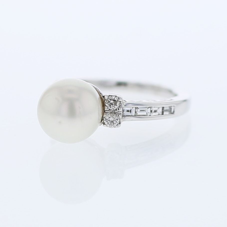 One 18KT White Gold 6.45ct Pearl and Diamond Ring. (1) Pearl with a total weight of 6.45cts. (8) Baguette Diamonds with a total weight of 0.32cts. (4) Round Diamonds with a total weight of 0.19cts. Total weight of this ring is 4.64 grams.