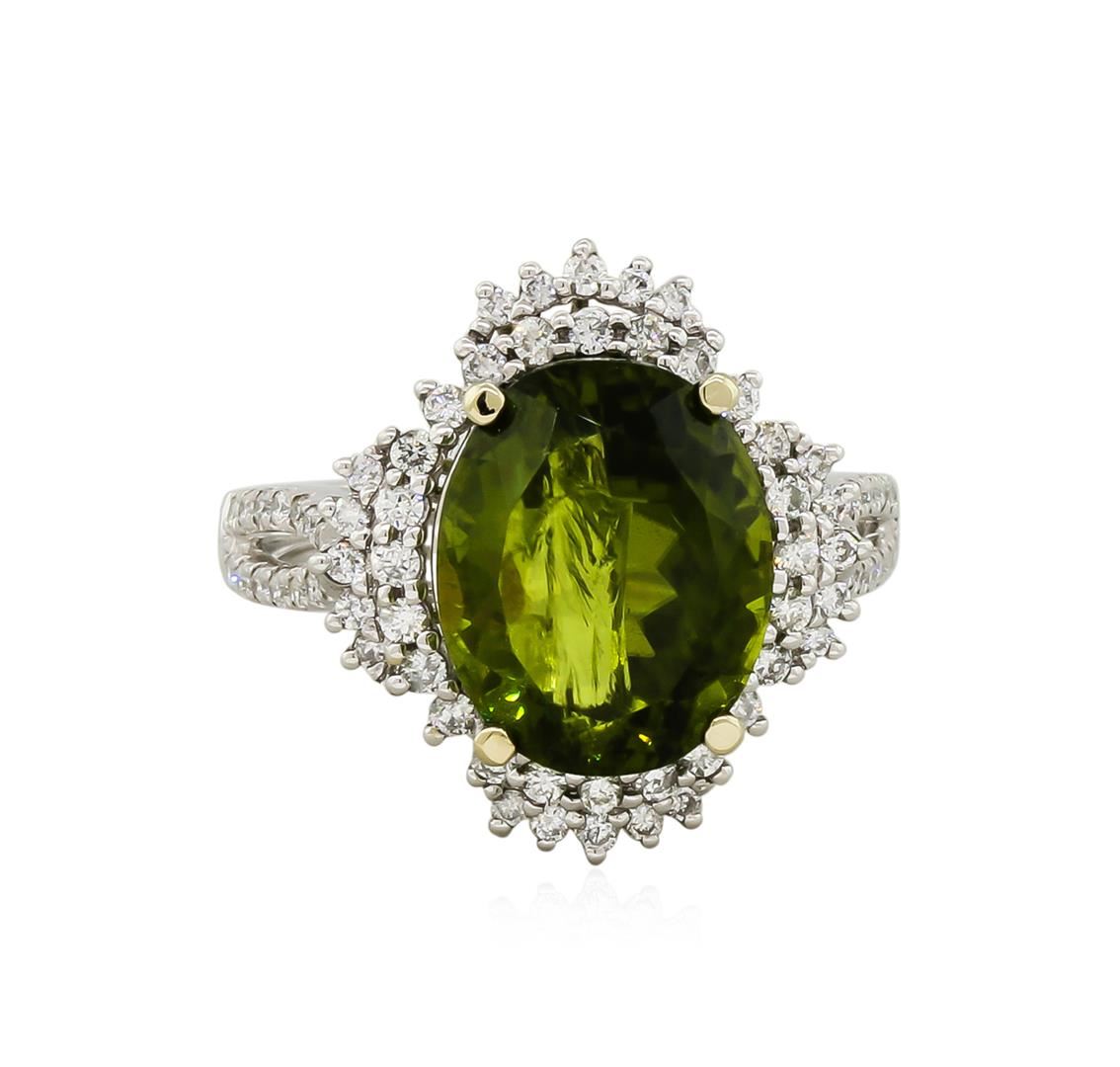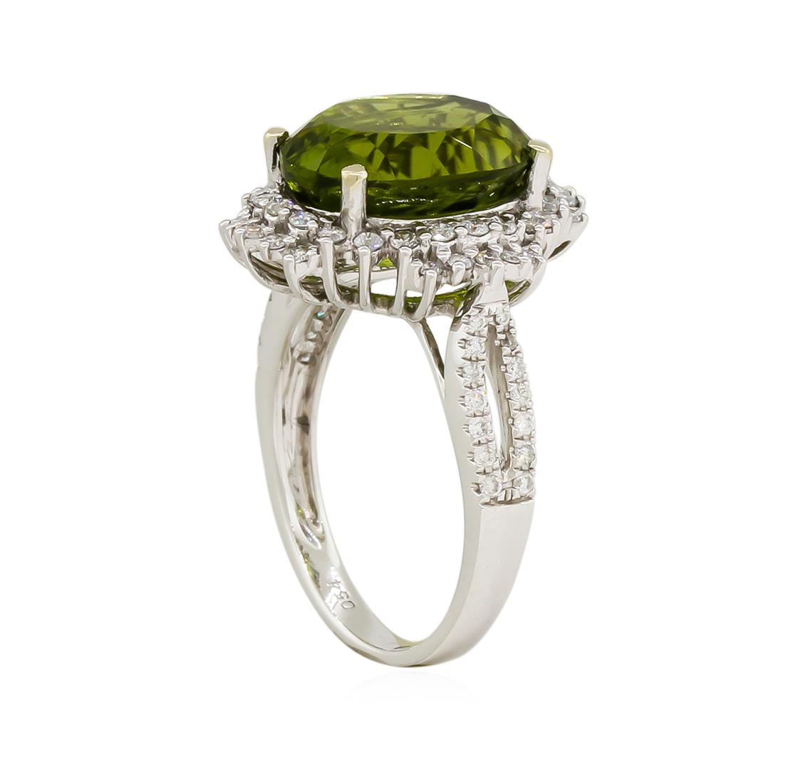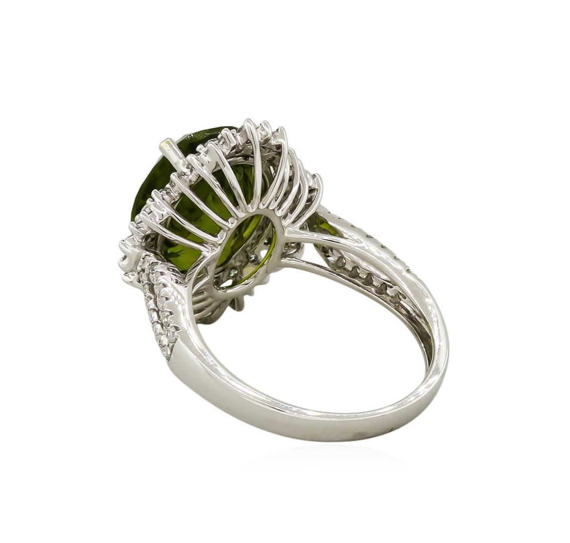 Beautiful tourmaline and diamond ring featuring 4.45 grams 18KT White Gold and a 6.52 carat oval shaped tourmaline center-stone surrounded by seventy-two round diamonds which extend down both sides of the band totaling 0.54 carats.