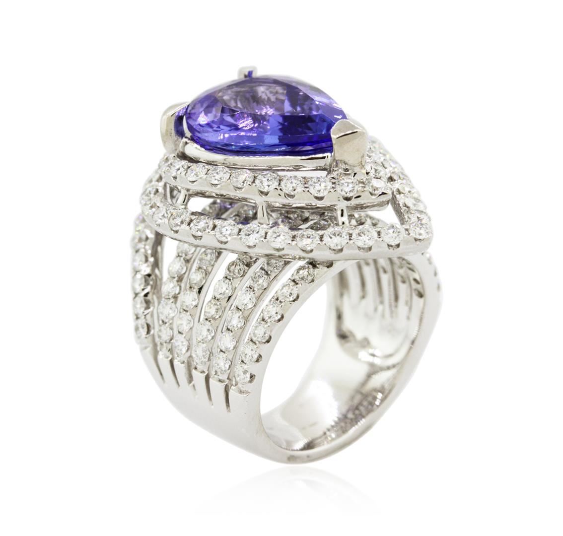 One electronically tested 18KT white gold ladies combination cast & assembled engagement ring with a bright polish finish. Identified with markings of "750". Condition is new. Containing: One prong set pear modified brilliant cut natural tanzanite, measuring 15.00 x 10.00 x 6.50mm, approximate weight of 6.53ct., clarity is eye clean, type I, medium light, very slightly grayish, bluish violet color, (GIA bV 4/3), cut is good. One Hundred Fifty-Six prong set round brilliant cut diamonds, measuring 1.80 - 1.80 x 1.08mm (depth est.) approximate total weight of 156 Stones = 3.21ct. Clarity: SI-1 to SI-2. Color: H - I, Cut is Good. Colored gemstones are presumed to have been subjected to commonly used enhancement processes. All diamonds and colored gemstones are graded in the mounting, unless otherwise stated. Total Weight of Colored Stones 6.53ct. Total Weight of Diamonds 3.21ct. Total Weight of Ring 19.60 grams. GGL Appraised.