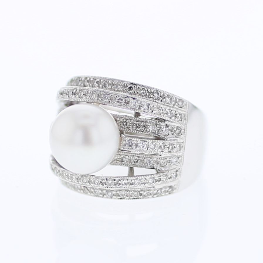 One 18KT White Gold 6.53ct Pearl and Diamond Ring. (1) Pearl with a total weight of 6.53cts. (88) round Diamonds with a total weight of 0.74cts with a color of I and clarity of I-1. Total weight of this ring is 13.26 grams.