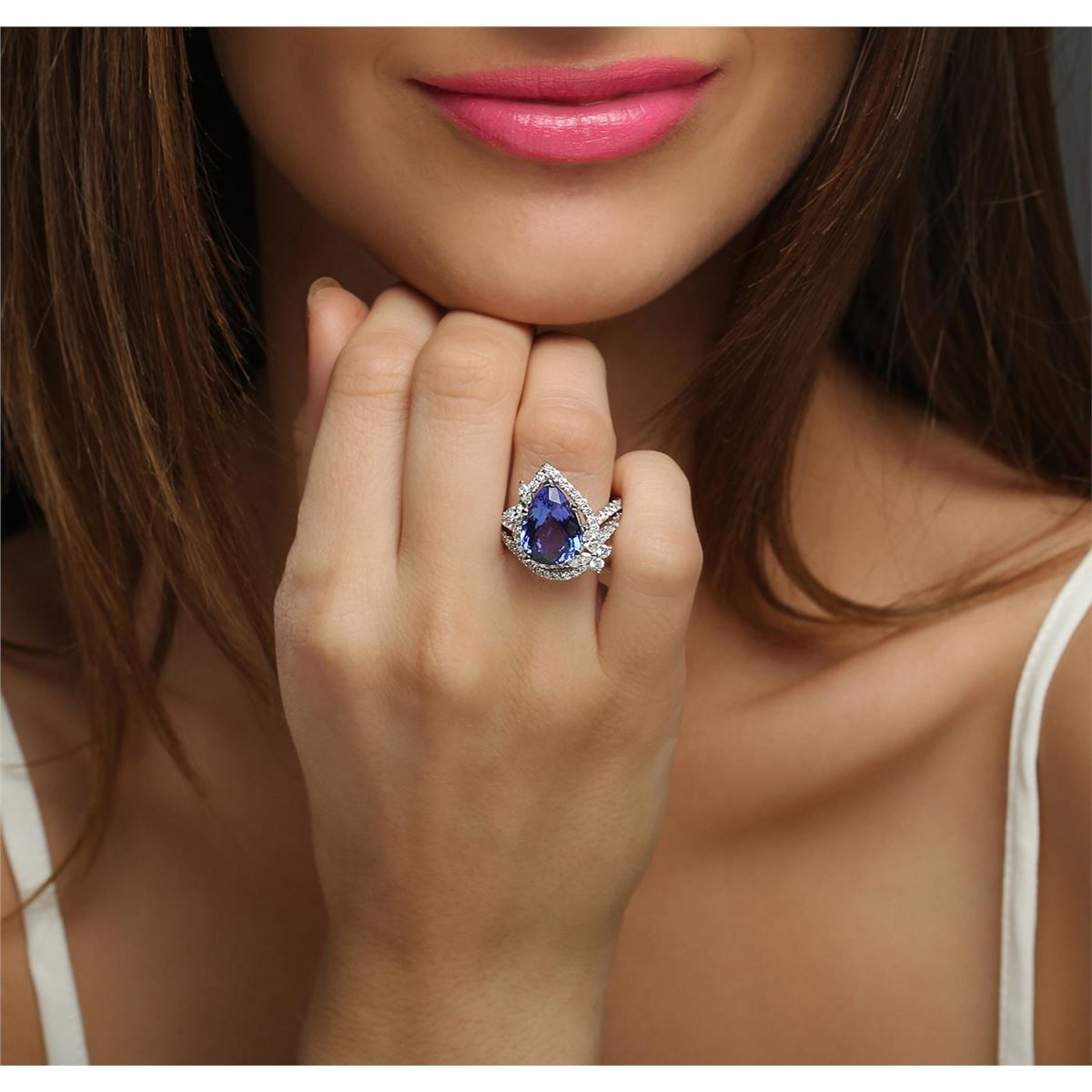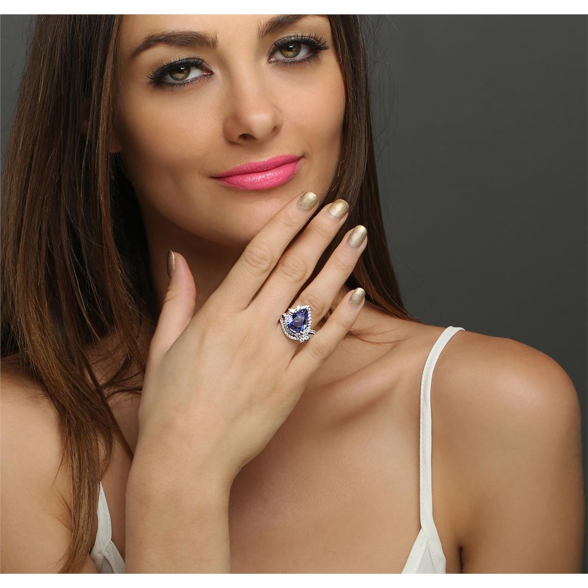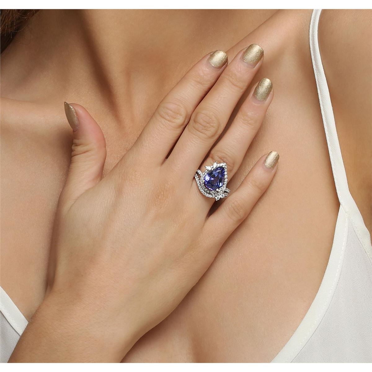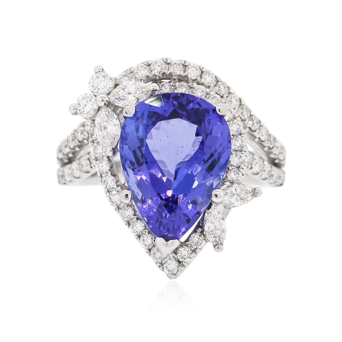 One electronically tested 18KT white gold ladies combination cast & assembled ring with a bright polish finish. Identified with markings of "750". Condition is new. Containing: One prong set pear modified brilliant cut natural tanzanite, measuring 14.50 x 10.50 x 6.83mm, approximate weight of 6.97ct., clarity is eye clean, type I, medium, very slightly grayish, violet color, (GIA V 5/3), cut is good. Seventy prong set round brilliant cut diamonds, measuring 2.20 - 1.50 x 1.11mm (depth est.) approximate total weight of 70 Stones = 0.89ct. Clarity: SI-1 to SI-2. Color: H - I, Cut is Good. Four prong set marquise shaped cut diamonds, measuring 3.50 x 2.00 x 1.26mm (depth est.) approximate total weight of 4 Stones = 0.20ct. Clarity: SI-1 to SI-2. Color: H - I, Cut is Good. Colored gemstones are presumed to have been subjected to commonly used enhancement processes. All diamonds and colored gemstones are graded in the mounting, unless otherwise stated. Total Weight of Colored Stones 6.97ct. Total Weight of Diamonds 1.09ct. Total Weight of Ring 9.80 grams. GGL Appraised at $17,250.00.