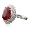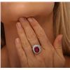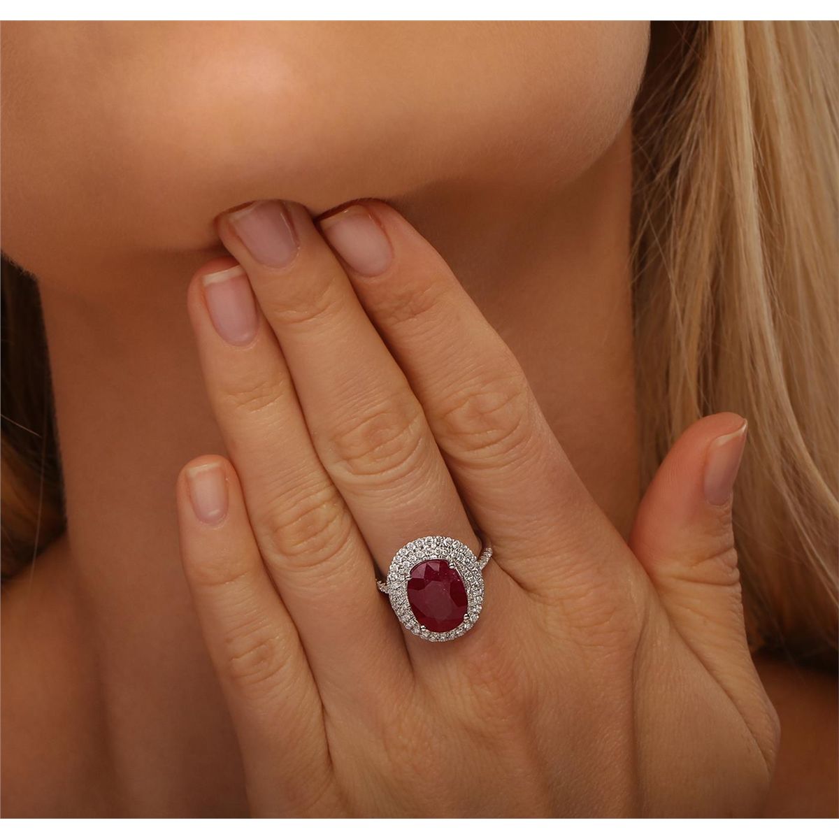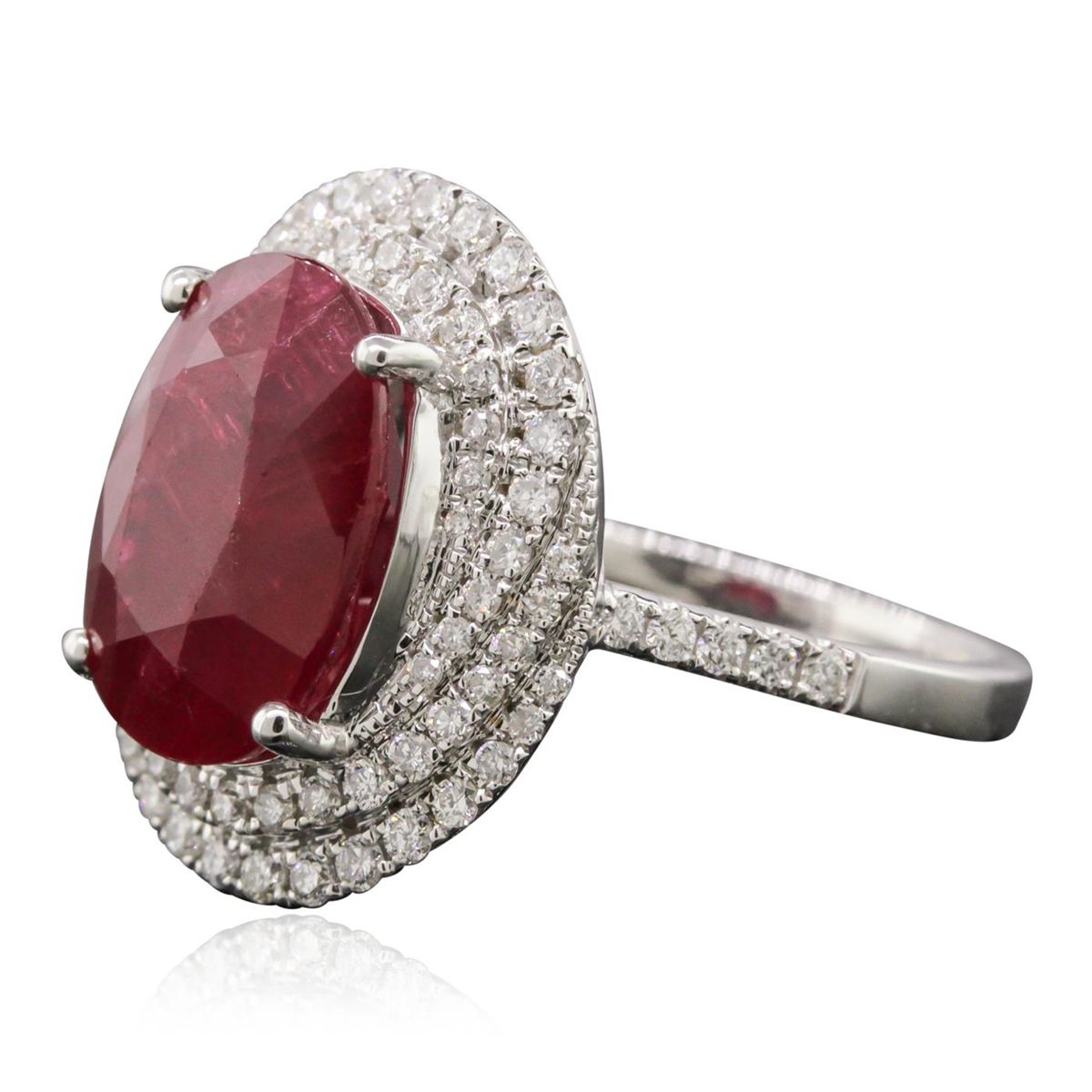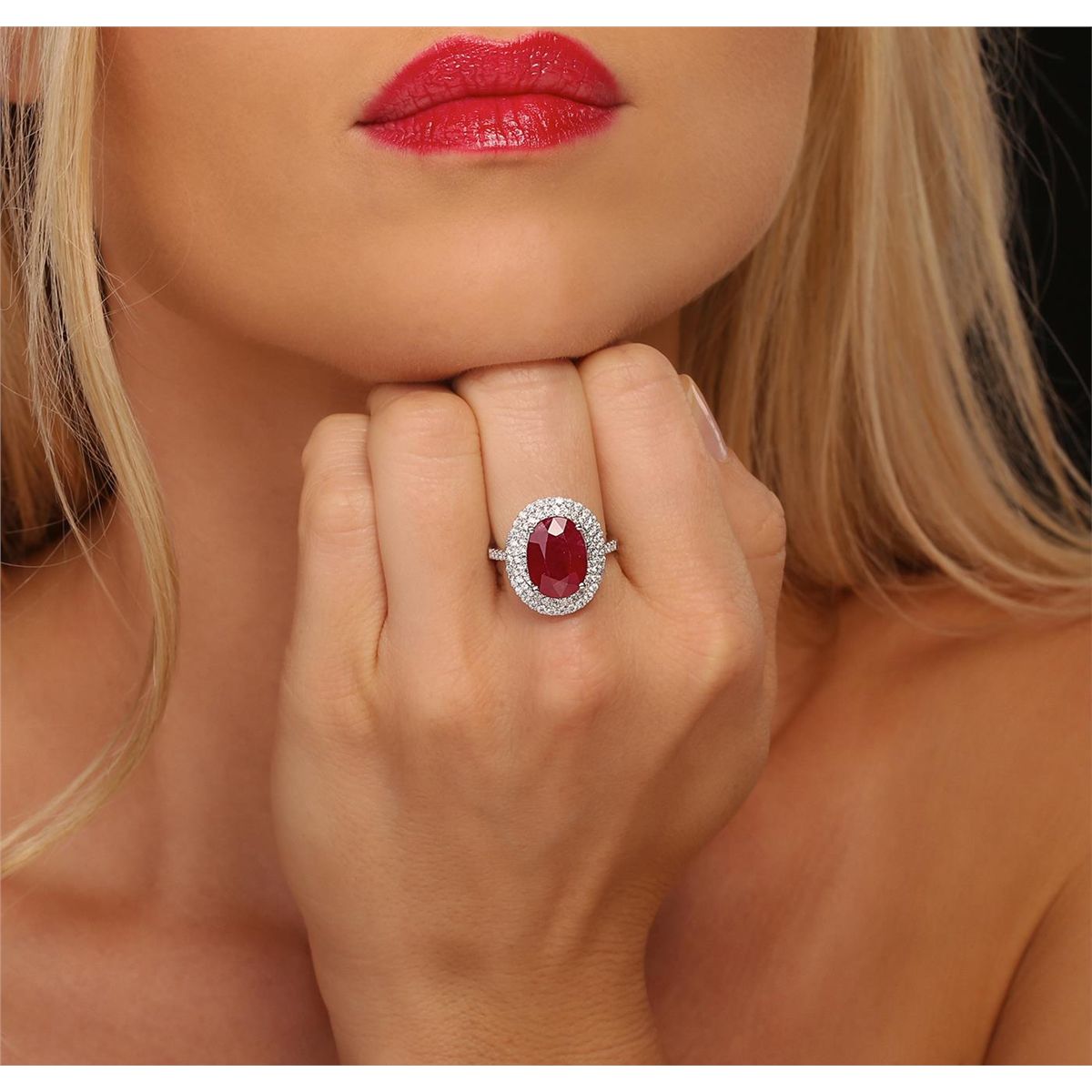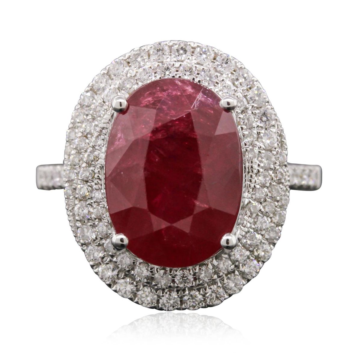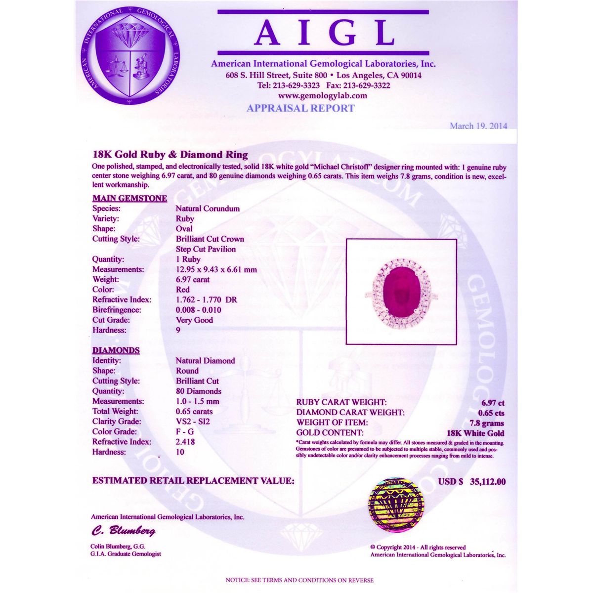 One polished, stamped, and electronically tested, solid 18K white gold "Michael Christoff" designer ring mounted with: 1 genuine ruby center stone weighing 6.97 carat, and 80 genuine diamonds weighing 0.65 carats. This item weighs 7.8 grams, condition is new, excellent workmanship. Main gemstone: Species - natural corundum. Variety - ruby. Shape - oval. Cutting style - brilliant cut crown step cut pavilion. Quantity - 1 ruby. Measurements - 12.95x9.43x6.61 mm. Weight - 6.97 carat. Color - red. Refractive index - 1.762-1.770 DR. Birefringence - 0.008-0.010. Cut grade - very good. Hardness - 9. Diamonds: Identity - natural diamond. Shape - round. Cutting style - brilliant cut. Quantity - 80 diamonds. Measurements - 1.0-1.5 mm. Total weight - 0.65 carats. Clarity grade - VS2-SI2. Color grade - F-G. Refractive index - 2.418. Hardness - 10. Ruby carat weight: 6.97 ct. Diamond carat weight: 0.65 cts. Weight of item - 7.8 grams. Gold content - 18K white gold. AIGL Appraised at $35,112.00.