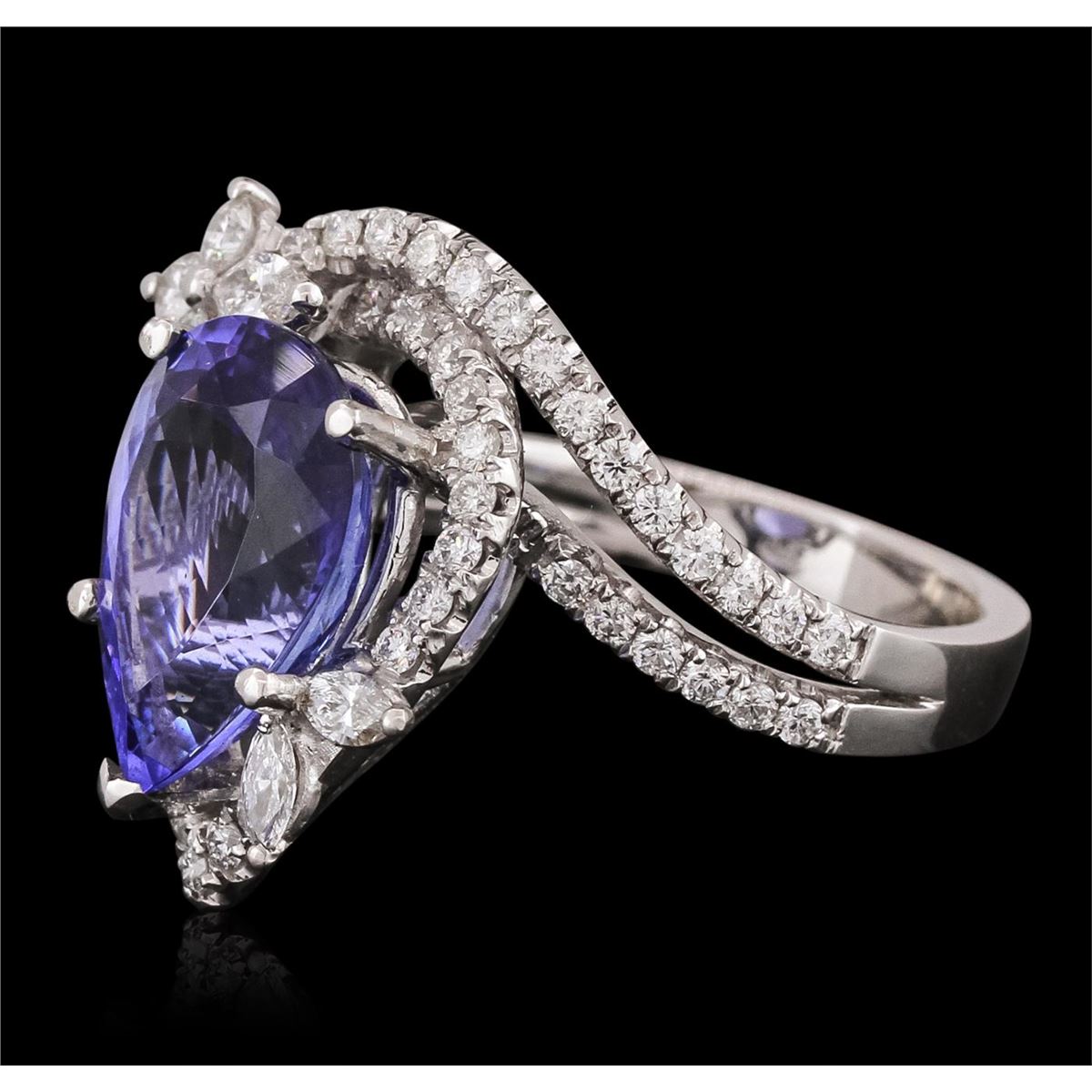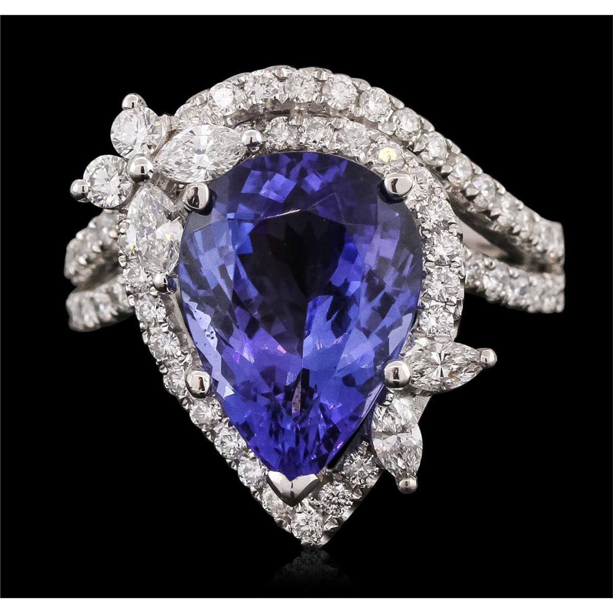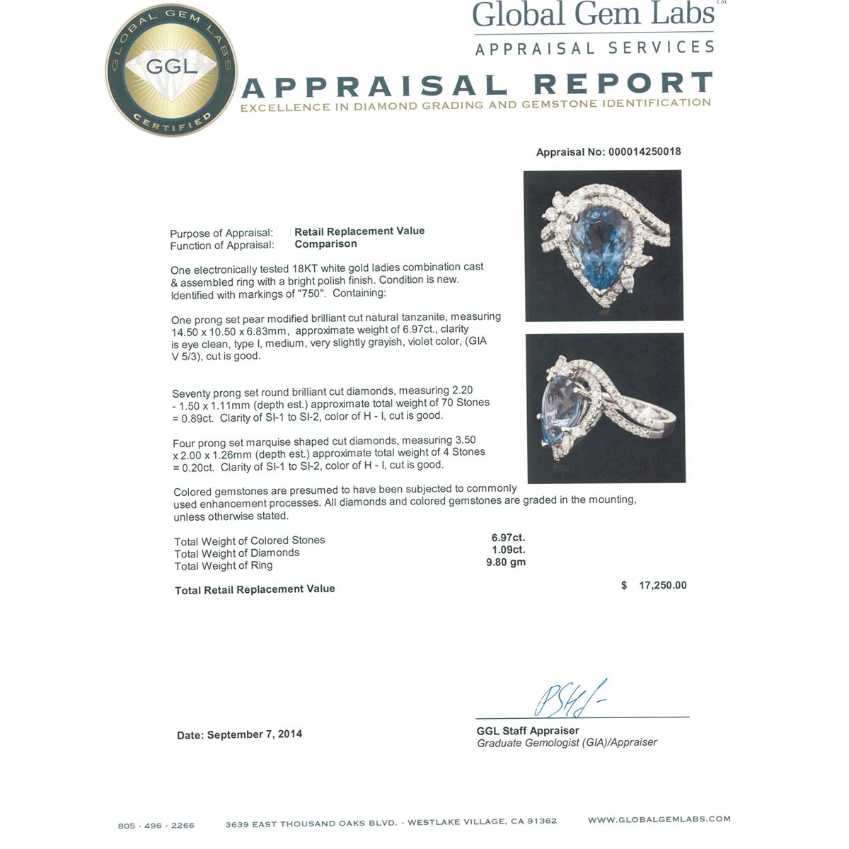 One electronically tested 18KT white gold ladies combination cast & assembled ring with a bright polish finish. Identified with markings of "750". Condition is new. Containing: One prong set pear modified brilliant cut natural tanzanite, measuring 14.50 x 10.50 x 6.83mm, approximate weight of 6.97ct., clarity is eye clean, type I, medium, very slightly grayish, violet color, (GIA V 5/3), cut is good. Seventy prong set round brilliant cut diamonds, measuring 2.20 - 1.50 x 1.11mm (depth est.) approximate total weight of 70 Stones = 0.89ct. Clarity: SI-1 to SI-2. Color: H - I, Cut is Good. Four prong set marquise shaped cut diamonds, measuring 3.50 x 2.00 x 1.26mm (depth est.) approximate total weight of 4 Stones = 0.20ct. Clarity: SI-1 to SI-2. Color: H - I, Cut is Good. Colored gemstones are presumed to have been subjected to commonly used enhancement processes. All diamonds and colored gemstones are graded in the mounting, unless otherwise stated. Total Weight of Colored Stones 6.97ct. Total Weight of Diamonds 1.09ct. Total Weight of Ring 9.80 grams. GGL Appraised at $17,250.00.
