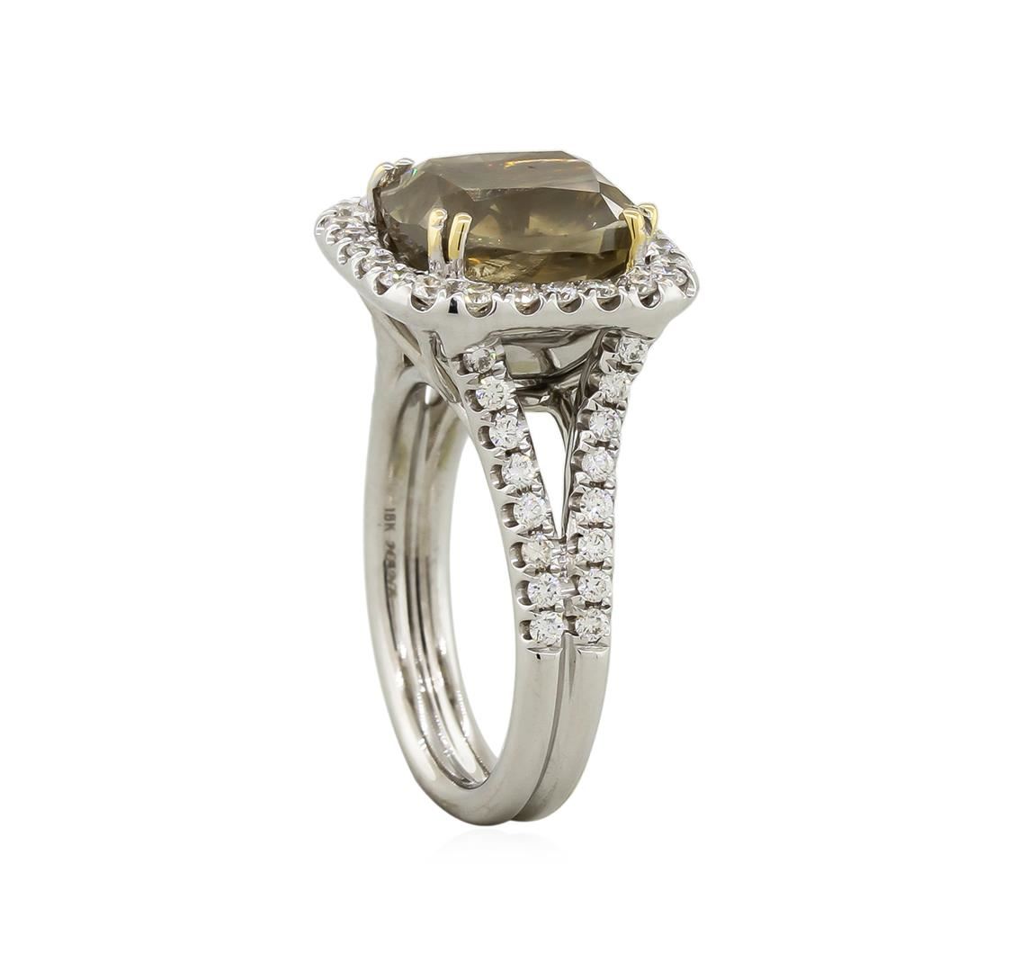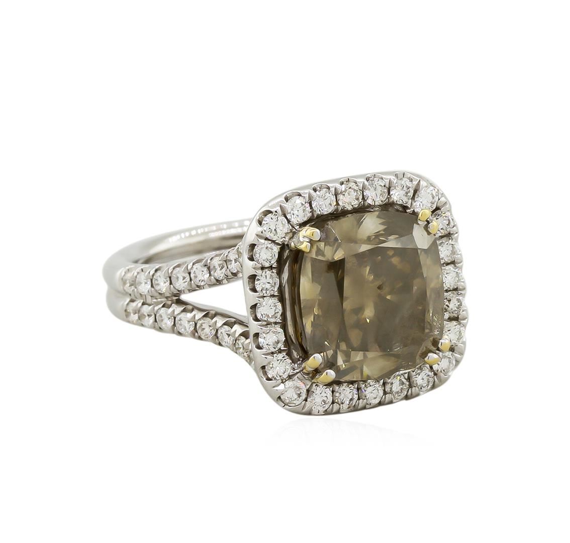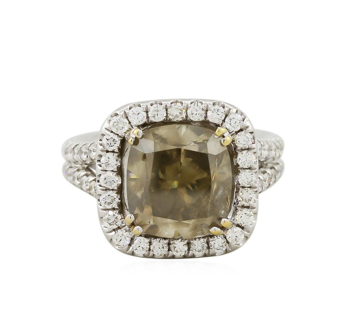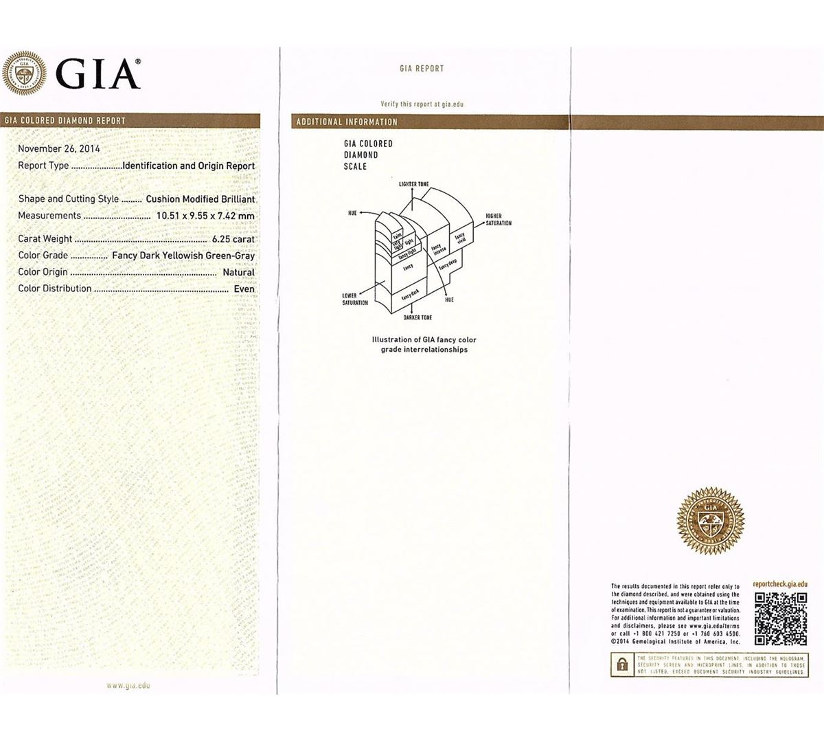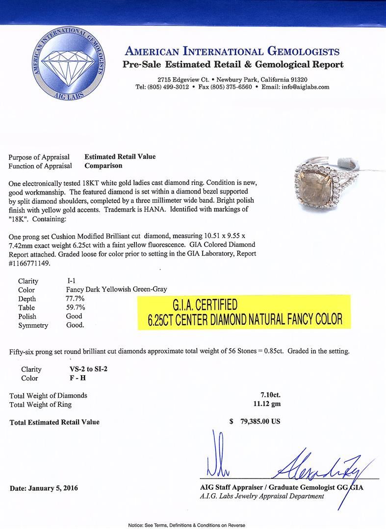 One electronically tested 18KT white gold ladies cast diamond ring. The featured diamond is set within a diamond bezel supported by split diamond shoulders, completed by a three millimeter wide band. Bright polish finish with yellow gold accents. Trademark is HANA. Identified with markings of "18K". Condition is new, good workmanship. Containing: One prong set Cushion Modified Brilliant cut diamond, measuring 10.51 x 9.55 x 7.42mm exact weight 6.25ct with a faint yellow fluorescence. GIA Colored Diamond Report attached. Graded loose for color prior to setting in the GIA Laboratory, Report#1166771149. Clarity I-1. Color: Fancy Dark Yellowish Green-Gray. Depth: 77.7%. Table: 59.7%. Polish Good Symmetry Good. Fifty-Six prong set round brilliant cut diamonds approximate. Total Weight of 56 Stones = 0.85ct. Graded in the setting. Clarity: VS-2 to SI-2. Color: F - H. Total Weight of Diamonds 7.10ct. Total Weight of Ring 11.12gm. AIG Appraised at $79,385.00.