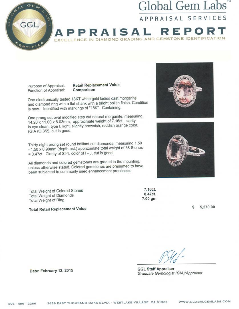 One electronically tested 18KT white gold ladies cast morganite and diamond ring with a flat shank with a bright polish finish. Identified with markings of "18K". Condition is new. Containing: One prong set oval modified step cut natural morganite, measuring 14.20 x 11.00 x 8.03mm, approximate weight of 7.16ct., clarity is eye clean, type I, light, slightly brownish, reddish orange color, (GIA rO 3/2), cut is good. Thirty-Eight prong set round brilliant cut diamonds, measuring 1.50 - 1.50 x 0.90mm (depth est.) approximate total weight of 38 Stones = 0.47ct. Clarity: SI-1. Color: I - J, Cut is Good. All diamonds and colored gemstones are graded in the mounting, unless otherwise stated. Colored gemstones are presumed to have been subjected to commonly used enhancement processes. Total Weight of Colored Stones 7.16ct. Total Weight of Diamonds 0.47ct. Total Weight of Ring 7.00 grams. GGL Appraised at $5,270.00.