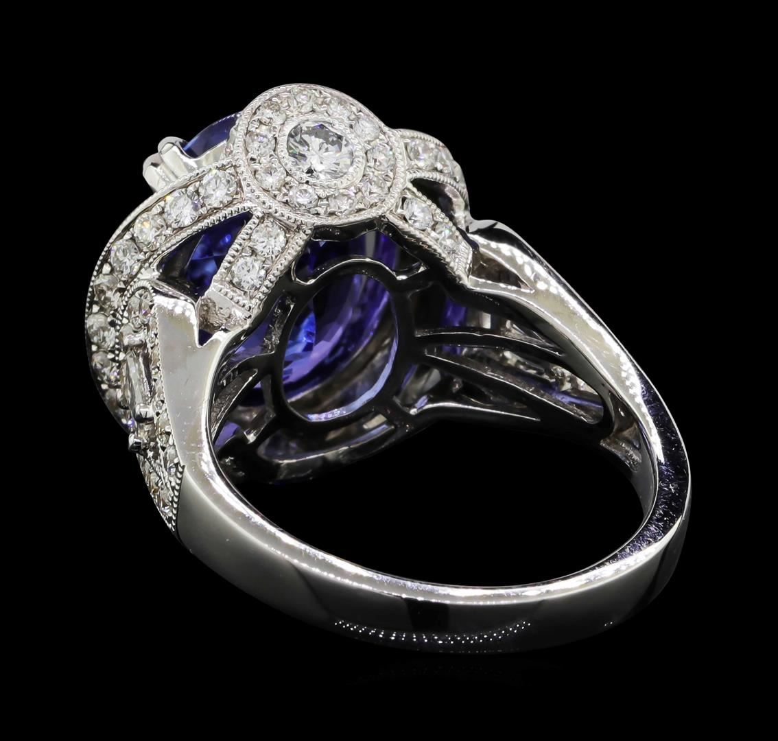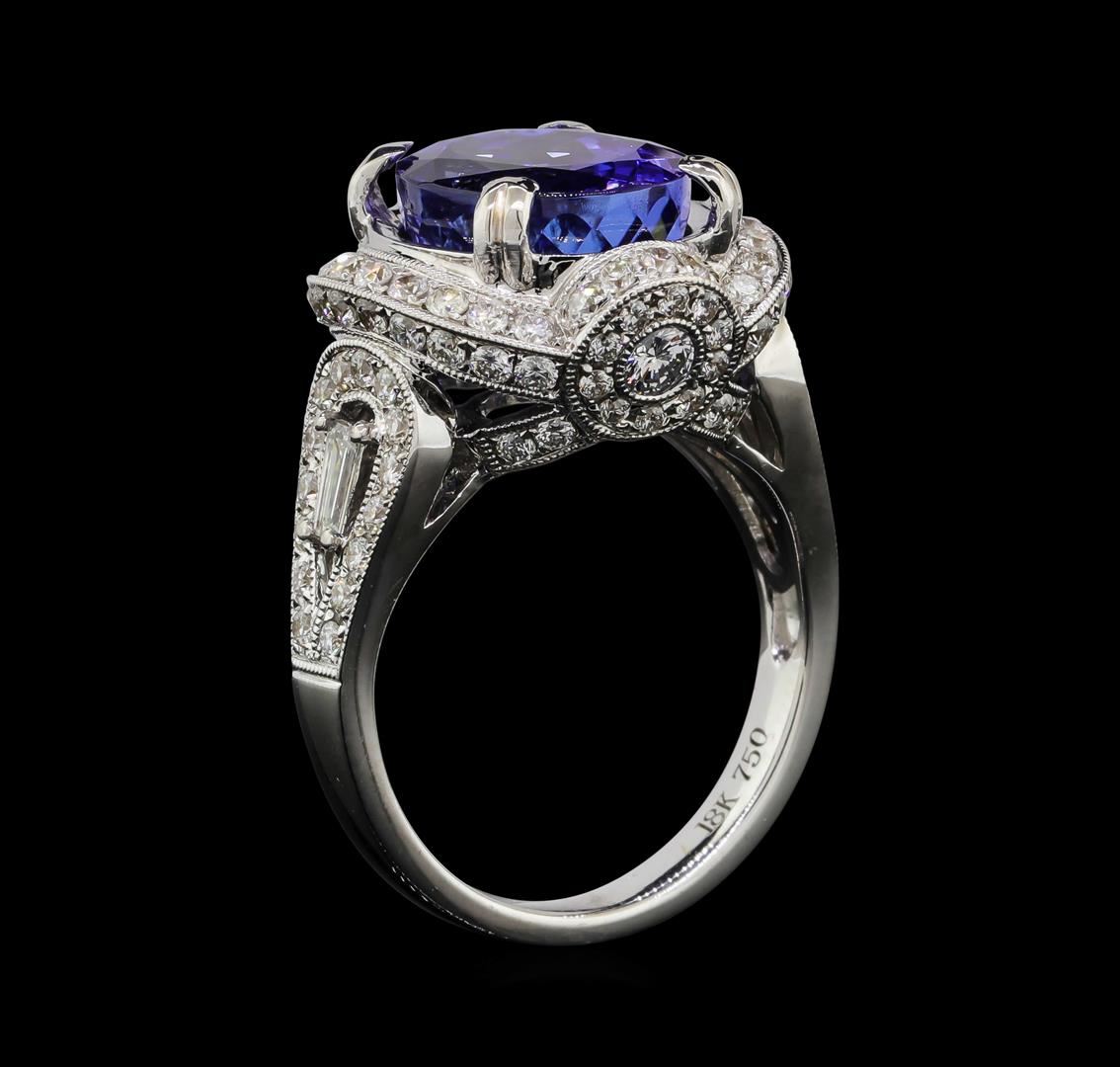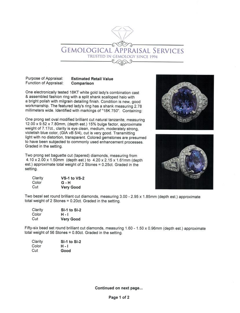 One electronically tested 18KT white gold lady's combination cast & assembled fashion ring with a split shank scalloped halo with a bright polish with milgrain detailing finish. The featured lady's ring has a shank measuring 2.78 millimeters wide. Identified with markings of "18K 750". Condition is new, good workmanship. Containing: One prong set oval modified brilliant cut natural tanzanite, measuring 12.00 x 9.52 x 7.80mm, (depth est.) 15%. bulge factor, approximate weight of 7.17ct., clarity is eye clean, medium, moderately strong, violetish blue color, (GIA vB 5/4), cut is very good. Transmitting light with no distortion, transparent. Colored gemstones are presumed to have been subjected to commonly used enhancement processes. Graded in the setting. Two prong set baguette cut (tapered) diamonds, measuring from 4.10 x 2.00 x 1.50mm (depth est.) to 4.20 x 2.15 x 1.61mm (depth est.) approximate total weight of 2 Stones = 0.25ct. Graded in the setting. Clarity: VS-1 to VS-2. Color: G - HCut Very Good Two bezel set round brilliant cut diamonds, measuring 3.00 - 2.95 x 1.85mm (depth est.) approximate total weight of 2 Stones = 0.20ct. Graded in the setting. Clarity: SI-1 to SI-2. Color: H - ICut Very Good Fifty-Six bead set round brilliant cut diamonds, measuring 1.60 - 1.50 x 0.96mm (depth est.) approximate total weight of 56 Stones = 0.80ct. Graded in the setting. Clarity: SI-1 to SI-2. Color: H - ICut Good Fifty bead set round brilliant cut diamonds, measuring 1.40 - 1.30 x 0.84mm (depth est.) approximate total weight of 50 Stones = 0.50ct. Graded in the setting. Clarity: VS-2 to SI-2. Color: H - ICut Very Good. Total Weight of Colored Stones 7.17ct. Total Weight of Diamonds 1.75ct. Total Weight of Ring 10.30gm. GAS Appraised.