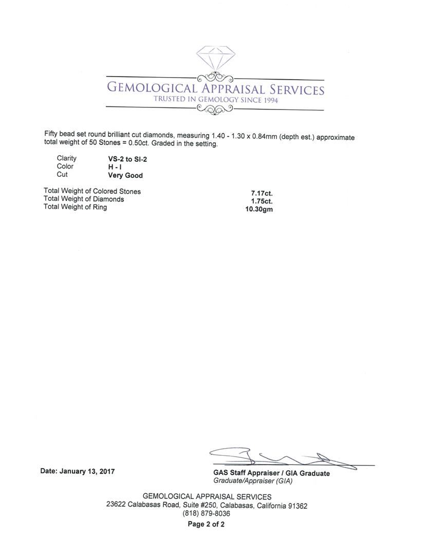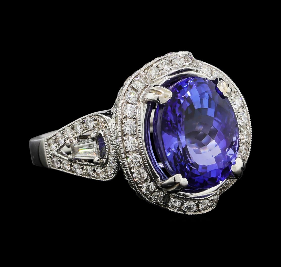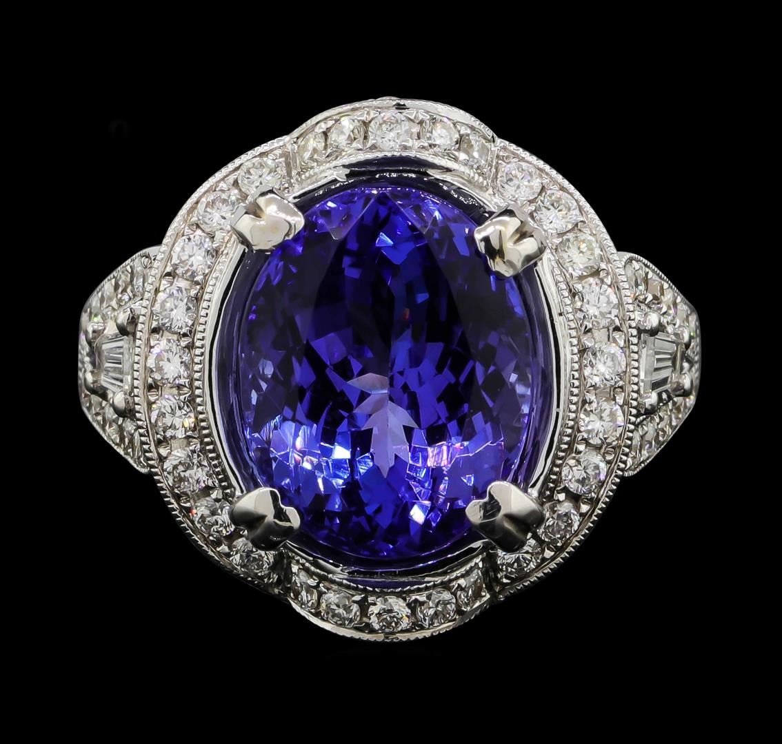 One electronically tested 18KT white gold lady's combination cast & assembled fashion ring with a split shank scalloped halo with a bright polish with milgrain detailing finish. The featured lady's ring has a shank measuring 2.78 millimeters wide. Identified with markings of "18K 750". Condition is new, good workmanship. Containing: One prong set oval modified brilliant cut natural tanzanite, measuring 12.00 x 9.52 x 7.80mm, (depth est.) 15%. bulge factor, approximate weight of 7.17ct., clarity is eye clean, medium, moderately strong, violetish blue color, (GIA vB 5/4), cut is very good. Transmitting light with no distortion, transparent. Colored gemstones are presumed to have been subjected to commonly used enhancement processes. Graded in the setting. Two prong set baguette cut (tapered) diamonds, measuring from 4.10 x 2.00 x 1.50mm (depth est.) to 4.20 x 2.15 x 1.61mm (depth est.) approximate total weight of 2 Stones = 0.25ct. Graded in the setting. Clarity: VS-1 to VS-2. Color: G - HCut Very Good Two bezel set round brilliant cut diamonds, measuring 3.00 - 2.95 x 1.85mm (depth est.) approximate total weight of 2 Stones = 0.20ct. Graded in the setting. Clarity: SI-1 to SI-2. Color: H - ICut Very Good Fifty-Six bead set round brilliant cut diamonds, measuring 1.60 - 1.50 x 0.96mm (depth est.) approximate total weight of 56 Stones = 0.80ct. Graded in the setting. Clarity: SI-1 to SI-2. Color: H - ICut Good Fifty bead set round brilliant cut diamonds, measuring 1.40 - 1.30 x 0.84mm (depth est.) approximate total weight of 50 Stones = 0.50ct. Graded in the setting. Clarity: VS-2 to SI-2. Color: H - ICut Very Good. Total Weight of Colored Stones 7.17ct. Total Weight of Diamonds 1.75ct. Total Weight of Ring 10.30gm. GAS Appraised.