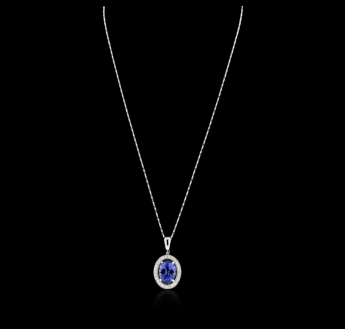 One electronically tested 18KT white gold ladies cast tanzanite and diamond pendant & chain 18.0" long, with a lobster claw clasp with a bright polish finish. Identified with markings of "18K". Condition is new. Containing: One prong set oval modified brilliant cut natural tanzanite, measuring 13.00 x 10.00 x 7.29mm, approximate weight of 7.20ct., clarity is eye clean, medium light, moderately strong, violet color, (GIA V 4/4), cut is good. Twenty-Six prong set round brilliant cut diamonds, measuring 1.50 - 1.50 x 0.90mm (depth est.) approximate total weight of 26 Stones = 0.32ct. Clarity: SI-1 to SI-2. Color: I - J, Cut is Good. Colored gemstones are presumed to have been subjected to commonly used enhancement processes. All diamonds and colored gemstones are graded in the mounting, unless otherwise stated. Total Weight of Colored Stones 7.20ct. Total Weight of Diamonds 0.32ct. Total Weight of Pendant & Chain 11.00 grams. GGL Appraised at $9,090.00.