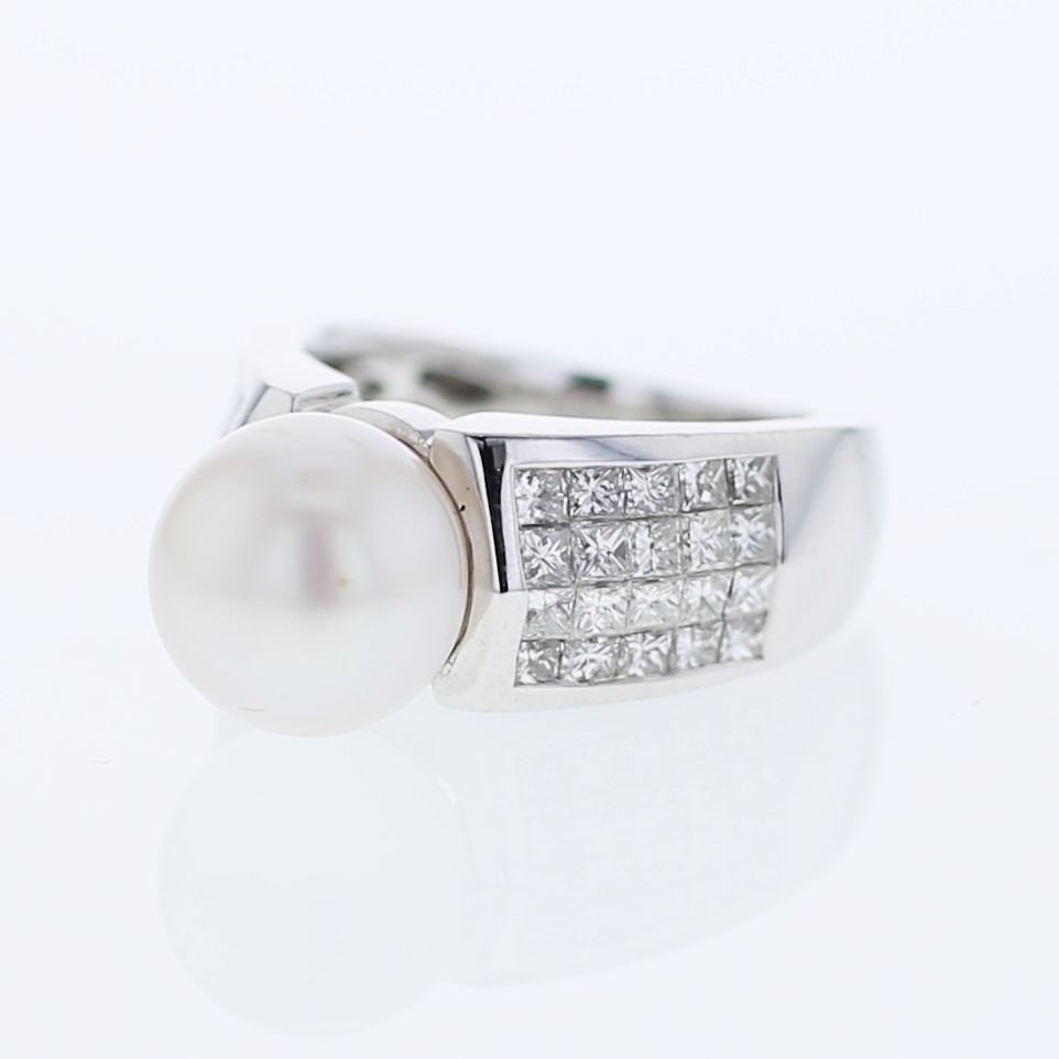 One 18KT White Gold 7.24ct Pearl and Diamond Ring. (1) Pearl with a total weight of 7.24cts. (40) Diamonds with a total weight of 1.62cts. Total weight of this ring is 8.91 grams.