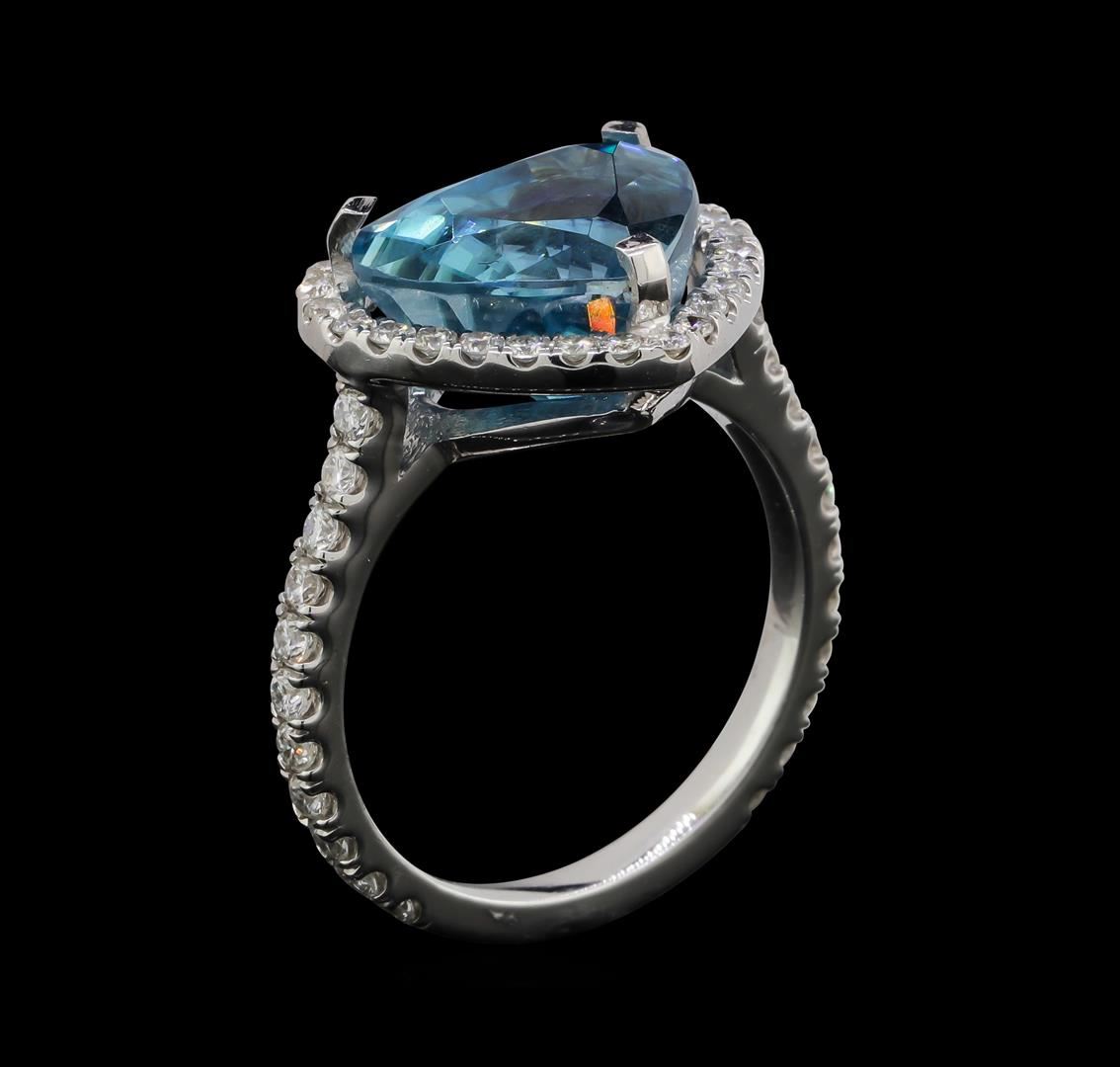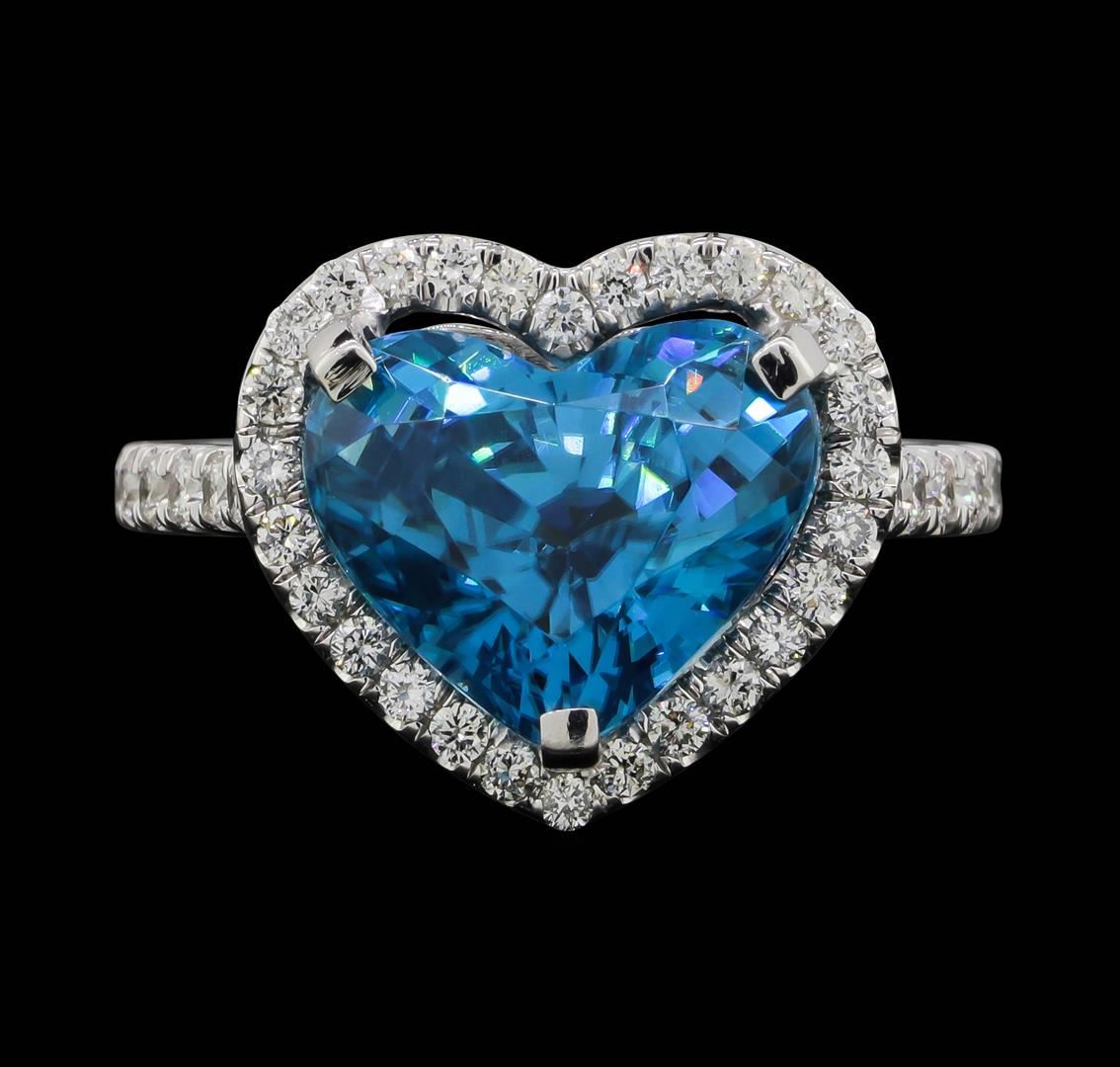 One electronically tested 18KT white gold lady's cast fashion heart shape ring with a cathedral halo with a bright polish finish. The featured lady's ring has a shank measuring 2.03 millimeters wide. Identified with markings of "18K". Condition is new, good workmanship. Containing: One prong set heart modified brilliant cut natural blue zircon, measuring 11.45 x 9.50 x 7.41mm, (depth est.) 3%. bulge factor, approximate weight of 7.64ct., clarity is eye clean, medium dark, moderately strong, very strongly greenish blue color, (GIA vstgB 6/4), cut is good. Transmitting light with no distortion, transparent. Colored gemstones are presumed to have been subjected to commonly used enhancement processes. Graded in the setting. Twenty-Two prong set round brilliant cut diamonds, measuring 1.75 - 1.65 x 1.05mm (depth est.) approximate total weight of 22 Stones = 0.41ct. Graded in the setting. Clarity: VS-2 to SI-2. Color: G - HCut Good Twenty-Eight prong set round brilliant cut diamonds, measuring 1.60 - 1.50 x 0.96mm (depth est.) approximate total weight of 28 Stones = 0.40ct. Graded in the setting. Clarity: VS-2 to SI-2. Color: H - ICut Good. Total Weight of Colored Stones 7.64ct. Total Weight of Diamonds 0.81ct. Total Weight of Ring 5.80gm. GAS Appraised.