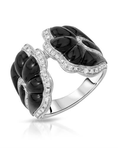One 18KT White Gold 8.38ctw Onyx and Diamond Ring. (4) Black Onyx stones with a total weight of 8.38cts. (90) Round Diamonds with a total weight of 0.60cts with a color of I and clarity of I-1. Total weight of this ring is 8.4 grams.