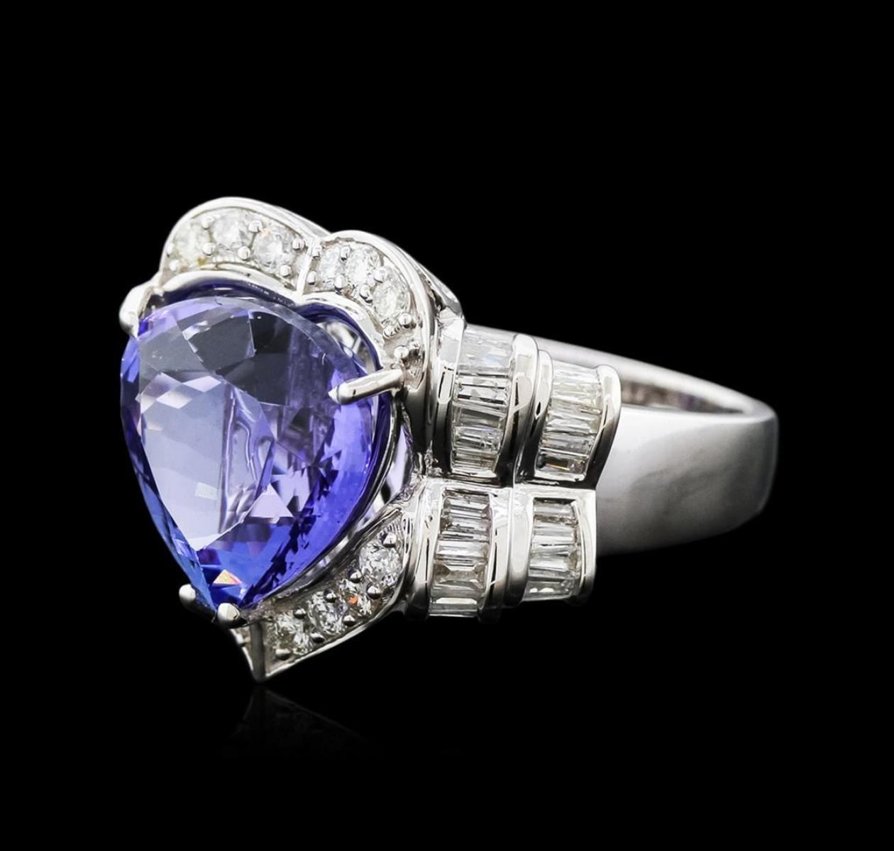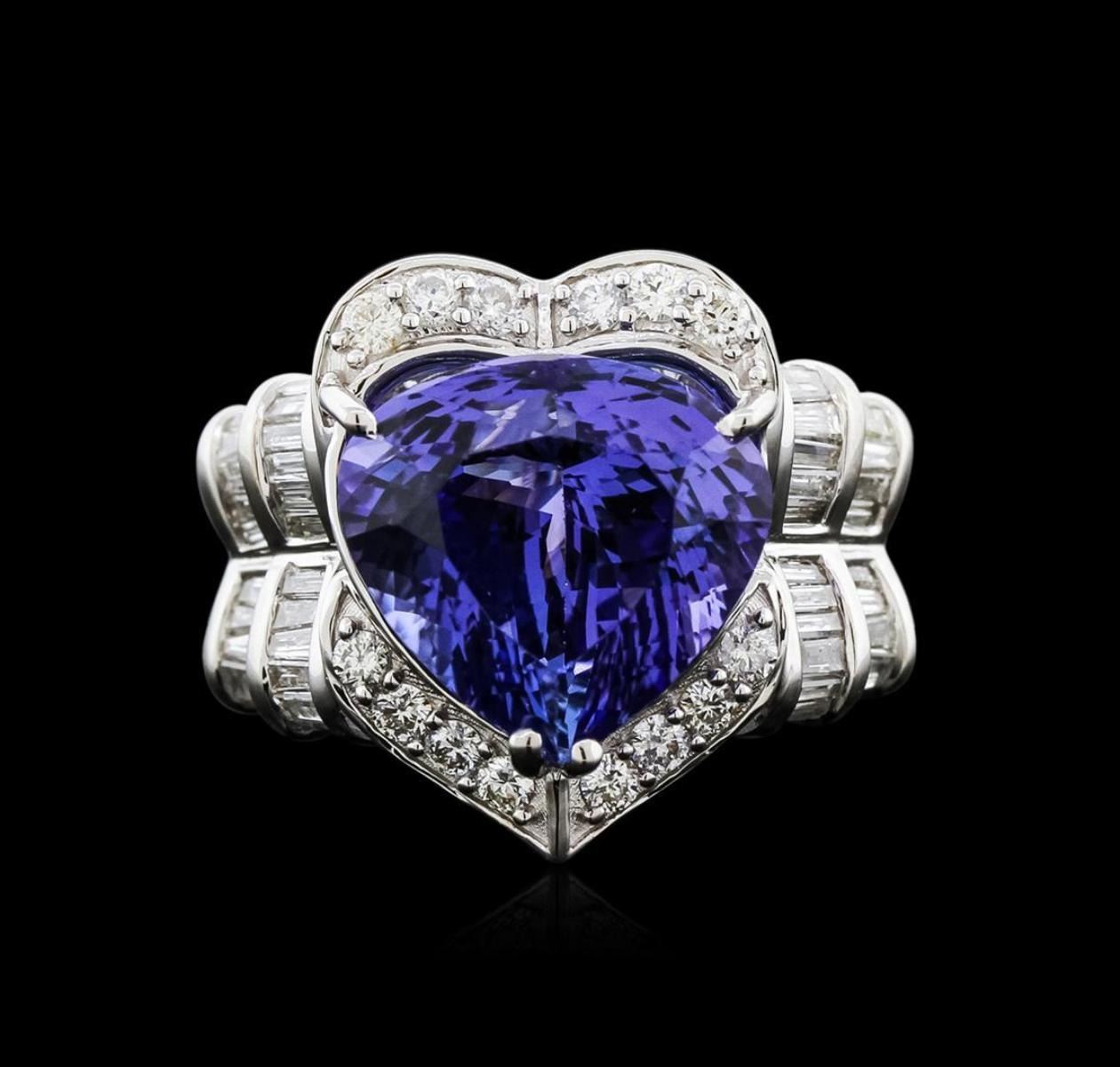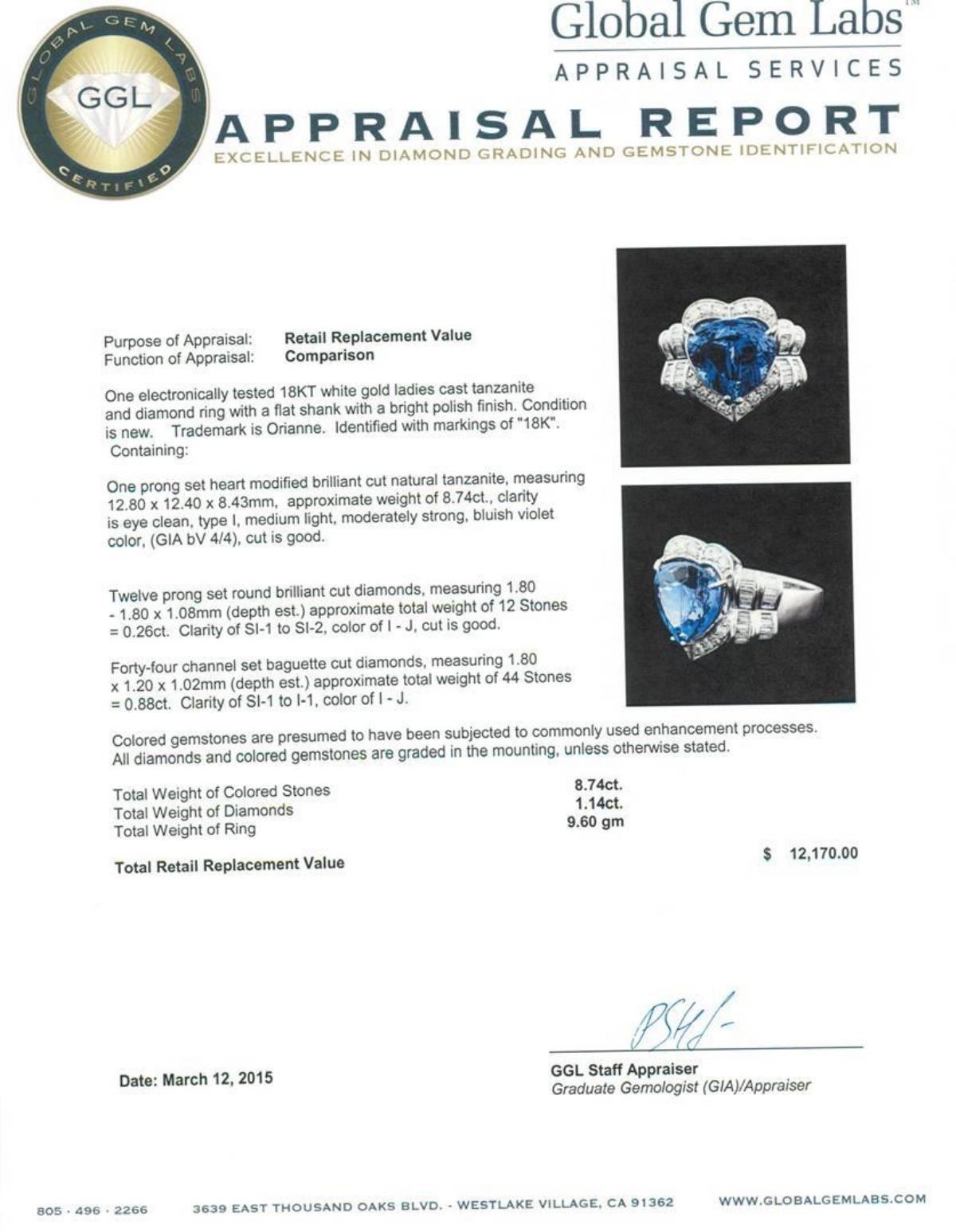 One electronically tested 18KT white gold ladies cast tanzanite and diamond ring with a flat shank with a bright polish finish. Trademark is Orianne. Identified with markings of "18K". Condition is new. Containing: One prong set heart modified brilliant cut natural tanzanite, measuring 12.80 x 12.40 x 8.43mm, approximate weight of 8.74ct., clarity is eye clean, type I, medium light, moderately strong, bluish violet color, (GIA bV 4/4), cut is good. Twelve prong set round brilliant cut diamonds, measuring 1.80 - 1.80 x 1.08mm (depth est.) approximate total weight of 12 Stones = 0.26ct. Clarity: SI-1 to SI-2. Color: I - J, Cut is Good. Forty-Four channel set baguette cut diamonds, measuring 1.80 x 1.20 x 1.02mm (depth est.) approximate total weight of 44 Stones = 0.88ct. Clarity: SI-1 to I-1. Color: I - J. Colored gemstones are presumed to have been subjected to commonly used enhancement processes. All diamonds and colored gemstones are graded in the mounting, unless otherwise stated. Total Weight of Colored Stones 8.74ct. Total Weight of Diamonds 1.14ct. Total Weight of Ring 9.60 grams. GGL Appraised.
