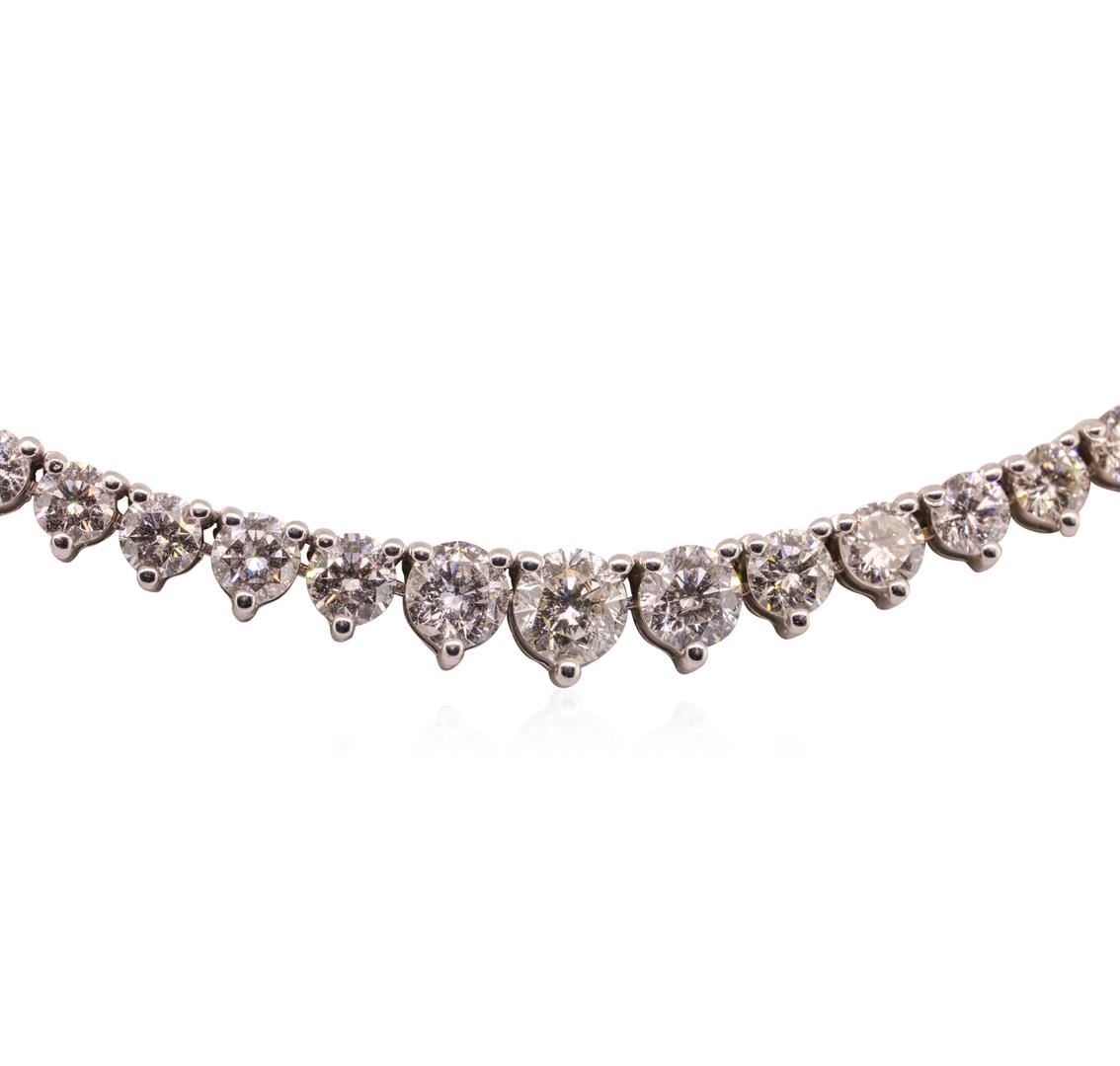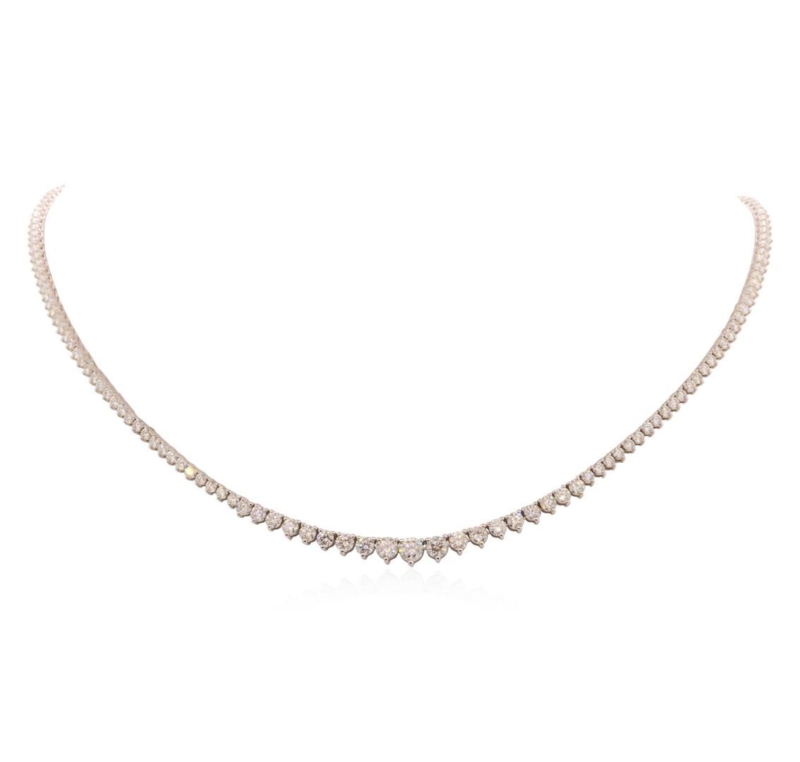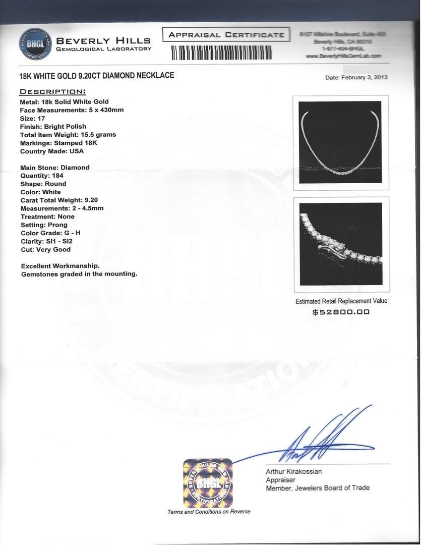 One 18KT solid white gold ladies diamond necklace with a bright polish finish identified with "18K" marking. Condition is good. Measurements: 5x430mm. Size: 17. Total Item Weight: 15.5 grams. Containing: 184 prong set white round cut diamonds 9.20 ctw. Measurements: 2 - 4.5mm. Color Grade: G - H. Clarity: SI1 - SI2. Cut: Very good. BHGL Appraised at $52,800.00.
