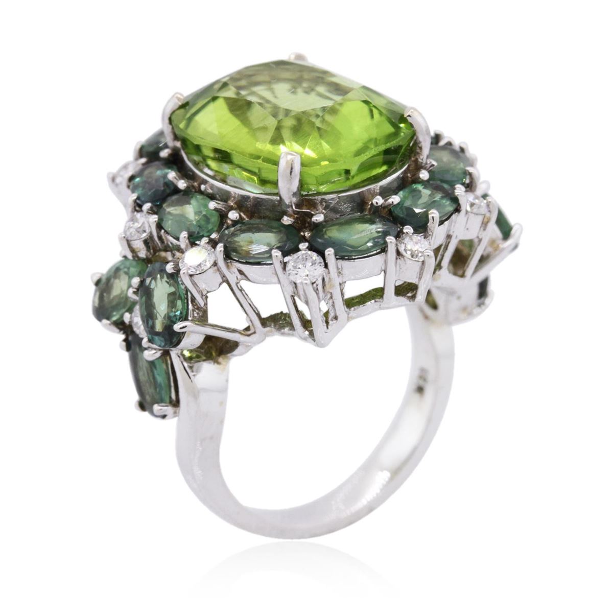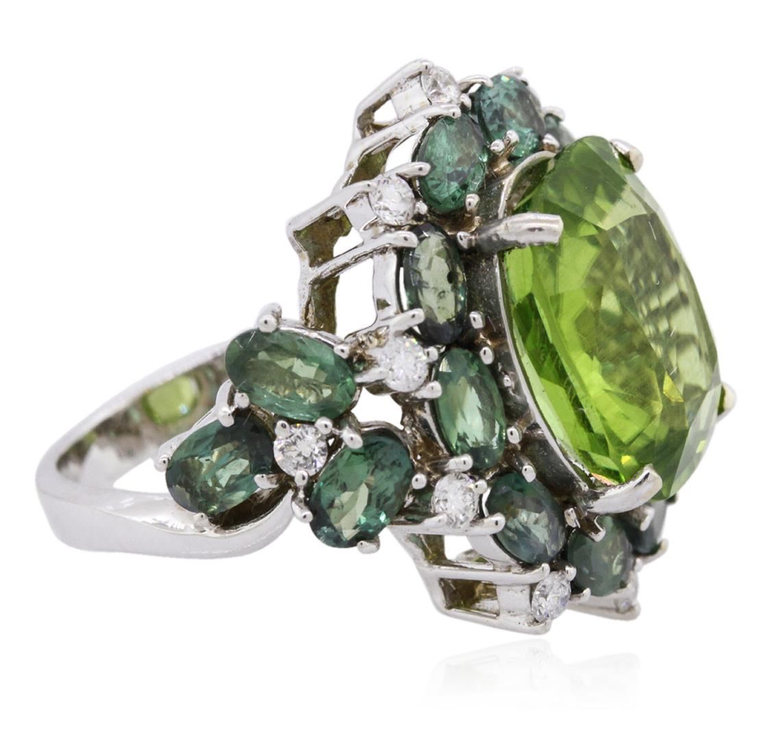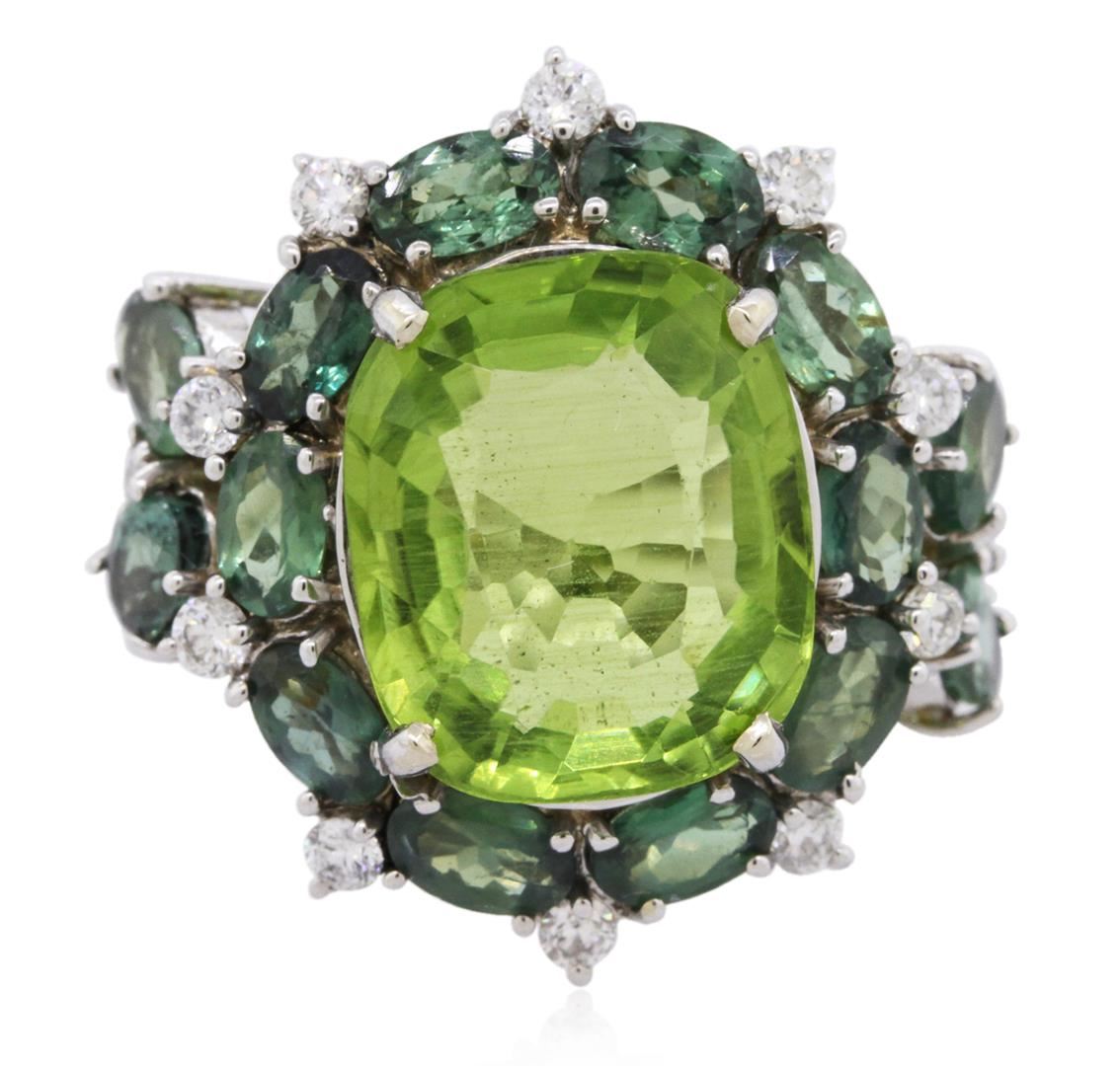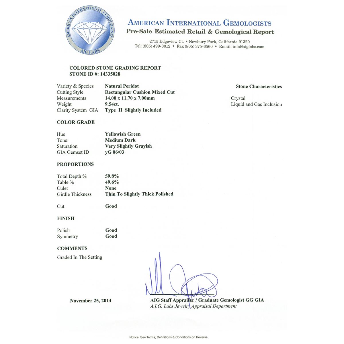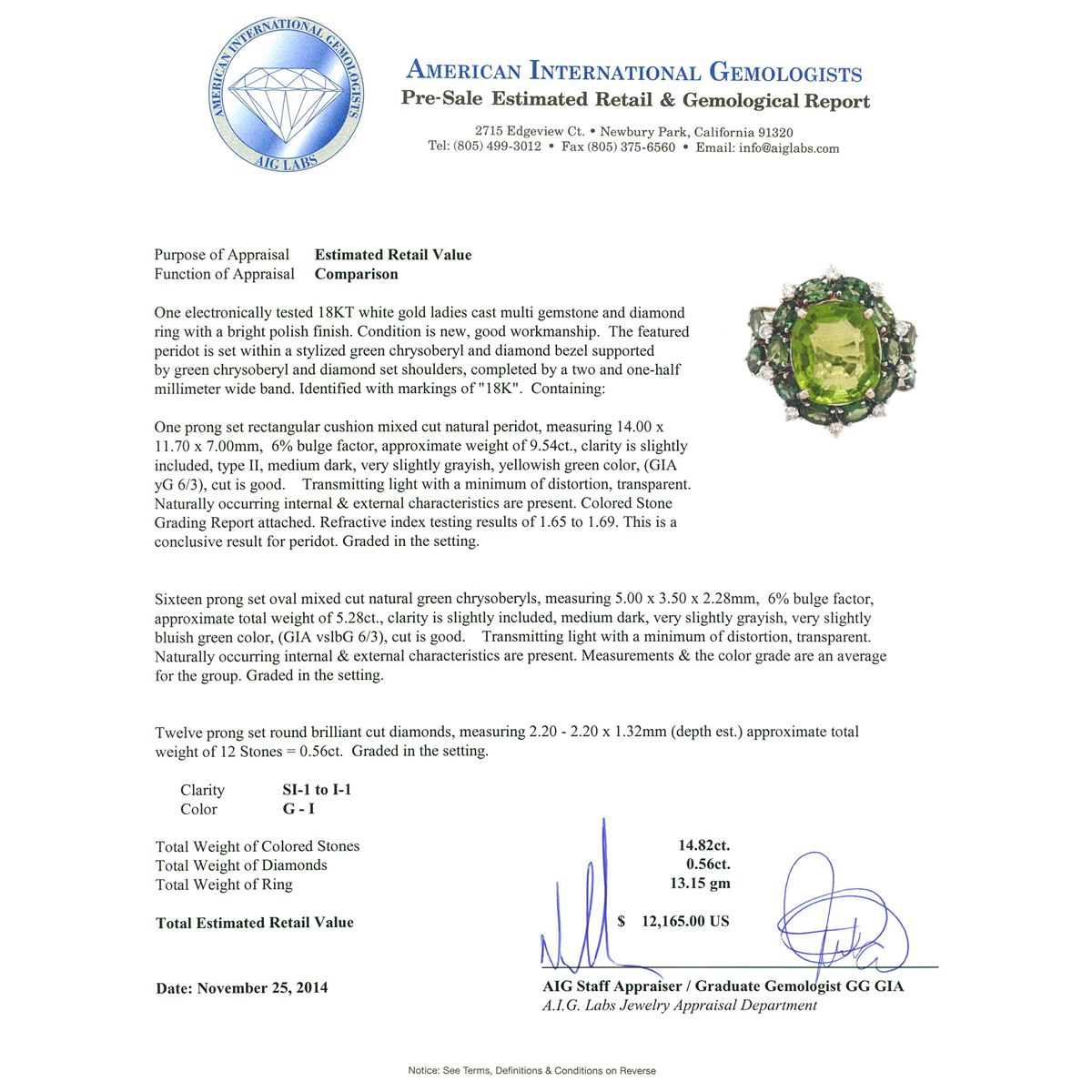 One electronically tested 18KT white gold ladies cast multi gemstone and diamond ring with a bright polish finish. The featured peridot is set within a stylized green chrysoberyl and diamond bezel supported by green chrysoberyl and diamond set shoulders, completed by a two and one-half millimeter wide band. Identified with markings of "18K". Condition is new, good workmanship. Containing: One prong set rectangular cushion mixed cut natural peridot, measuring 14.00 x 11.70 x 7.00mm, 6%. bulge factor, approximate weight of 9.54ct., clarity is slightly included, type II, medium dark, very slightly grayish, yellowish green color, (GIA yG 6/3), cut is good. Transmitting light with a minimum of distortion, transparent. Naturally occurring internal & external characteristics are present. Colored Stone Grading Report attached. Refractive index testing results of 1.65 to 1.69. This is a conclusive result for peridot. Graded in the setting. Sixteen prong set oval mixed cut natural green chrysoberyls, measuring 5.00 x 3.50 x 2.28mm, 6%. bulge factor, approximate total weight of 5.28ct., clarity is slightly included, medium dark, very slightly grayish, very slightly bluish green color, (GIA vslbG 6/3), cut is good. Transmitting light with a minimum of distortion, transparent. Naturally occurring internal & external characteristics are present. Measurements & the color grade are an average for the group. Graded in the setting. Twelve prong set round brilliant cut diamonds, measuring 2.20 - 2.20 x 1.32mm (depth est.) approximate total weight of 12 Stones = 0.56ct. Graded in the setting. Clarity: SI-1 to I-1. Color: G - I. Total Weight of Colored Stones 14.82ct. Total Weight of Diamonds 0.56ct. Total Weight of Ring 13.15 grams. AIG Appraised at $12,165.00.