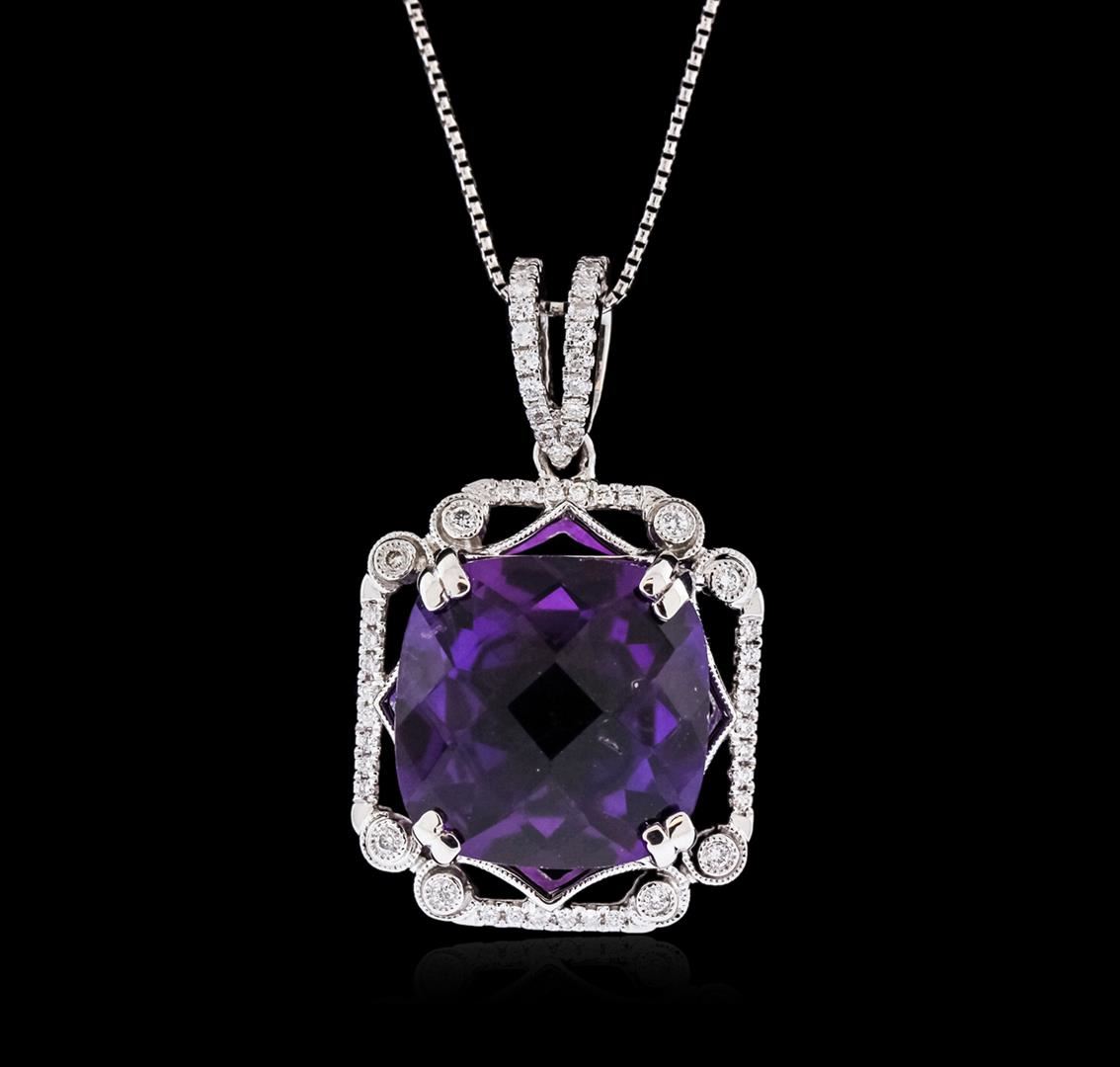 One pendant with chain featuring: 18KT white gold weighing 7.2 grams containing one cushion cut amethyst center weighing 9.79ct and round cut diamonds weighing a total of 0.28ct.