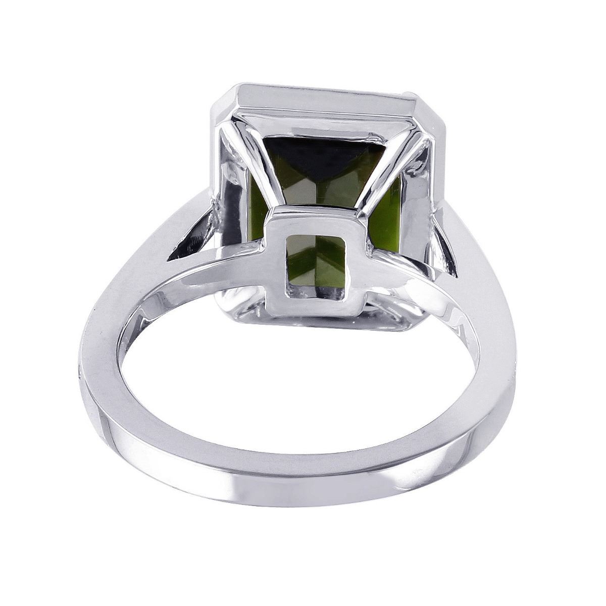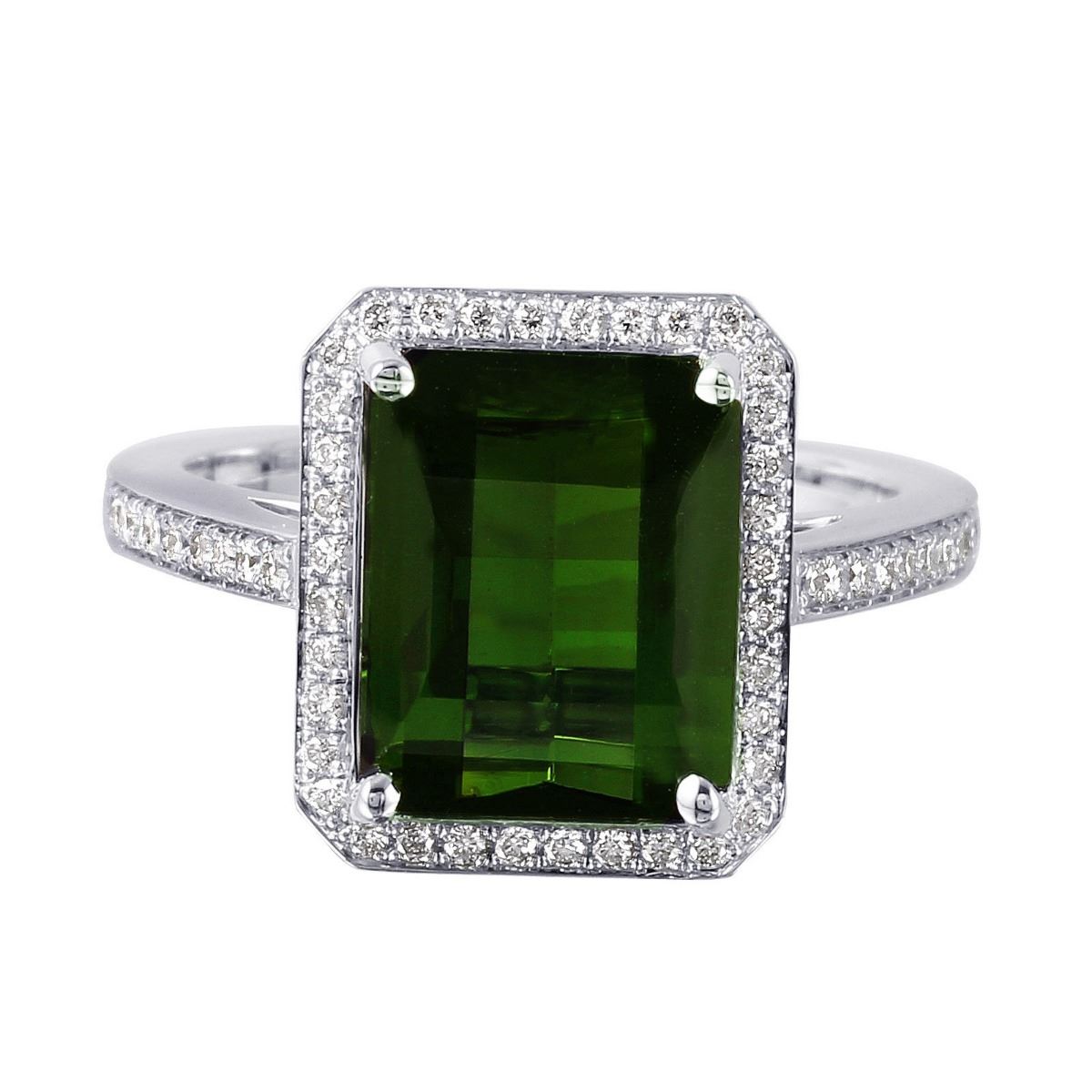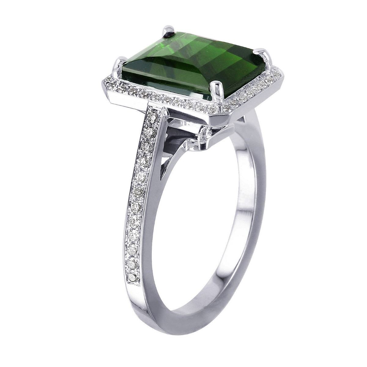 One stamped & tested 18KT white gold ladies custom hand made green tourmaline and diamond ring with a bright polish finish. Size 6. Identified with markings of "18K". Condition is new. Containing: One prong set emerald standard step cut natural green tourmaline, measuring 10.30 x 8.40 x 5.50mm, approximate weight of 4.28ct., clarity is eye clean, type I, medium, moderately strong, green color, cut is excellent. Sixty prong set round brilliant cut diamonds, measuring 1.10 - 1.10 x 0.66mm (depth est.) approximate total weight of 60 Stones = 0.29ct. Clarity: VS-2 to SI-1. Color: F, Cut is Very Good. Approximate Total Weight of Colored Stones 4.28ct. Approximate Total Weight of Diamonds 0.29ct. Total Weight of Ring 5.10gm. The descriptions listed should not be construed as an appraisal. The detail is provided as a guideline for color, clarity, weights and measurements to the best of our ability. We welcome inspections. WE SHIP WORLDWIDE!