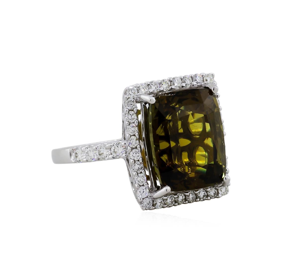 One electronically tested 18KT white gold ladies cast alexandrite and diamond ring with a bright polish finish. The featured alexandrite is set within a diamond bezel supported by diamond set shoulders, completed by a one and one-half millimeter wide band. Trademark is Orianne. Identified with markings of "18K". Condition is new, good workmanship. Containing: One prong set cushion modified step cut natural alexandrite, measuring 12.88 x 10.81 x 8.52mm, exact weight 10.54ct., type Il, clarity is eye clean, medium dark, very slightly brownish, brownish greenish yellow color, (GIA brgY 6/3) to medium dark, very slightly grayish, yellowish brown, (GIA yBr 6/3), cut is good. Transmitting light with no distortion, transparent. GIA Gemological Report attached. Graded loose prior to setting in the GIA Laboratory, Report #2161996979. Alexandrite was discovered in the 1830's near the Tokovaya River in the Ural Mountains of Siberian Russia. It later became the national gemstone of Russia. The name "alexandrite" became official in 1842. Alexandrite is a variety of chrysoberyl. It contains both beryllium and chromium It is the chromium that accounts for the spectacular color change. The color change is the primary qualification for a chrysoberyl to be considered alexandrite. Alexandrite is strongly trichroic. Its color change results in a near-equal transmission of the blue-green and red portions of the spectrum, coupled with strong absorption in the yellow. Today Alexandrite is found in Brazil, India, Madagascar, Myanmar, Russia, Sri Lanka, Tanzania and Zimbabwe. Forty prong set round brilliant cut diamonds approximate total weight of 40 Stones 0.77ct. Graded in the setting. Clarity SI-2 to I-1. Color G-I. Total Weight of Alexandrite is 10.54ct. Total Weight of Diamonds 0.77cts. Total Weight of Ring is 6.08 grams. AIG Appraised at $68,470.00.