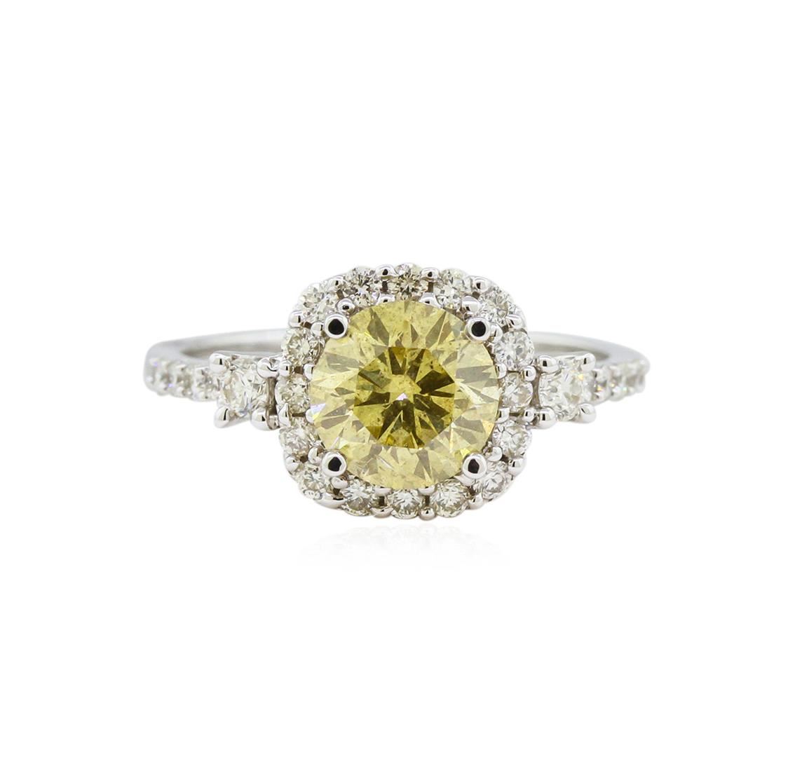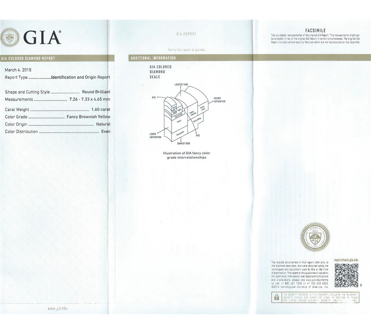 One electronically tested 18KT white gold ladies cast diamond unity ring with bright polish finish. Condition is new, good workmanship. The featured diamond is set within a diamond bezel supported by diamond shoulders, completed by a one and one-half milimeter wide band. Trademark is Orianne. Identified with markings of "18K". Containing: one prong set round brilliant cut diamond, measuring 7.26 - 7.33 x 4.65mm exact weight 1.60ct. GIA colored diamond report attached. Graded loose for color prior to setting in the GIA labratory, Report #2161993187. Graded in setting. Carlity SI-2, color Fancy brownish yellow. Twenty-six prong set round brilliant cut diamonds approximate total weight of 26 stones = 0.52ct. Graded in the setting. AIG Appraised at $13,395.00.