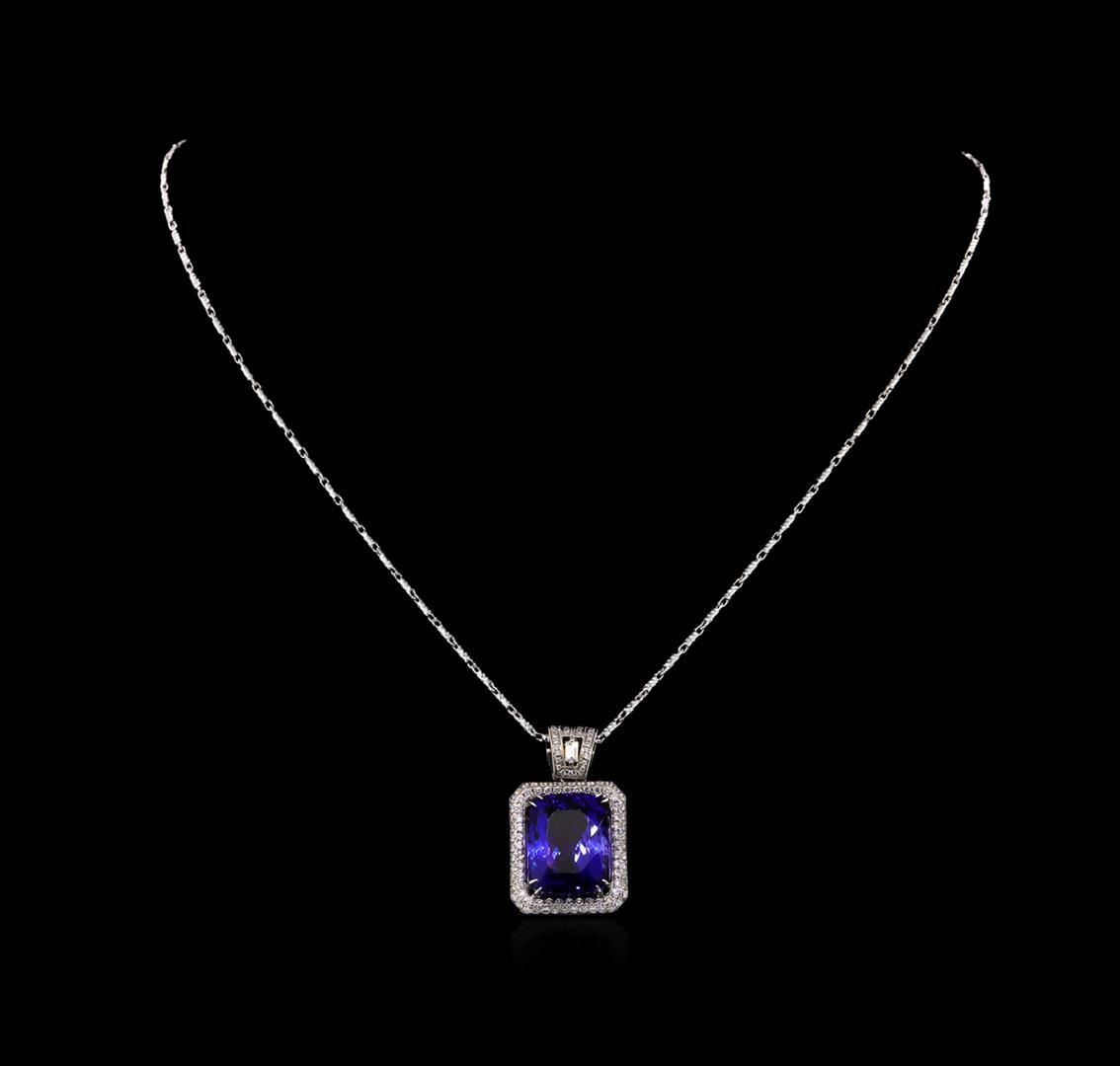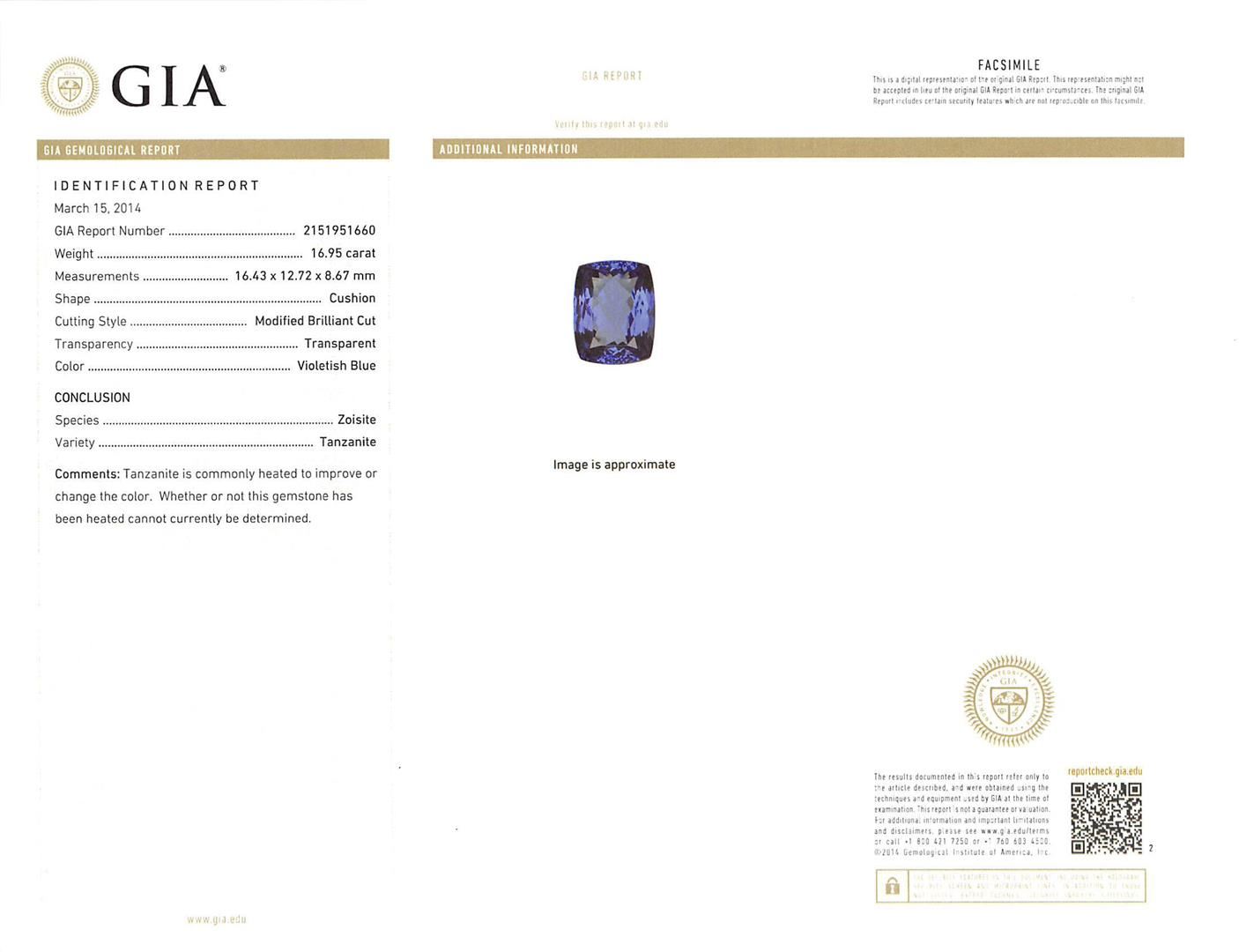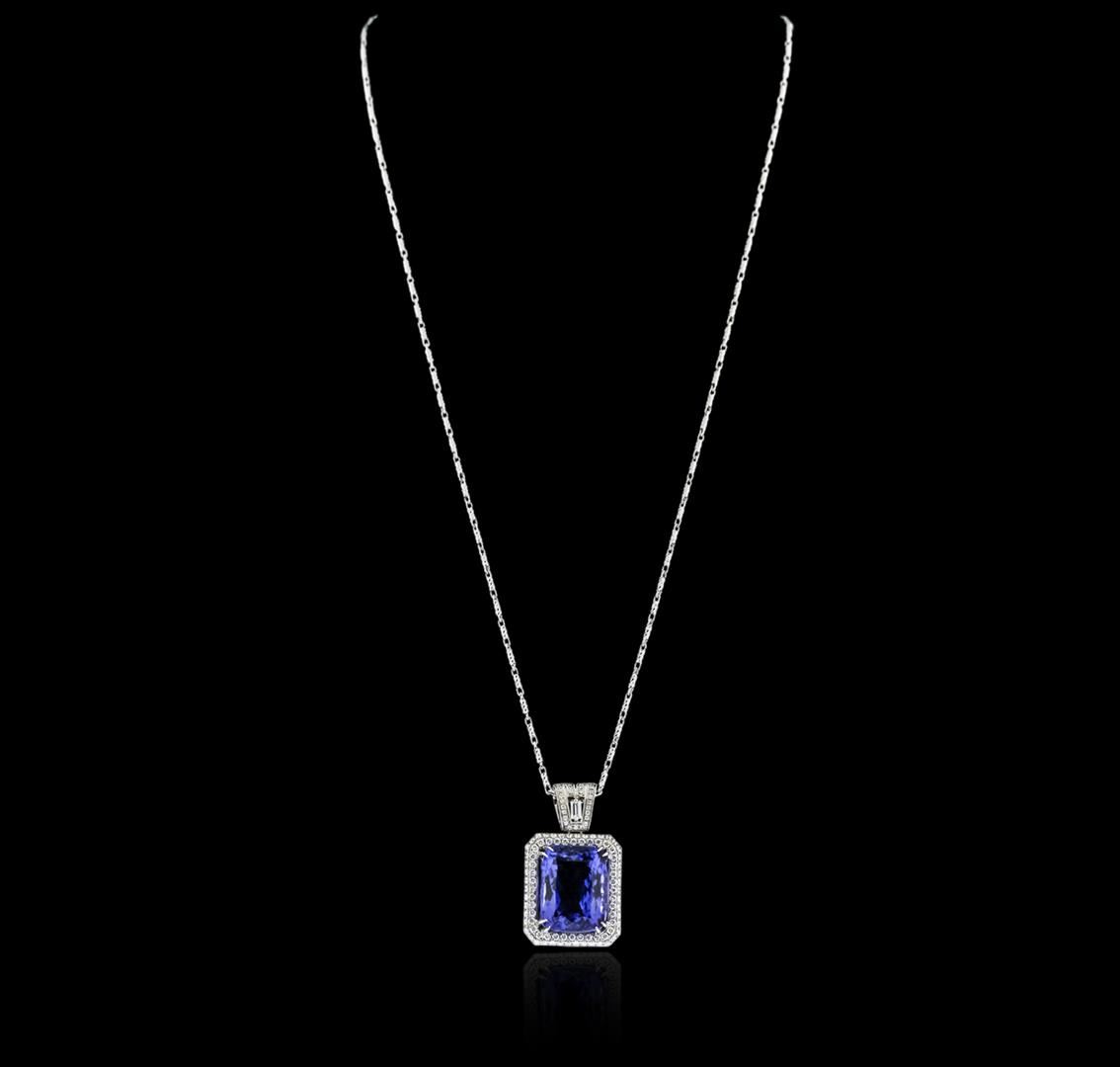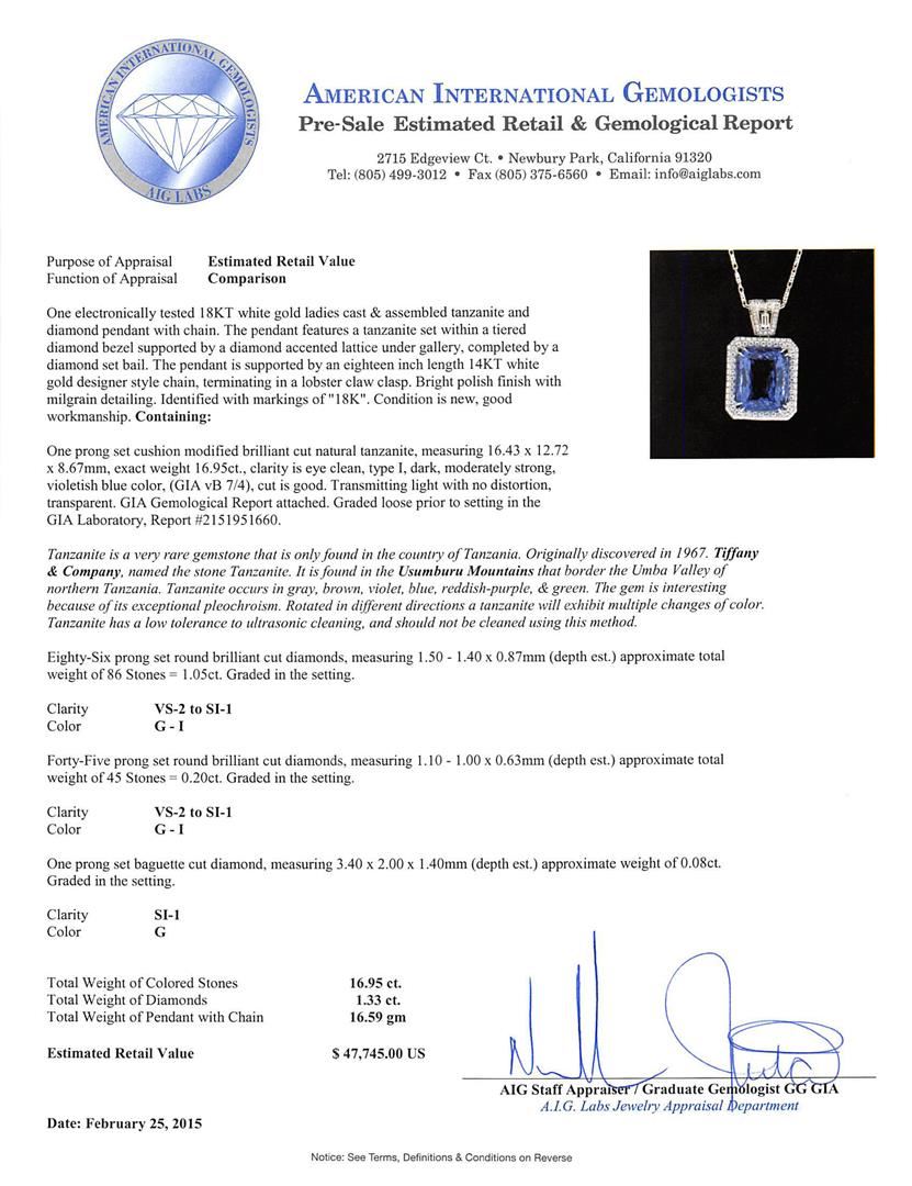 One electronically tested 18KT white gold ladies cast & assembled tanzanite and diamond pendant with chain. The pendant features a tanzanite set within a tiered diamond bezel supported by a diamond accented latice under gallery, completed by a diamond set bail. The pendant is supported by an eighteen inch length 14KT white gold designer style chain, terminating in a lobster claw clasp. Bright polish finish with milgrain detailing. Identified with markings of "18K". Condition is new, good workmanship. Containing: One prong set cushion modified brilliant cut natural tanzanite, measuring 16.43 x 12.72 x 8.67mm, exact weight 16.95ct., clarity is eye clean, type I, dark, moderately strong, violetish blue color, (GIA vB 7/4), cut is good. Transmitting light with no distortion, transparent. GIA Gemological Report attached. Graded loose prior to setting in the GIA Laboratory, Report #2151951660.Tanzanite is a very rare gemstone that is only found in the country of Tanzania. Originally discovered in 1967. Tiffany & Company, named the stone Tanzanite. It is found in the Usumburu Mountains that border the Umba Valley of northern Tanzania. Tanzanite occurs in gray, brown, violet, blue, reddish-purple, & green. The gem is interesting because of its exceptional pleochroism. Rotated in different directions a tanzanite will exhibit multiple changes of color. Tanzanite has a low tolerance to ultrasonic cleaning, and should not be cleaned using this method. Eighty-Six prong set round brilliant cut diamonds, measuring 1.50 - 1.40 x 0.87mm (depth est.) approximate total weight of 86 Stones = 1.05ct. Graded in the setting. Clarity: VS-2 to SI-1. Color: G - I Forty-Five prong set round brilliant cut diamonds, measuring 1.10 - 1.00 x 0.63mm (depth est.) approximate total weight of 45 Stones = 0.20ct. Graded in the setting. Clarity: VS-2 to SI-1. Color: G - I One prong set baguette cut diamond, measuring 3.40 x 2.00 x 1.40mm (depth est.) approximate weight of 0.08ct. Graded in the setting. Clarity: SI-1. Color: G. Total Weight of Colored Stones 16.95ct. Total Weight of Diamonds 1.33ct. Total Weight of Pendant With Chain 16.59 grams. AIG Appraised at $47,745.00.