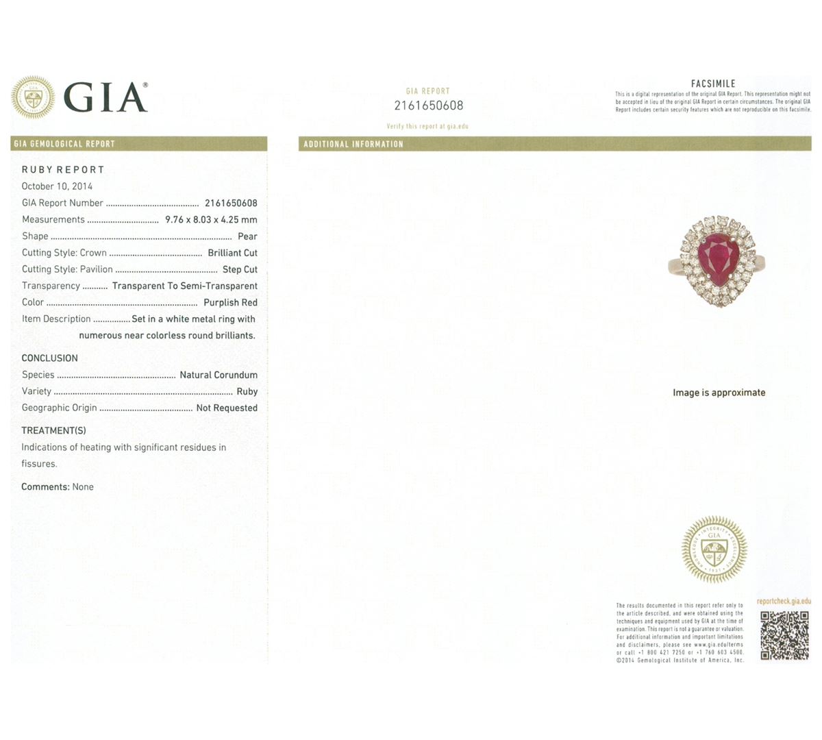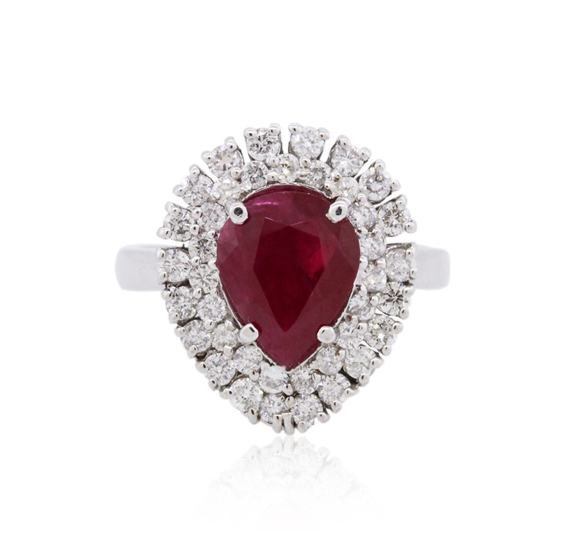 One electronically tested 18KT white gold ladies cast ruby and diamond ring with a bright polish finish. The featured ruby is set within two tiered diamond bezels, completed by a two and one-half millimeter wide band. Identified with markings of "18K". Condition is new, good workmanship. Containing: One prong set pear mixed cut natural ruby, measuring 9.76 x 8.03 x 4.25mm, 6% bulge factor, approximate weight of 2.82ct., clarity is heavily included, type II, dark, very slightly brownish, slightly purplish red color, (GIA slpR 7/3), cut is good. Transmitting light somewhat diffusely, translucent. Naturally occurring internal & external characteristics are present. Indications of heating with significant residues in fissures. GIA Ruby Report attached. Graded in the GIA Laboratory, Report #2161650608.Thirty-Nine prong set round brilliant cut diamonds, measuring 1.90 - 1.80 x 1.11mm (depth est.) approximate total weight of 39 Stones = 1.00ct. Graded in the setting. Clarity: SI-2 to I-2. Color: G - I. Total Weight of Colored Stones 2.82ct. Total Weight of Diamonds 1.00ct. Total Weight of Ring 6.86 grams. AIG Appraised at $4,715.00.