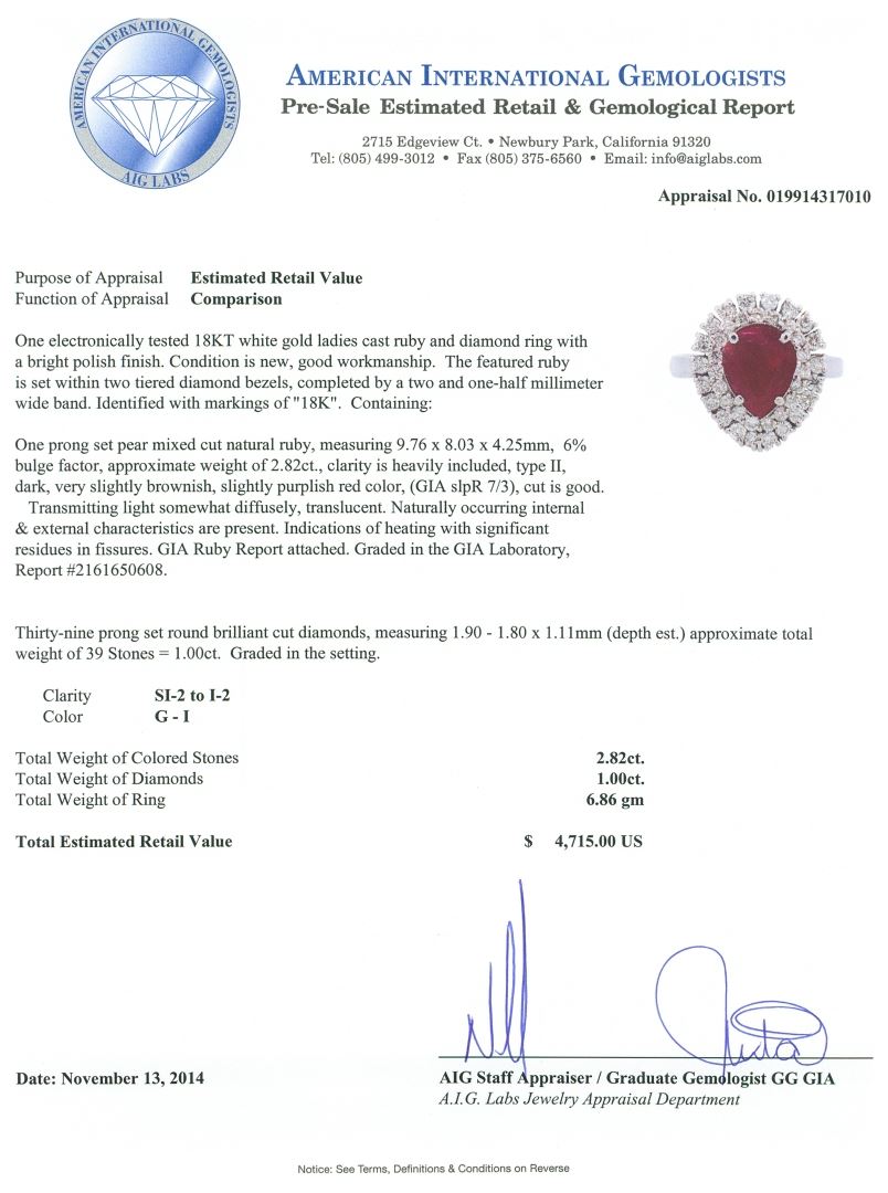 One electronically tested 18KT white gold ladies cast ruby and diamond ring with a bright polish finish. The featured ruby is set within two tiered diamond bezels, completed by a two and one-half millimeter wide band. Identified with markings of "18K". Condition is new, good workmanship. Containing: One prong set pear mixed cut natural ruby, measuring 9.76 x 8.03 x 4.25mm, 6% bulge factor, approximate weight of 2.82ct., clarity is heavily included, type II, dark, very slightly brownish, slightly purplish red color, (GIA slpR 7/3), cut is good. Transmitting light somewhat diffusely, translucent. Naturally occurring internal & external characteristics are present. Indications of heating with significant residues in fissures. GIA Ruby Report attached. Graded in the GIA Laboratory, Report #2161650608.Thirty-Nine prong set round brilliant cut diamonds, measuring 1.90 - 1.80 x 1.11mm (depth est.) approximate total weight of 39 Stones = 1.00ct. Graded in the setting. Clarity: SI-2 to I-2. Color: G - I. Total Weight of Colored Stones 2.82ct. Total Weight of Diamonds 1.00ct. Total Weight of Ring 6.86 grams. AIG Appraised at $4,715.00.