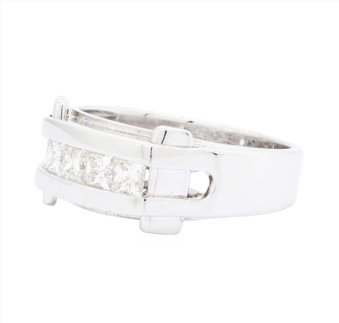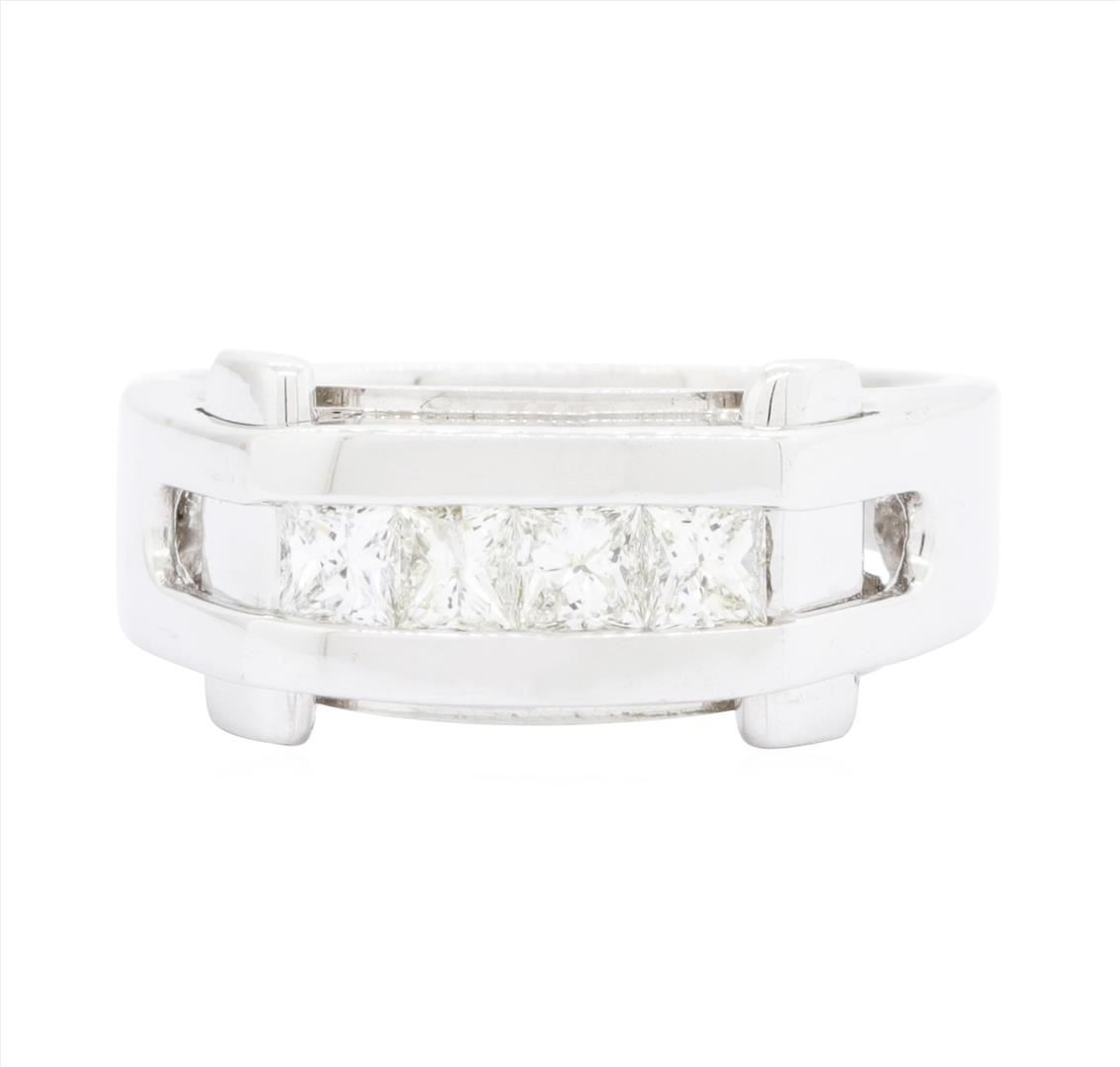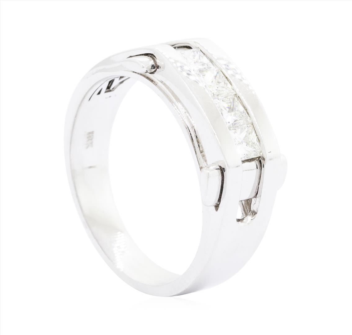 One electronically tested 18KT white gold man's cast ring with a straight line channel with a bright polish finish. The featured men's ring has a shank measuring 4.30 millimeters wide. Identified with markings of '18K'. Condition is new, good workmanship. Containing: Four channel set princess cut diamonds, measuring 3.50 x 3.40 x 2.55mm (depth est.) approximate total weight of 4 Stones = 1.00ct. Graded in the setting. Color H - I Clarity SI-1 to I-1 Cut Very Good. Total Weight of Diamonds 1.00ct.. Total Weight of Ring 9.70gm GAS Appraised.