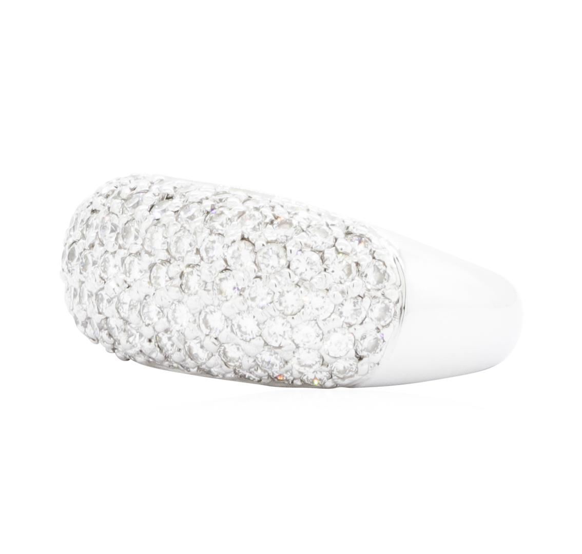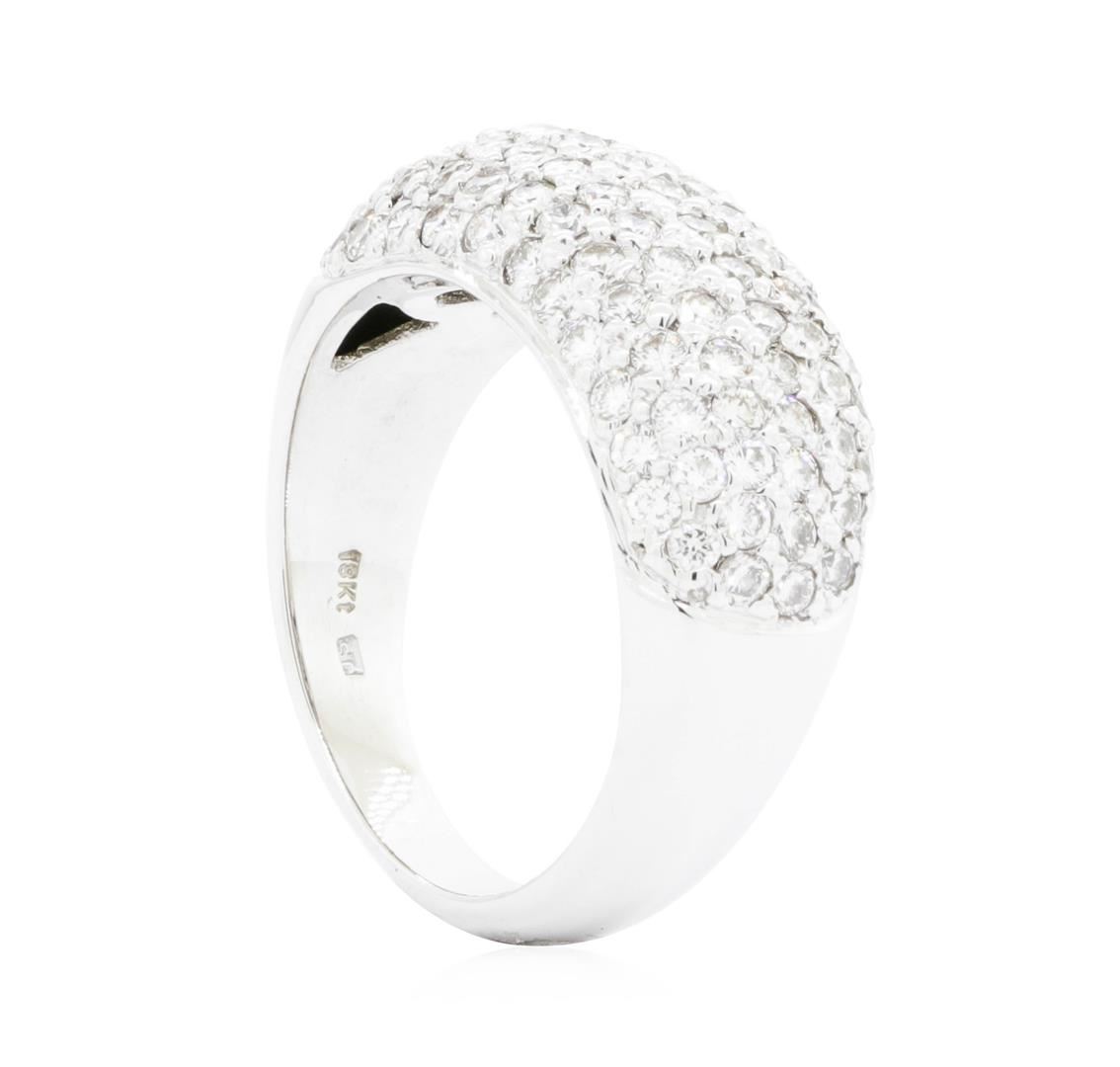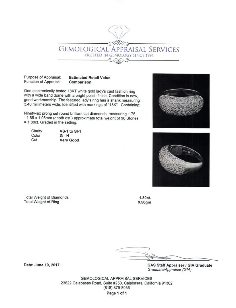 One electronically tested 18KT white gold lady's cast fashion ring with a wide band dome with a bright polish finish. The featured lady's ring has a shank measuring 3.40 millimeters wide. Identified with markings of '18K'. Condition is new, good workmanship. Containing: Ninety-Six prong set round brilliant cut diamonds, measuring 1.75 - 1.65 x 1.05mm (depth est.) approximate total weight of 96 Stones = 1.80ct. Graded in the setting. Color G - H Clarity VS-1 to SI-1 Cut Very Good. Total Weight of Diamonds 1.80ct.. Total Weight of Ring 9.50gm GAS Appraised.