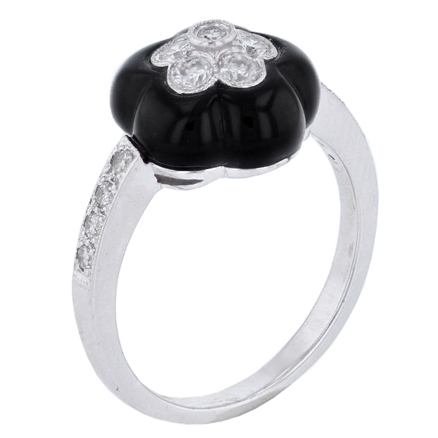 One 18KT White Gold Onyx and Diamond Ring. One electronically tested 18KT white gold ladies cast floral inspired diamond & onyx ring. The ring features a floral inspired diamond cluster, set within an onyx floret bezel. supported by a diamond set shoulders, completed by a two millimeter wide band. Bright polish finish with milgrain detailing throughout. Identified with markings of "750". Condition is new. Containing: Fourteen bead & bezel set round brilliant cut diamonds, measuring 2.40 - 1.60 x 1.20mm (depth est.) approximate total weight of 14 Stones = 0.40ct. Graded in the setting. Clarity is I-1 to I-2. Color is F - H. Total Weight of Diamonds 0.40 ct. Total Weight of Ring 4.29 gm.