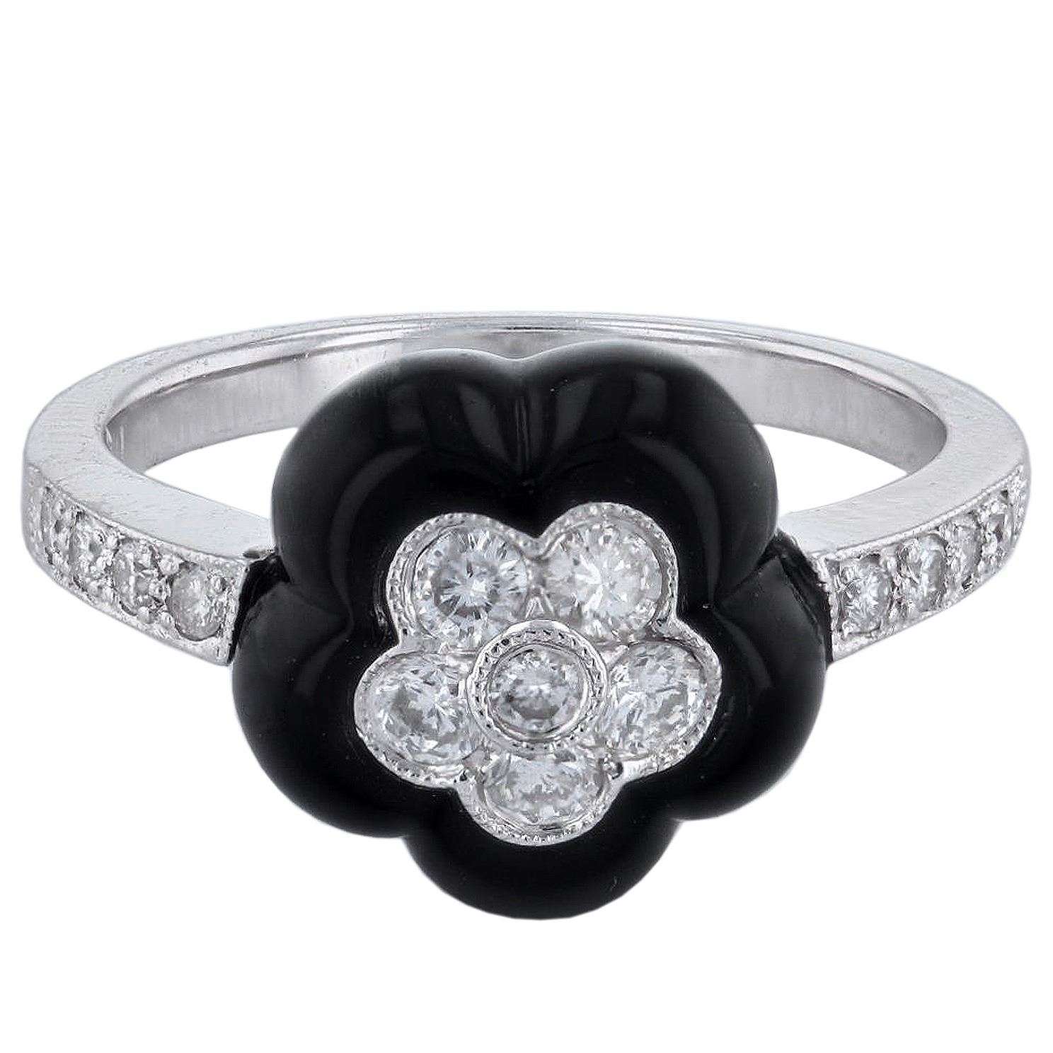 One 18KT White Gold Onyx and Diamond Ring. One electronically tested 18KT white gold ladies cast floral inspired diamond & onyx ring. The ring features a floral inspired diamond cluster, set within an onyx floret bezel. supported by a diamond set shoulders, completed by a two millimeter wide band. Bright polish finish with milgrain detailing throughout. Identified with markings of "750". Condition is new. Containing: Fourteen bead & bezel set round brilliant cut diamonds, measuring 2.40 - 1.60 x 1.20mm (depth est.) approximate total weight of 14 Stones = 0.40ct. Graded in the setting. Clarity is I-1 to I-2. Color is F - H. Total Weight of Diamonds 0.40 ct. Total Weight of Ring 4.29 gm.