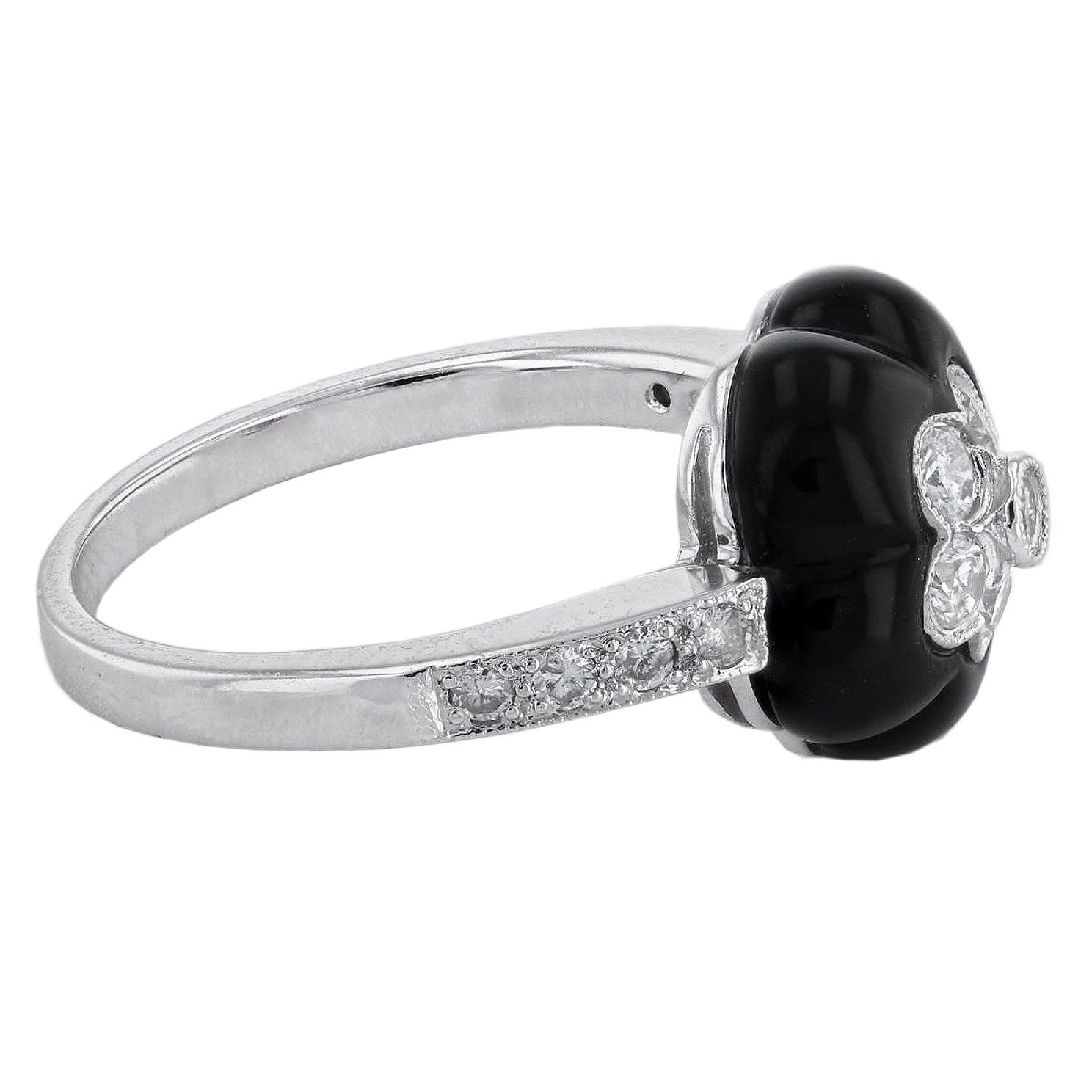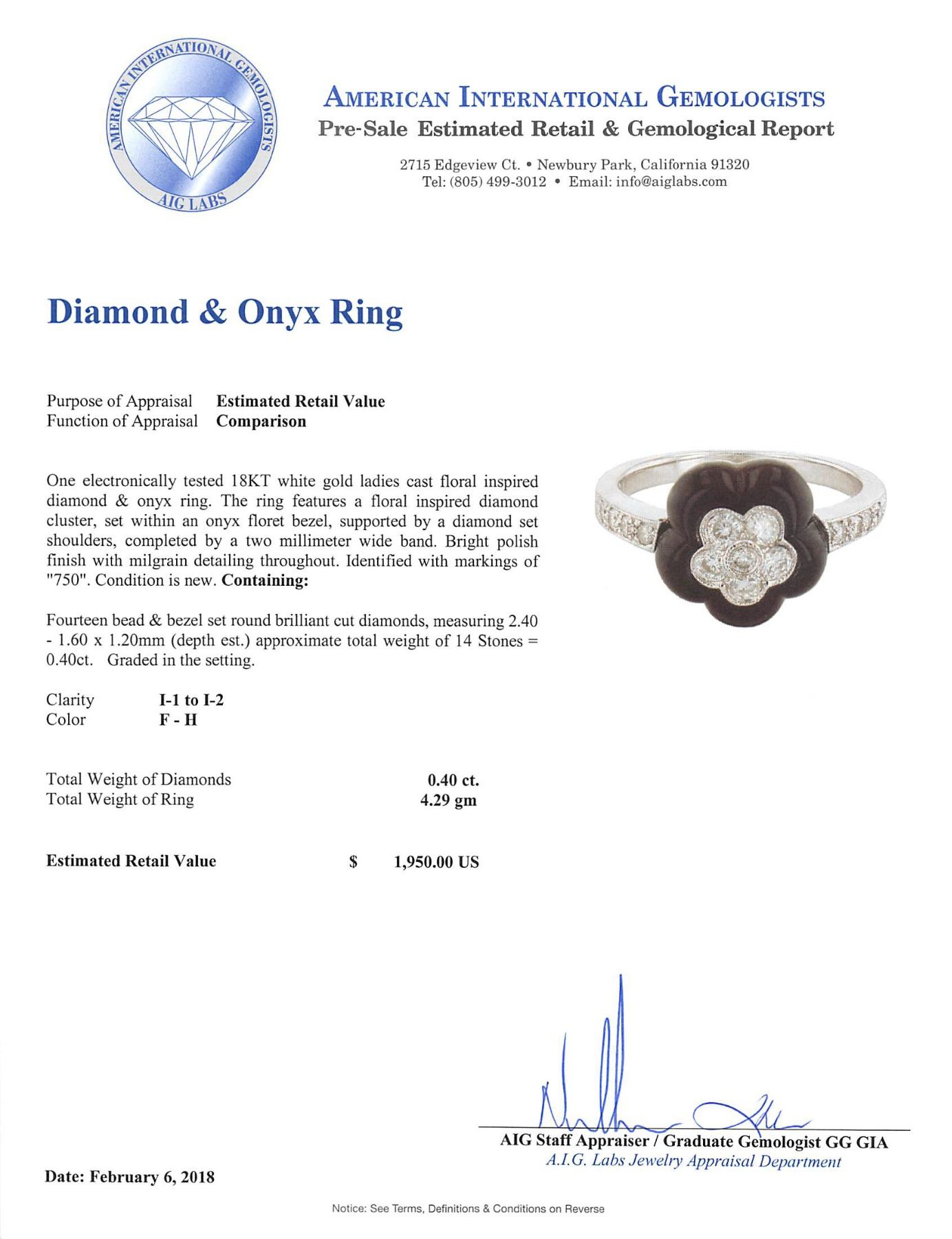 One 18KT White Gold Onyx and Diamond Ring. One electronically tested 18KT white gold ladies cast floral inspired diamond & onyx ring. The ring features a floral inspired diamond cluster, set within an onyx floret bezel. supported by a diamond set shoulders, completed by a two millimeter wide band. Bright polish finish with milgrain detailing throughout. Identified with markings of "750". Condition is new. Containing: Fourteen bead & bezel set round brilliant cut diamonds, measuring 2.40 - 1.60 x 1.20mm (depth est.) approximate total weight of 14 Stones = 0.40ct. Graded in the setting. Clarity is I-1 to I-2. Color is F - H. Total Weight of Diamonds 0.40 ct. Total Weight of Ring 4.29 gm.