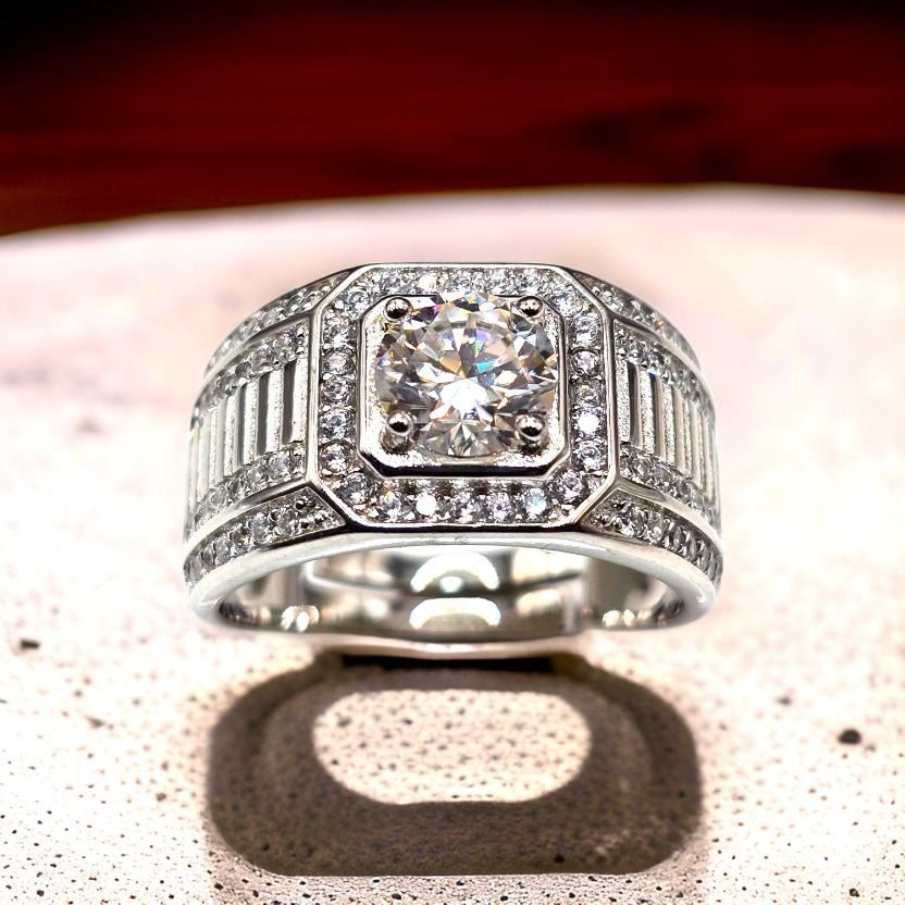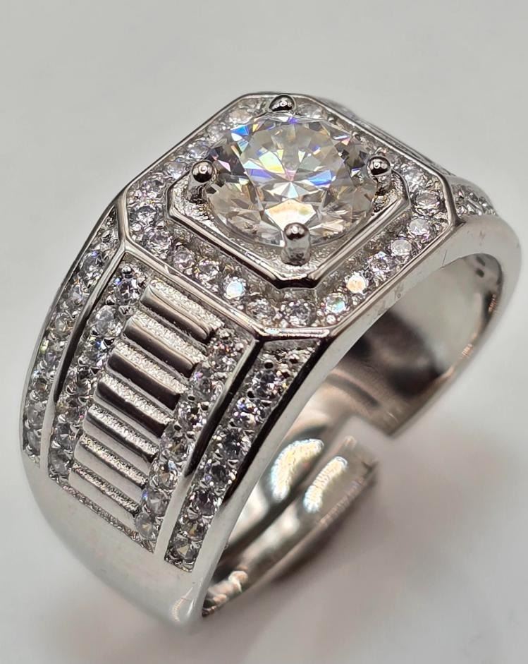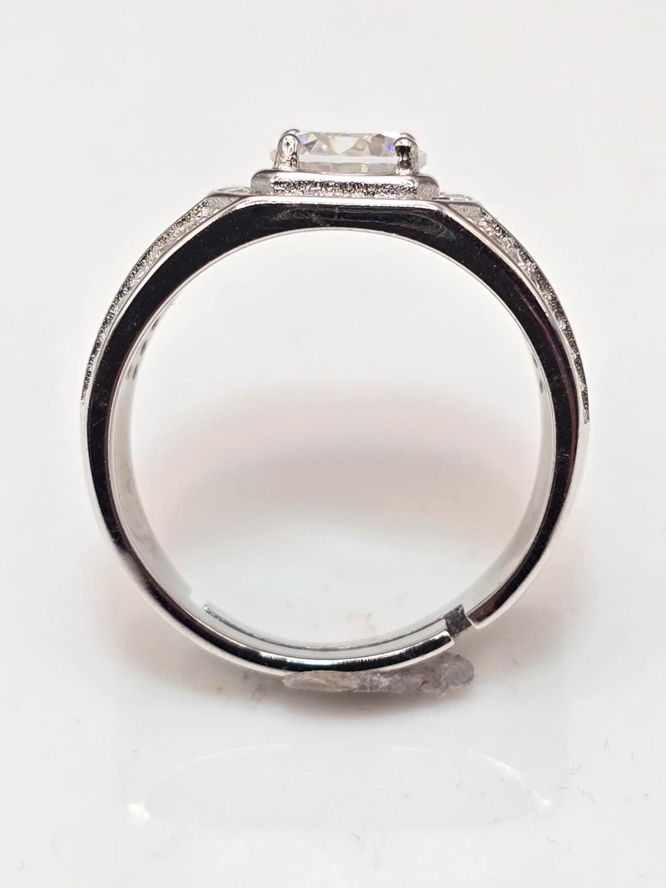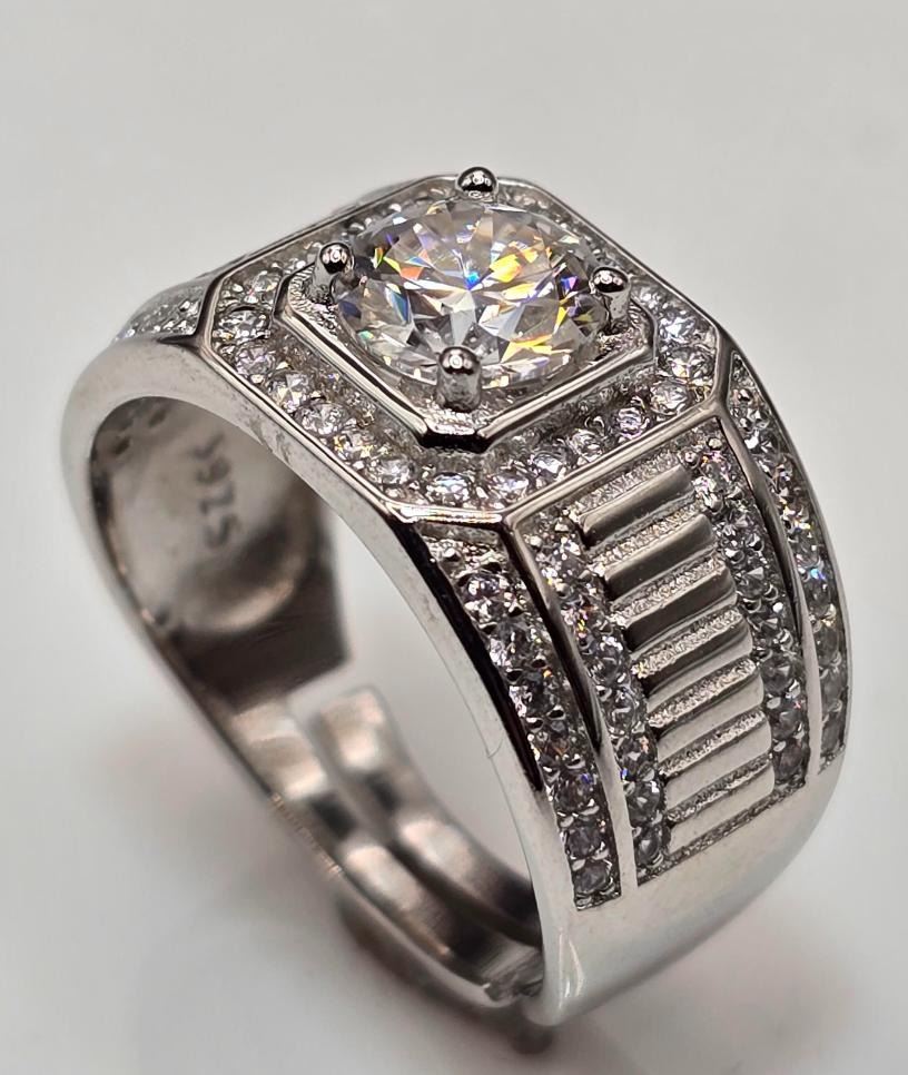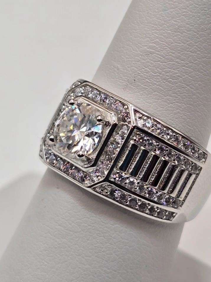 This 18 Kt White Gold Plate Sparkling 1 Ct Lab Simulated Diamond Centerstone is a VVs1 Brilliant Round 6.5 mm. Cut. The Color is White E-F. It is near flawless and bursting out with a full spectrum of colors. This Ring is complimented with 22 individual 1.2 mm. faceted clear accent stones. All 23 Gems Are Mounted in 18 Kt Tri-Layered White Gold Over Solid .925 Solid Sterling. With the Mohs measurement of hardness between 9.25 to 9.5 this lab simulated diamond will test positive for a diamond on almost any diamond tester. In addition, with a refractive index of 2.65-2.69, this lab diamond exhibits more brilliance than a diamond thanks to a dispersion that is 2.4 times higher than a natural diamond. It is also Conflict Free and Earth Friendly. This ring is versatile as it is size adjustable between men’s size 7 to men’s size 9. The Total Gram Wt. is 5 Grams.