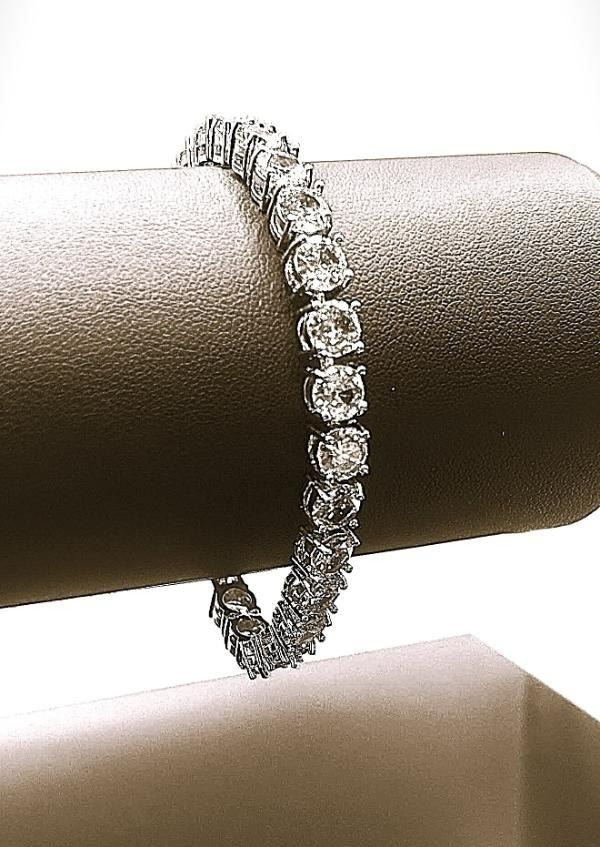 Stunning 18 Kt White Gold Plated Lab Simulated 26 Cwt. White Diamond Bracelet These 26 Gemstones are Brilliant Round Cuts Measuring 6.5 mm. They are Mounted In 18 Kt White Gold Overlay. Approx 7 " long. The total gram wt. is a healthy 18.5 total grams. This Bracelet is Gorgeous!!!